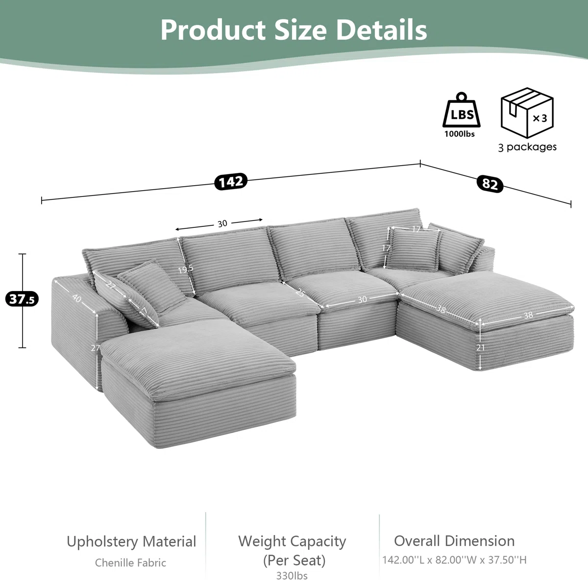 Redefine your living space with the 142" U-Shaped Modular Sectional Sofa with Ottomans — a luxurious blend of modern design, ultimate comfort, and unmatched convenience. Crafted from premium striped chenille upholstery, this massive 6-seater sectional offers an ultra-soft, cloud-like lounging experience. Its modular design includes two multifunctional ottomans that adapt effortlessly to any space, transforming your living room into a hub of relaxation, entertainment, and style.