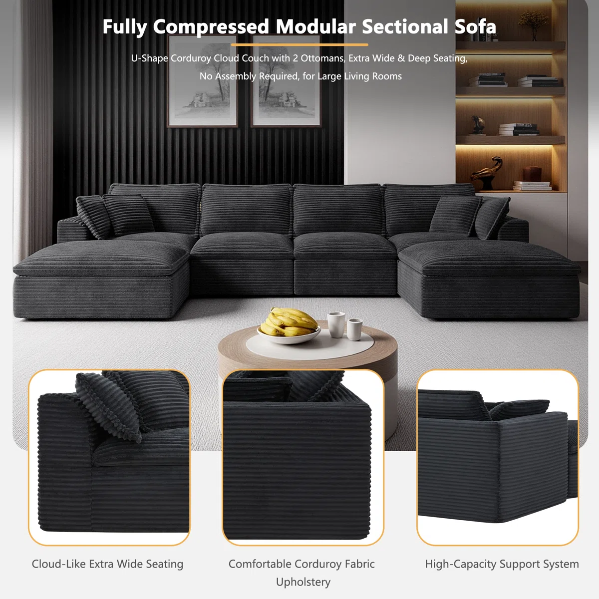 This sofa ships fully compressed for space-saving delivery and expands instantly to full size, no assembly or tools required. With extra-wide 30" deep seats, supportive pocket springs, and high-resilience foam cushions, it’s designed for full-body comfort and long-lasting durability. Ideal for families, entertainers, and design lovers, this U-shaped sectional combines elegance, flexibility, and superior craftsmanship in one statement piece.