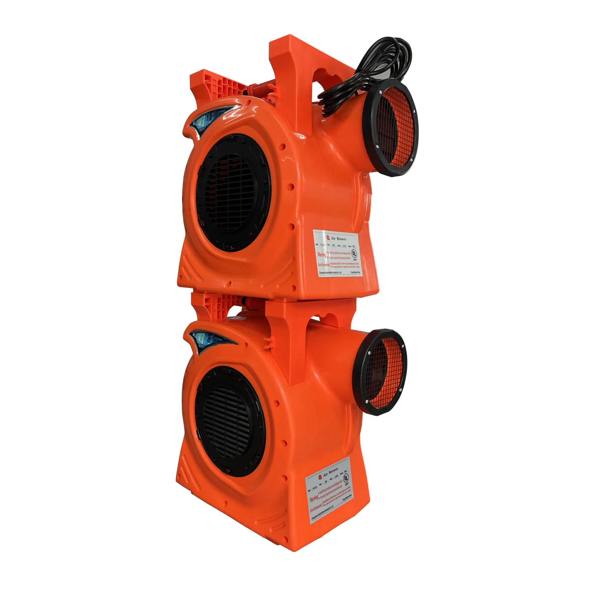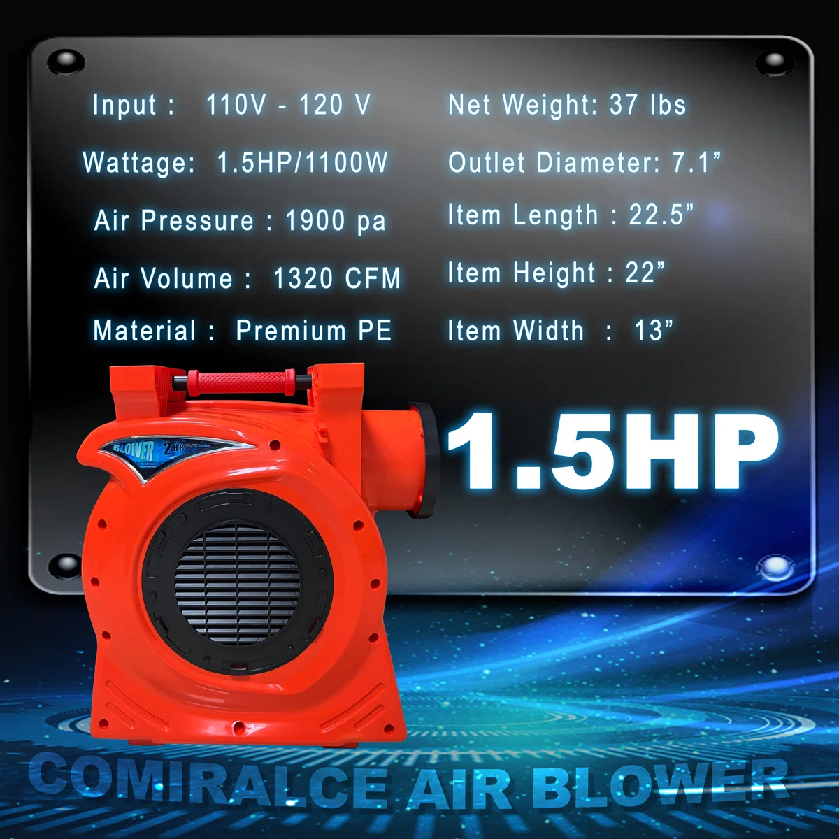 This heavy-duty 1.5 HP air blower delivers powerful airflow for quickly inflating bounce houses, slides, and other large inflatables. Built with a durable polypropylene housing, it provides stable wind output and long-term reliability. The unit includes a 30-foot, 14-gauge power cord for flexible placement and a built-in handle for easy carrying. Ideal for both home and commercial use.