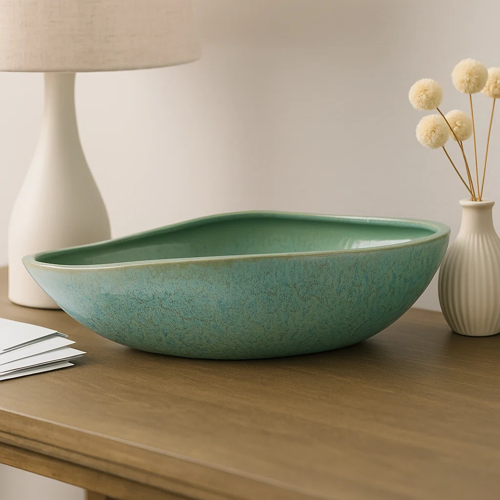 Add artistic charm and modern elegance to any space with this 18" Green Glazed Earthenware Decorative Bowl. Crafted from high-quality earthenware and finished with a rich green glaze, this oversized bowl makes a bold statement on dining tables, coffee tables, entryway consoles, or office desks. Its handcrafted texture and smooth glazed surface create a beautiful balance between organic artistry and contemporary style. Perfect as a standalone centerpiece or paired with decorative fillers, this bowl enhances your décor with depth, color, and visual interest. Its sturdy ceramic build ensures durability, while the wide 18-inch size makes it ideal for larger surfaces that need a standout accent piece. Whether for home styling or office décor, this modern bowl brings sophistication to any environment.