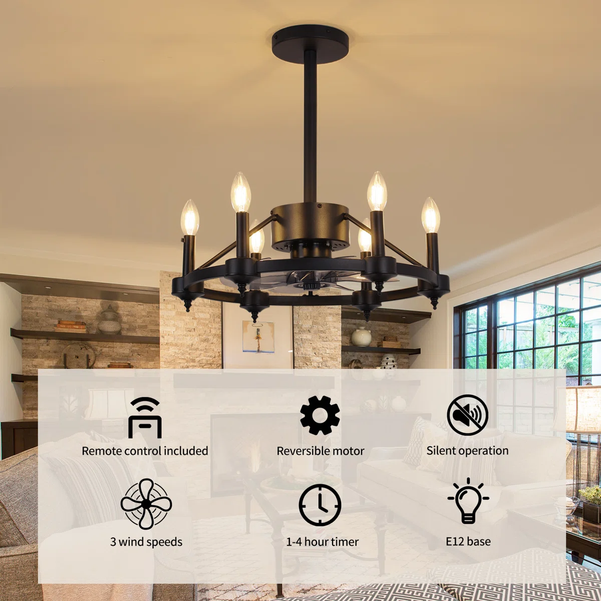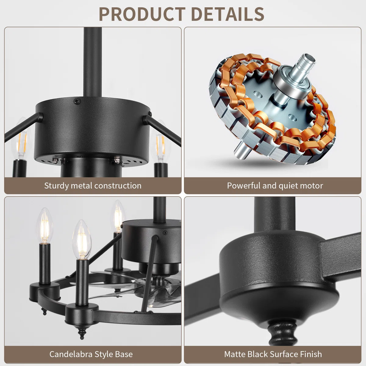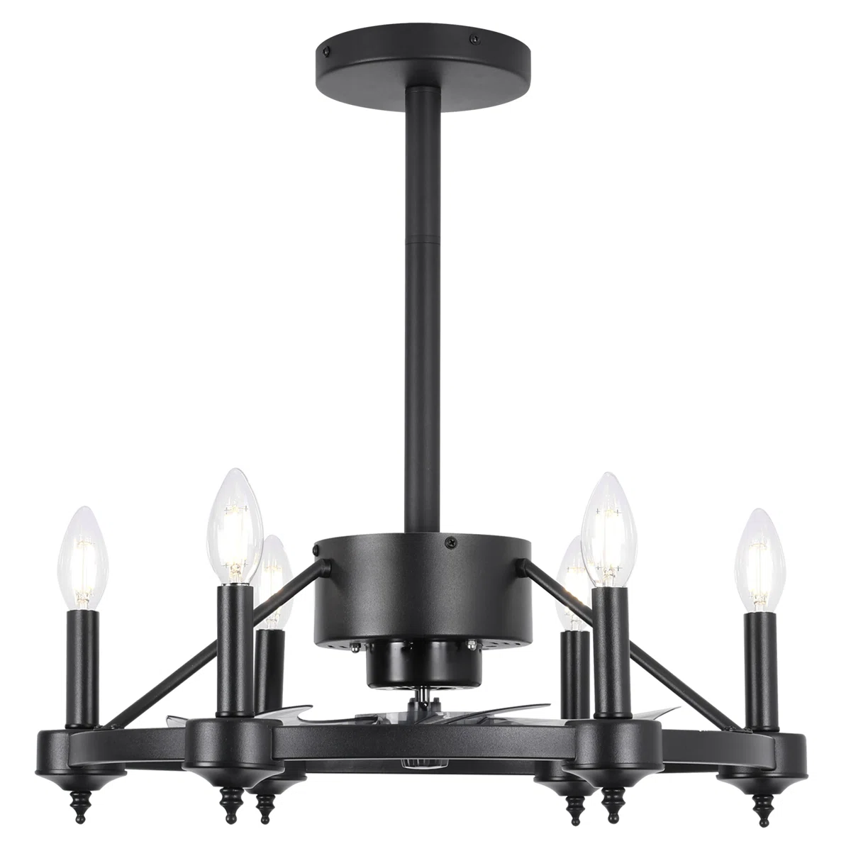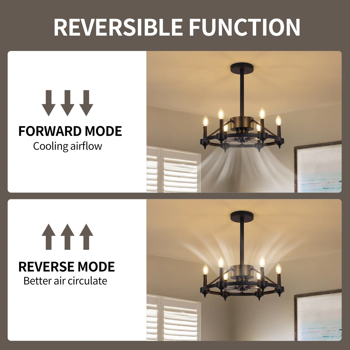 The 17 Stories 20.5'' Reversible Fandelier Ceiling Fan combines elegant chandelier lighting with functional airflow. Featuring a matte black wagon wheel design with six faux candleholder lights, it adds a sophisticated touch to living rooms, dining rooms, or kitchens. The whisper-quiet, high-efficiency DC motor provides reversible airflow for year-round comfort, while independent fan and light control via remote allows precise adjustments. Adjustable downrods and a sleek design make installation straightforward, offering both style and functionality in one compact fixture.