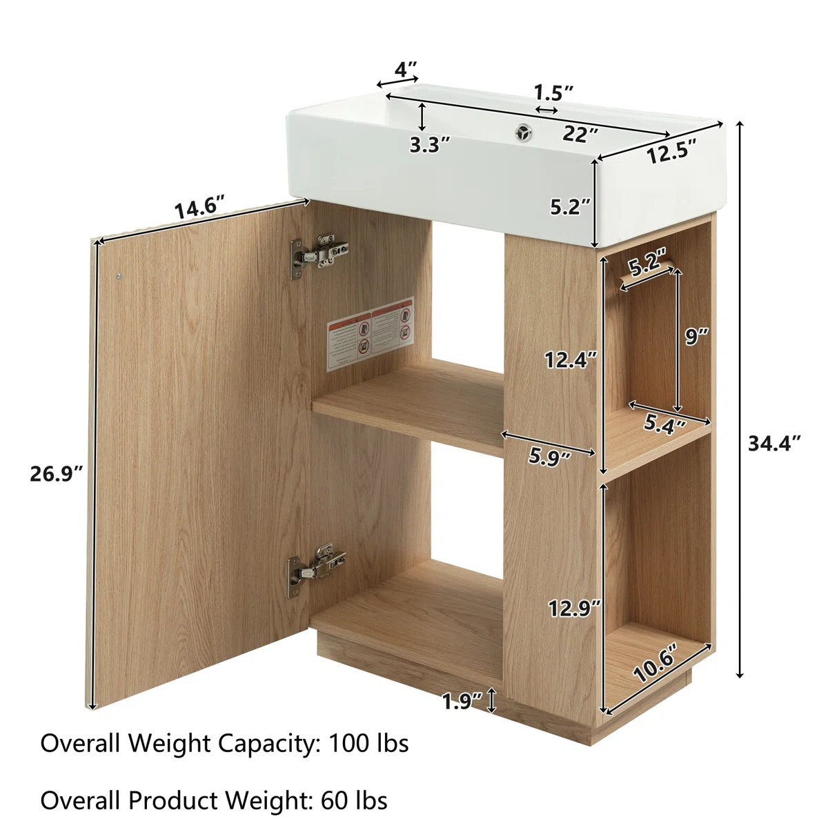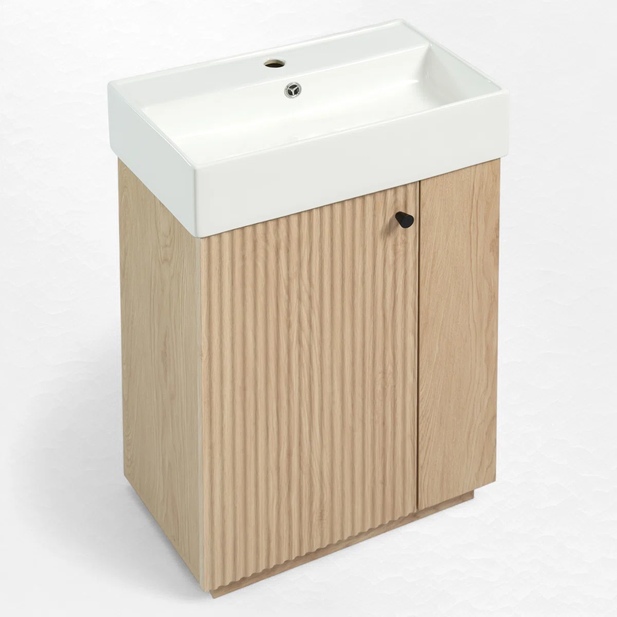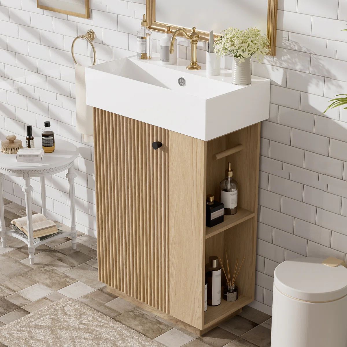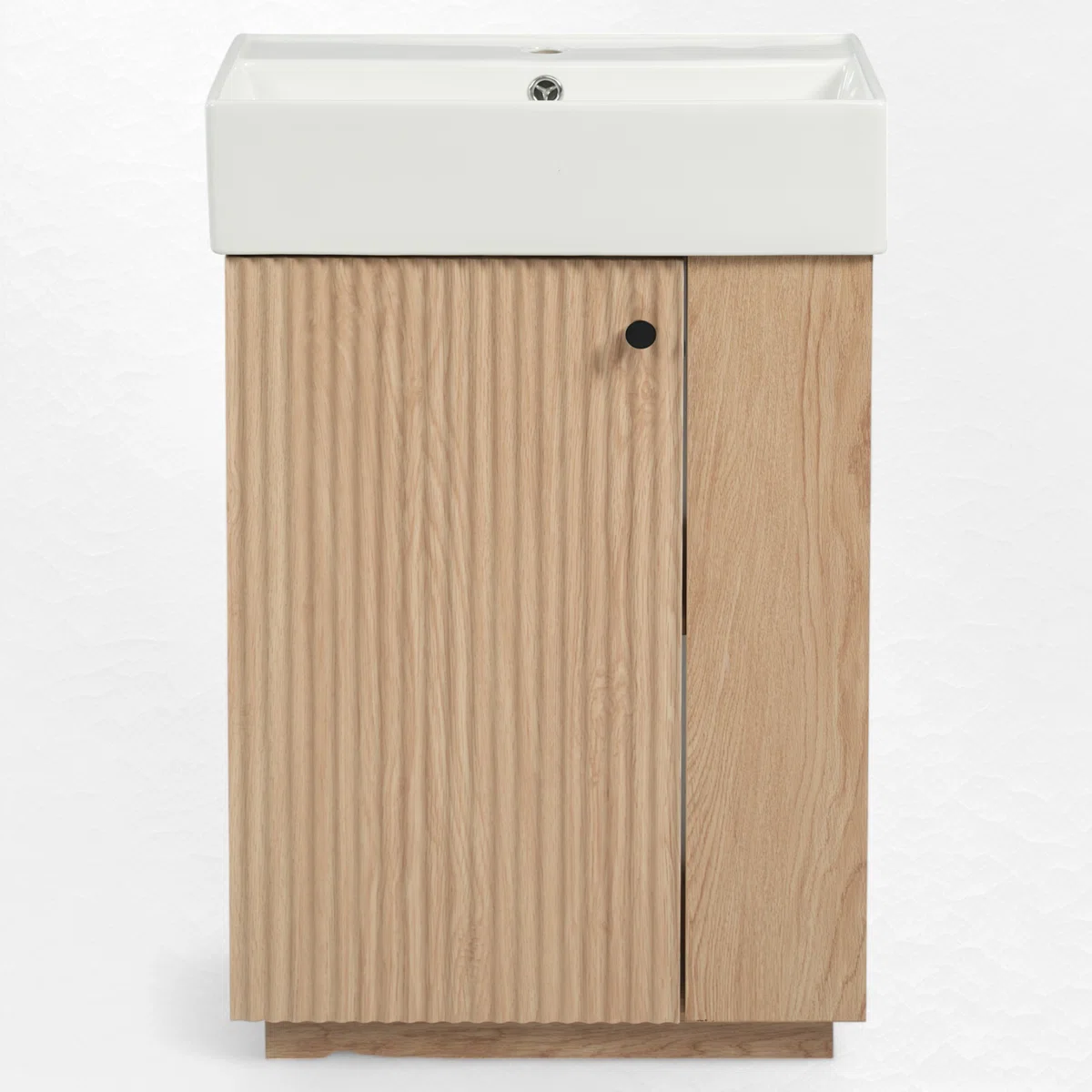 Upgrade your powder room or small bathroom with the 22" Single Bathroom Vanity with Ceramic Top, blending modern functionality with subtle farmhouse charm. The fluted cabinet door adds texture and style, complemented by a minimalist black knob and soft-close hinge for a polished look. The pre-drilled ceramic sink with overflow protection offers a durable, easy-to-clean surface, while the under-sink shelf and dual side shelves provide practical storage for towels, toiletries, and bath essentials. Compact yet thoughtfully designed, this vanity is perfect for maximizing space without compromising on style or convenience.