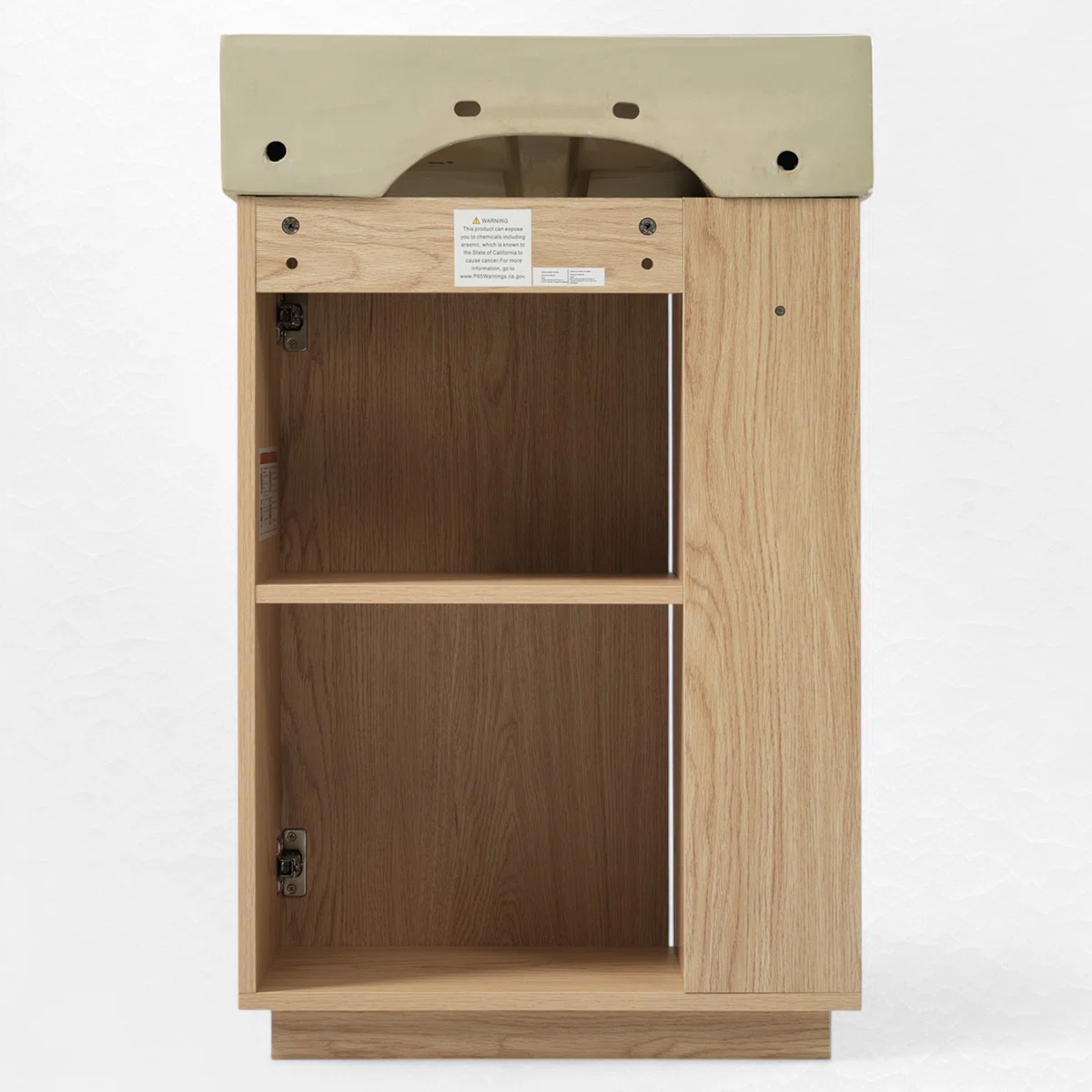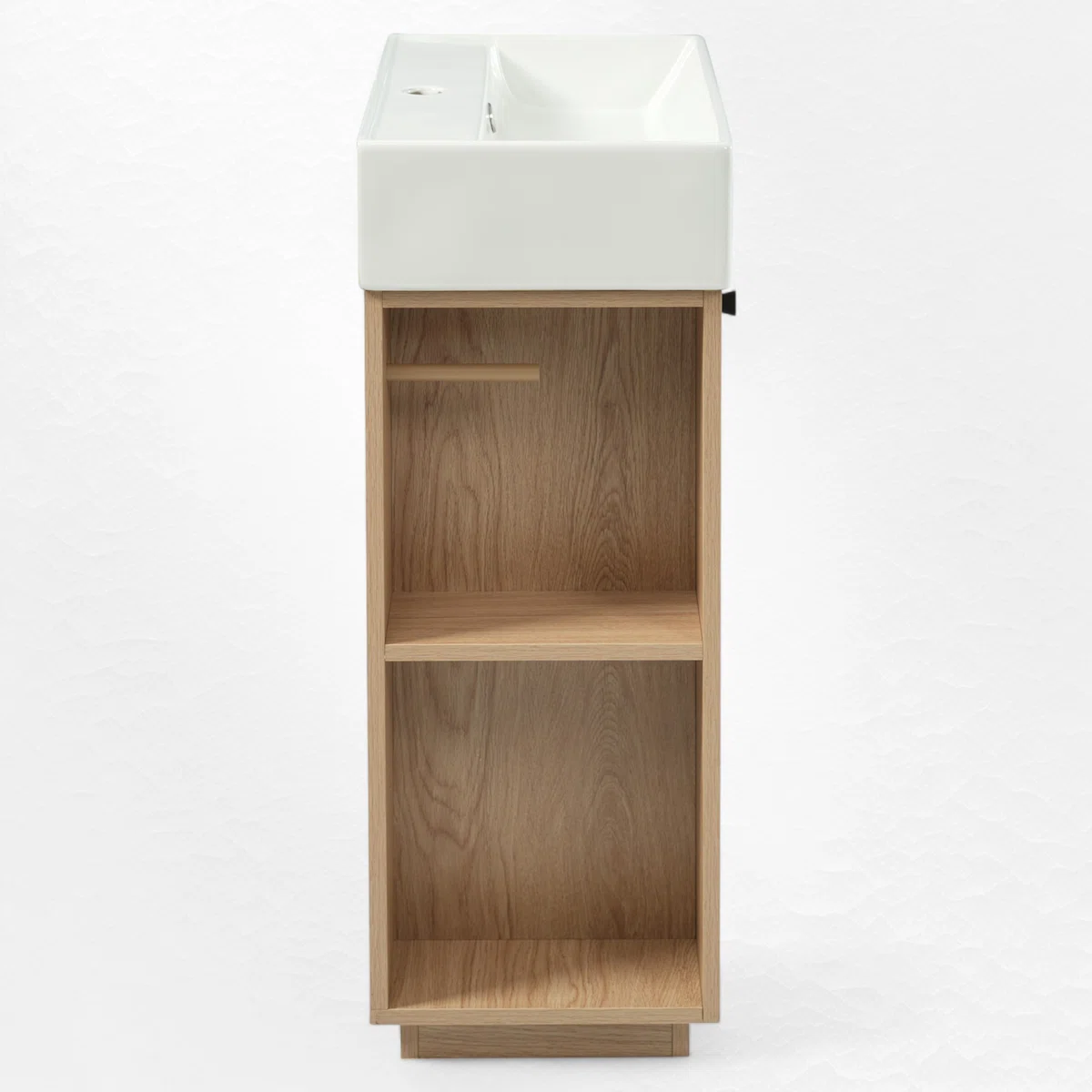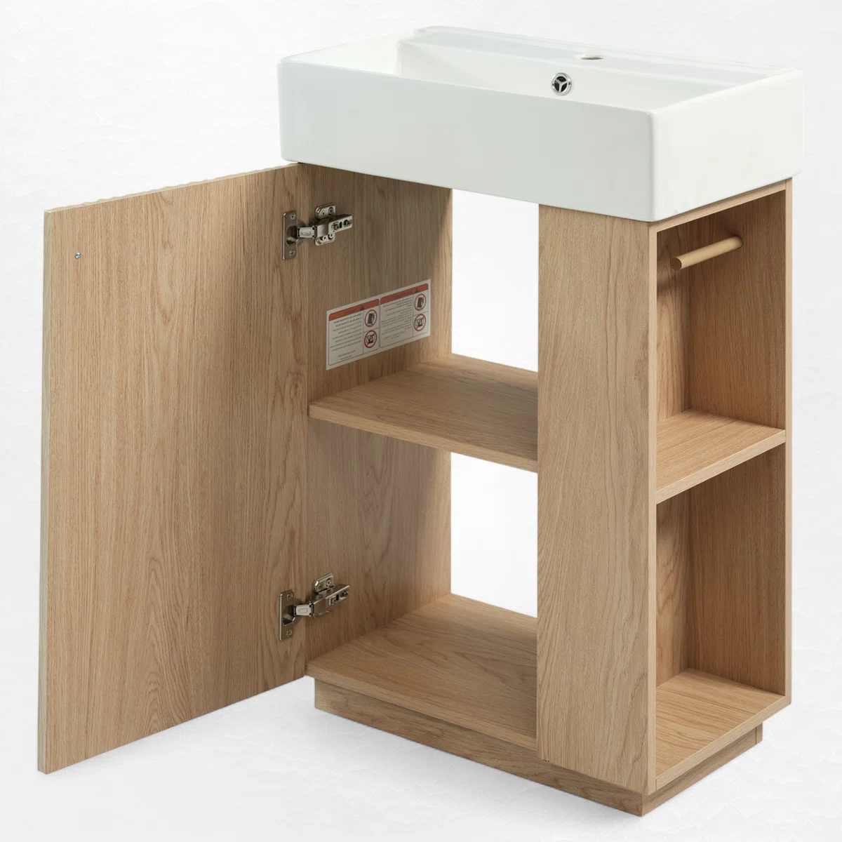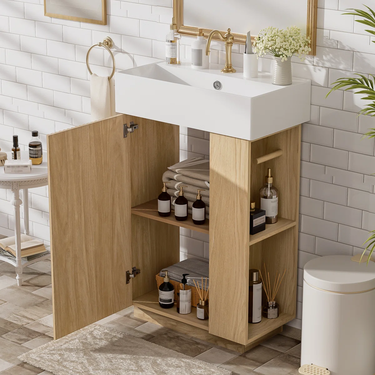 Upgrade your powder room or small bathroom with the 22" Single Bathroom Vanity with Ceramic Top, blending modern functionality with subtle farmhouse charm. The fluted cabinet door adds texture and style, complemented by a minimalist black knob and soft-close hinge for a polished look. The pre-drilled ceramic sink with overflow protection offers a durable, easy-to-clean surface, while the under-sink shelf and dual side shelves provide practical storage for towels, toiletries, and bath essentials. Compact yet thoughtfully designed, this vanity is perfect for maximizing space without compromising on style or convenience.