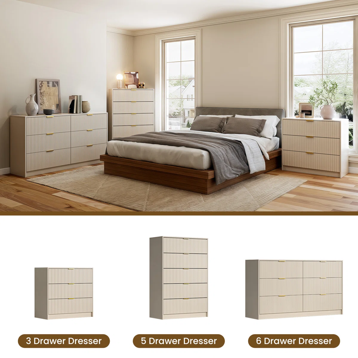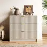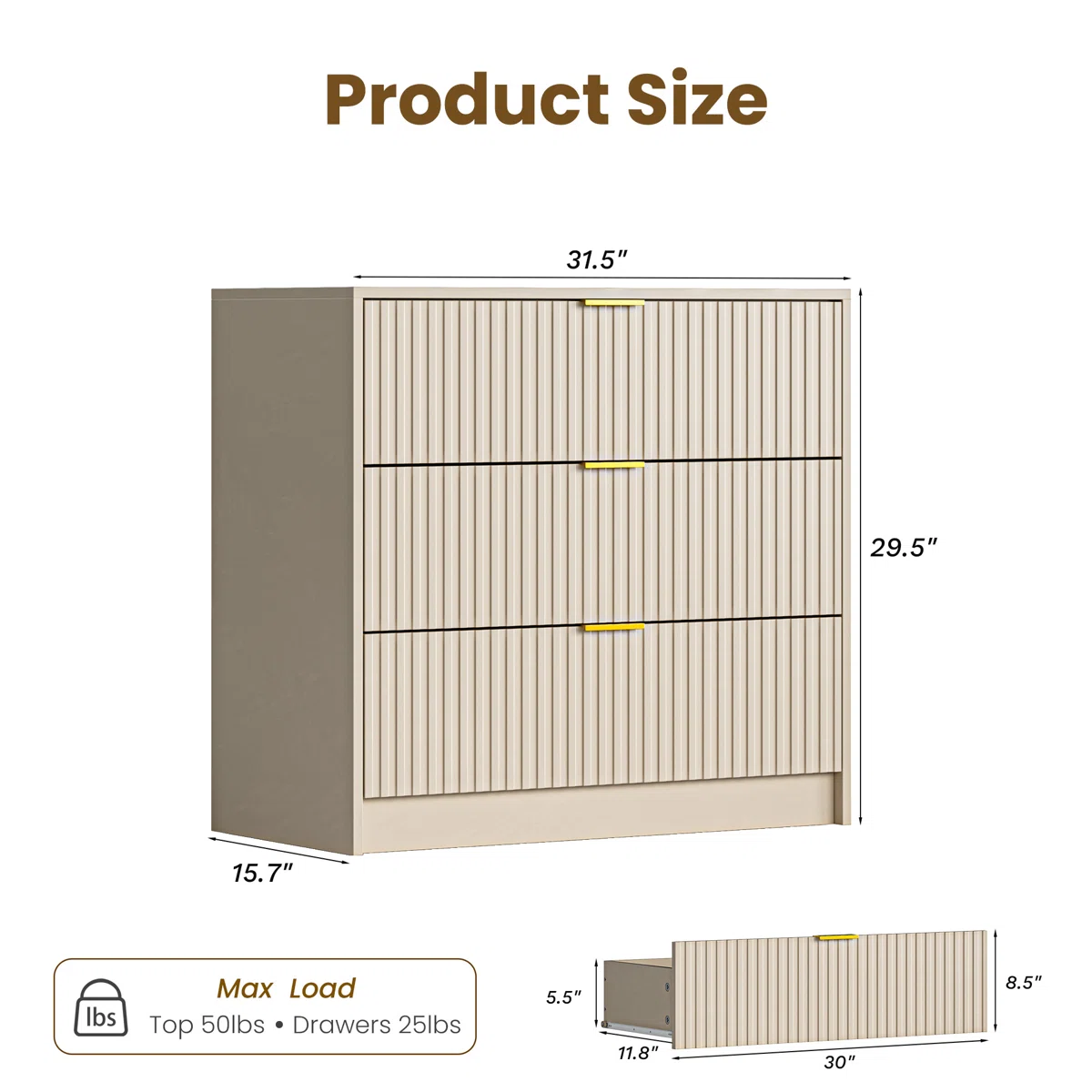 Keep your bedroom organized in style with this 3-Drawer Dresser, 31.5" Wide, designed to bring both functionality and modern charm to your space. Made from durable engineered wood, this dresser features a fluted drawer panel design that adds texture and sophistication to any décor. The smooth metal drawer glides ensure quiet, easy operation, while the spacious drawers provide ample room for clothing, accessories, or everyday essentials.