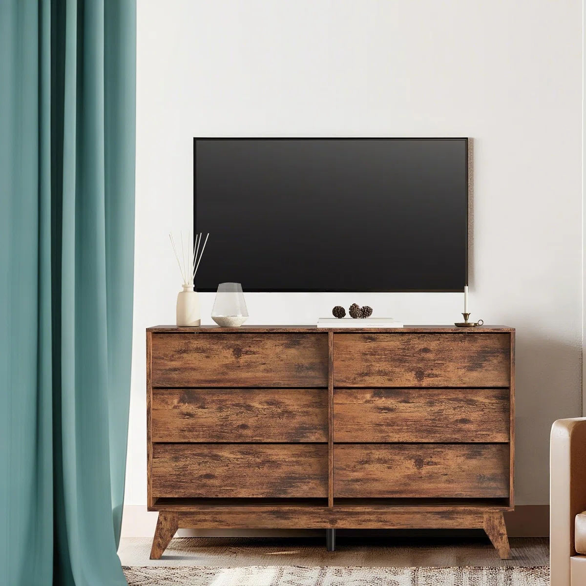 Add timeless charm and practical storage to your home with the 47.2" Wide 6-Drawer Mid-Century Dresser, a stylish fusion of vintage design and modern functionality. Crafted from high-quality, water- and scratch-resistant wood, this elegant dresser features a weathered wood finish that brings warmth and sophistication to any space.