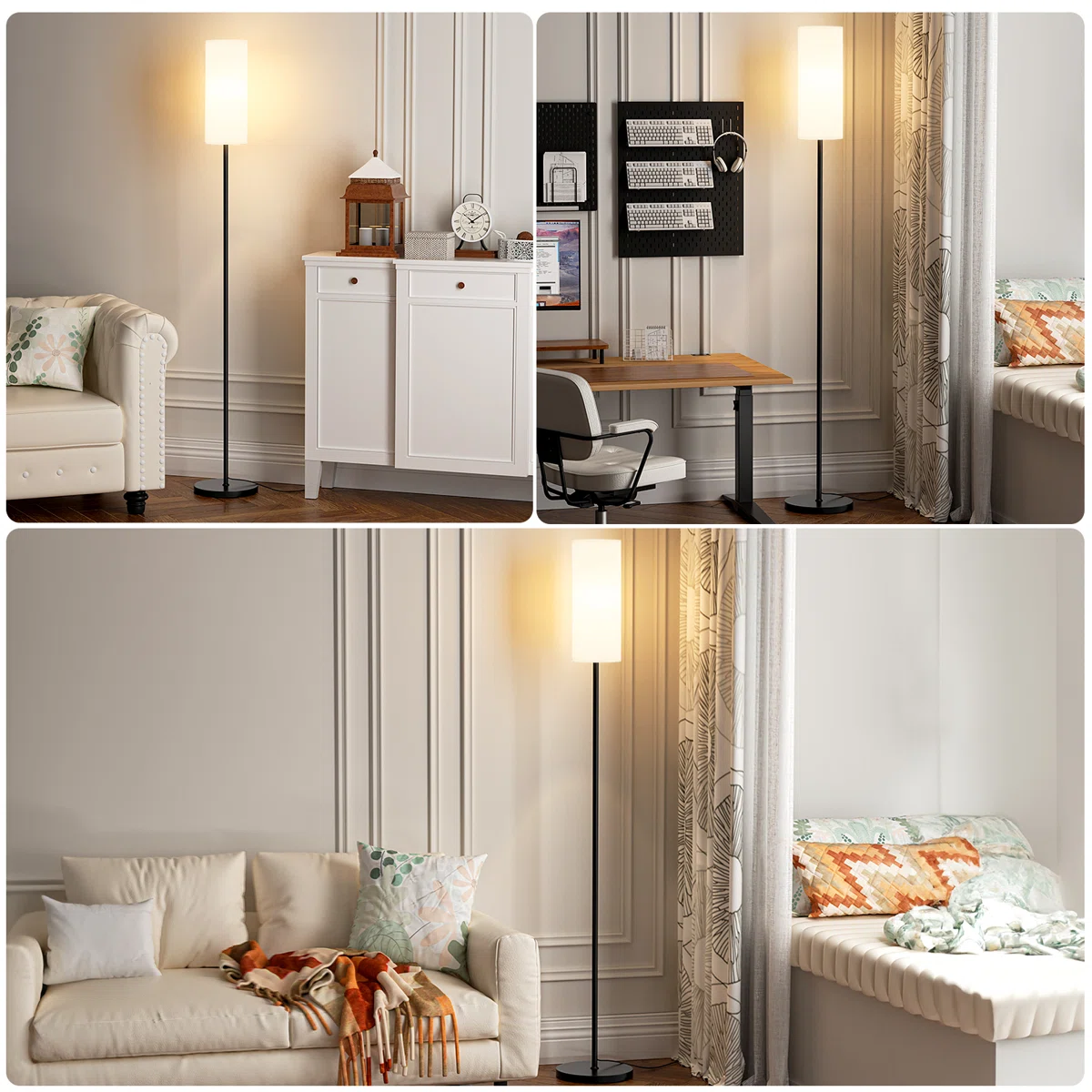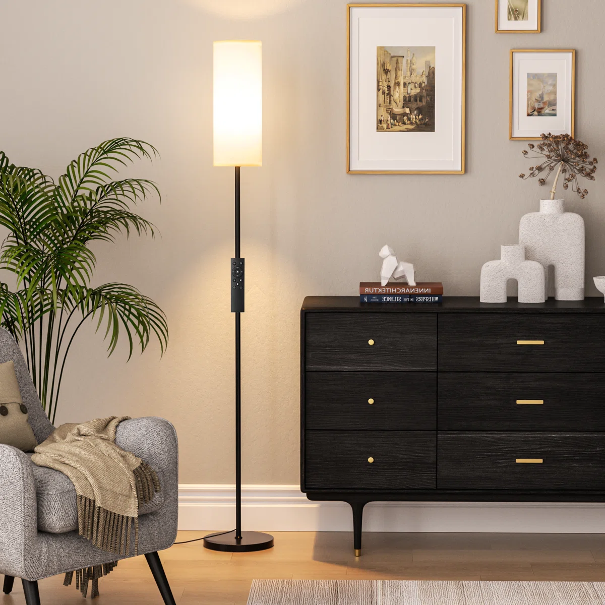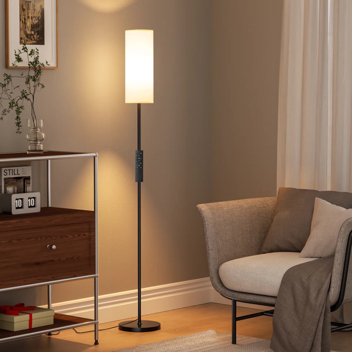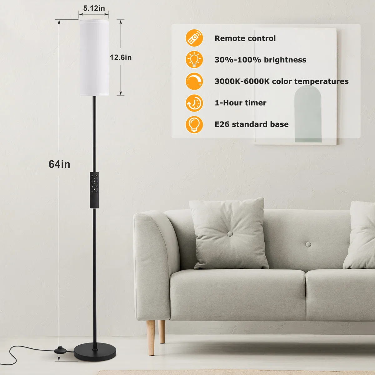 Brighten your home with this modern 64" LED floor lamp featuring stepless dimming and a convenient remote control. The tall slim pole, soft fabric shade, and weighted base make it perfect for living rooms, bedrooms, offices, and reading corners. Adjust brightness and color temperature instantly to create the ideal ambiance for any moment. Lightweight, stable, and easy to operate, this lamp combines style, comfort, and functionality in one elegant design.