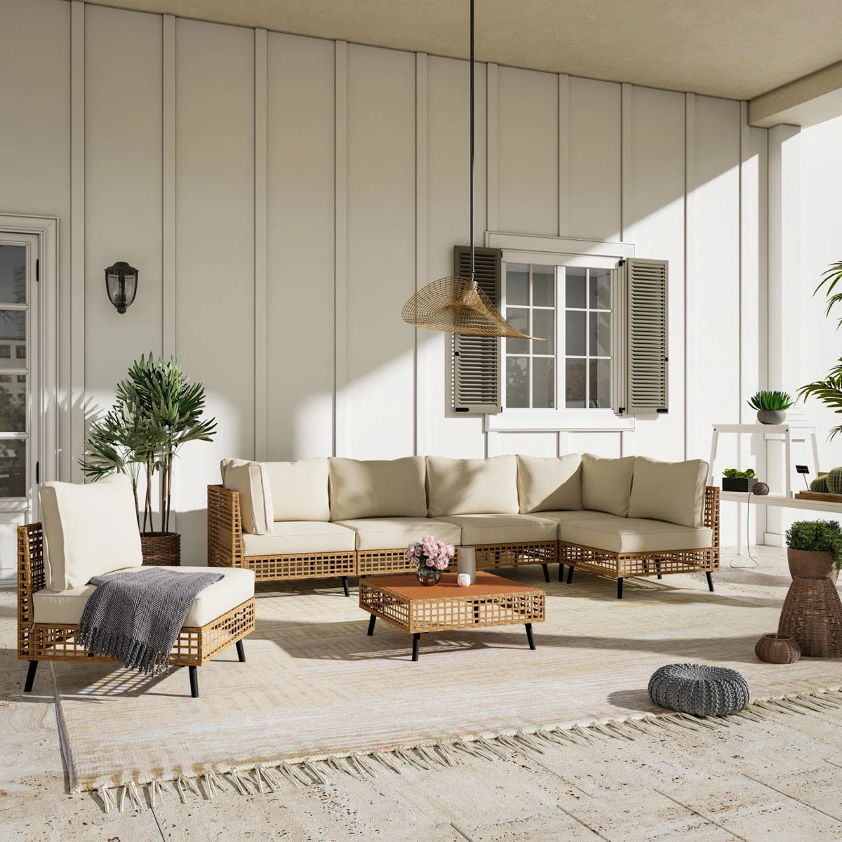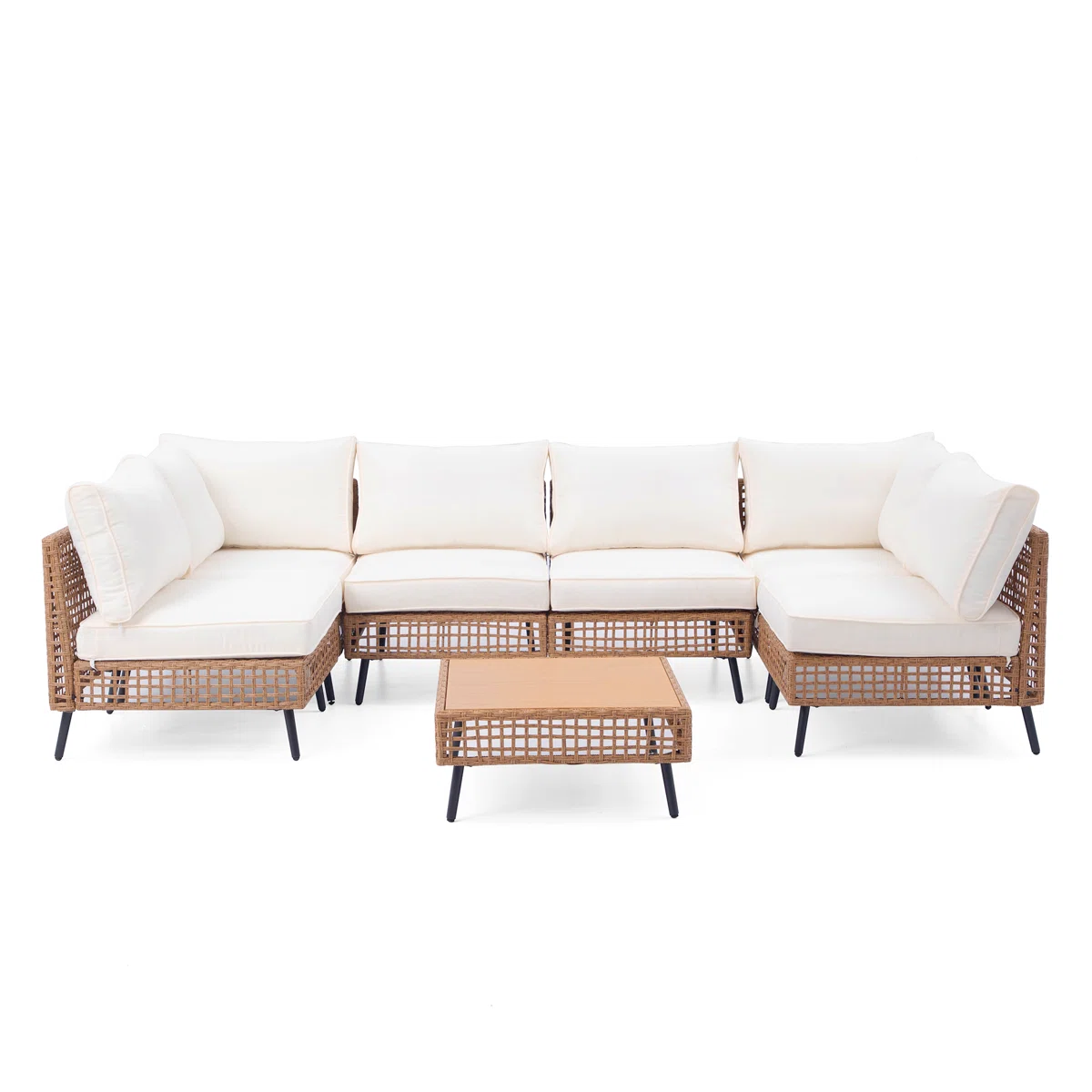 Elevate your outdoor living space with this 7-piece wicker sectional conversation set, thoughtfully designed for comfort, durability, and versatile styling. Crafted with high-density PE wicker wrapped over a sturdy powder-coated iron frame, this set offers long-lasting strength and resistance to weather, fading, and daily wear. Thick cushions, widened armrests, and ergonomically curved backrests ensure relaxation, while the modular design allows for endless layout combinations to fit any patio, deck, or backyard setting. Complete with six seating pieces and a matching wood-textured coffee table, this set blends vintage charm with modern outdoor performance.