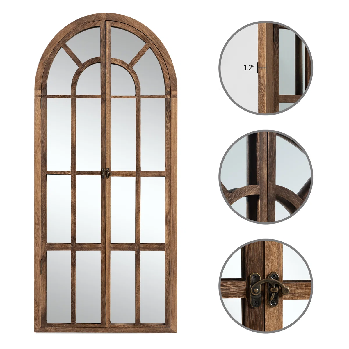 This decorative wall mirror opens up your space and brings the feel of a real open window to your home. Designed to mount to your wall or simply lean against it, this mirror is placed inside of an arched solid wood frame with windowpane accents and two locks in the middle for plenty of depth and dimension. This mirror is ideal for opening up your living room or bedroom, making it appear larger, and for checking out your look before you start the day. Plus, it's rated for damp locations, so it works well in your bathroom or on a covered porch.