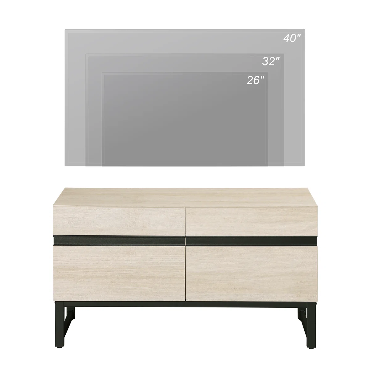 This TV stand is a modern, stylish piece featuring a sturdy metal base. Its wood grain design add a touch of elegance and sophistication to any room. One of its unique features is a hidden storage cabinet, perfect for stashing away remote controls, DVDs, and other small items to keep your living space neat and tidy. This TV stand also comes with concealed door handles for a sleek, minimalist look. The back of the cabinet has holes for power cords, making it easy to manage and hide unsightly wires. With its combination of functionality and style, this TV stand is not only a practical storage solution but also a fashionable addition to your home decor.