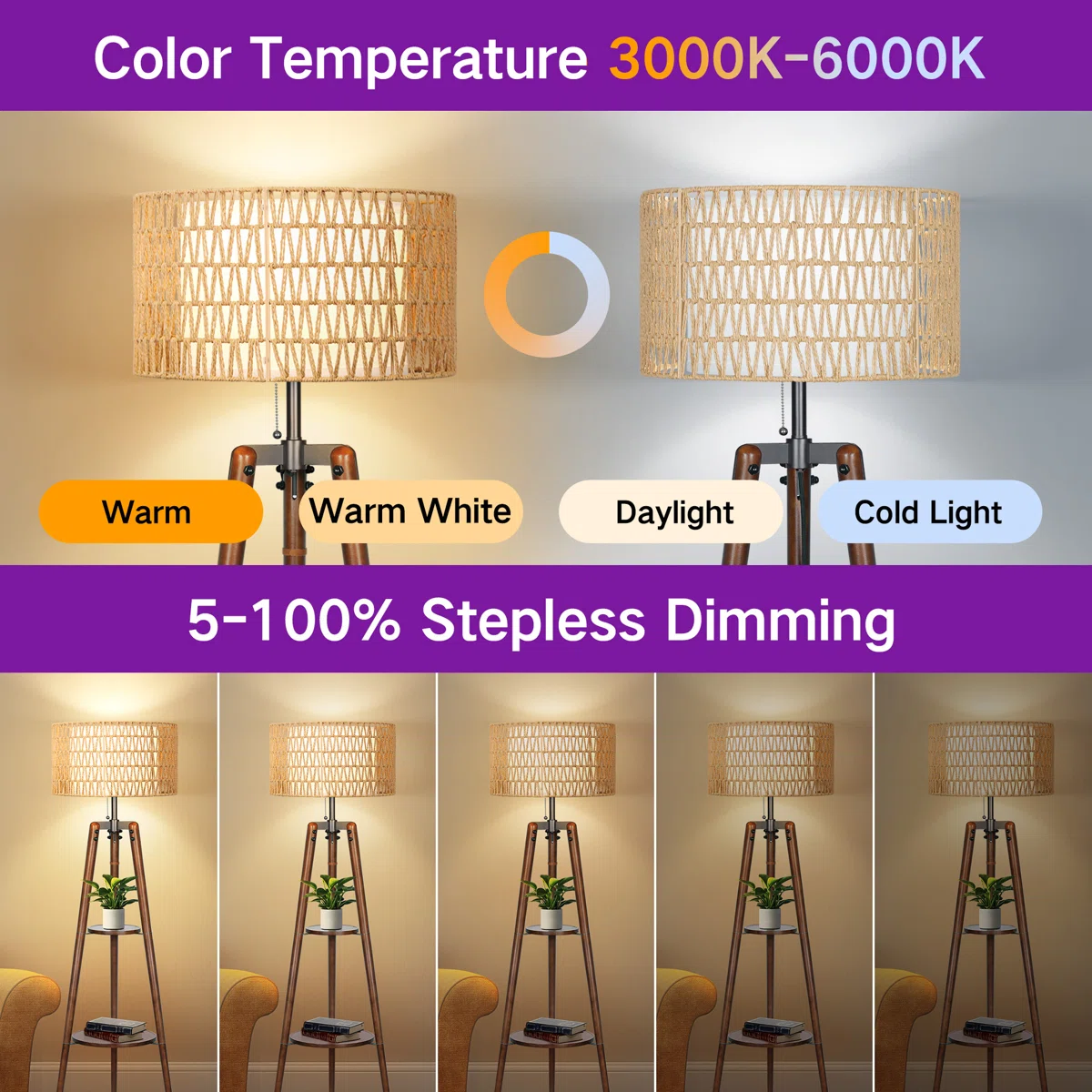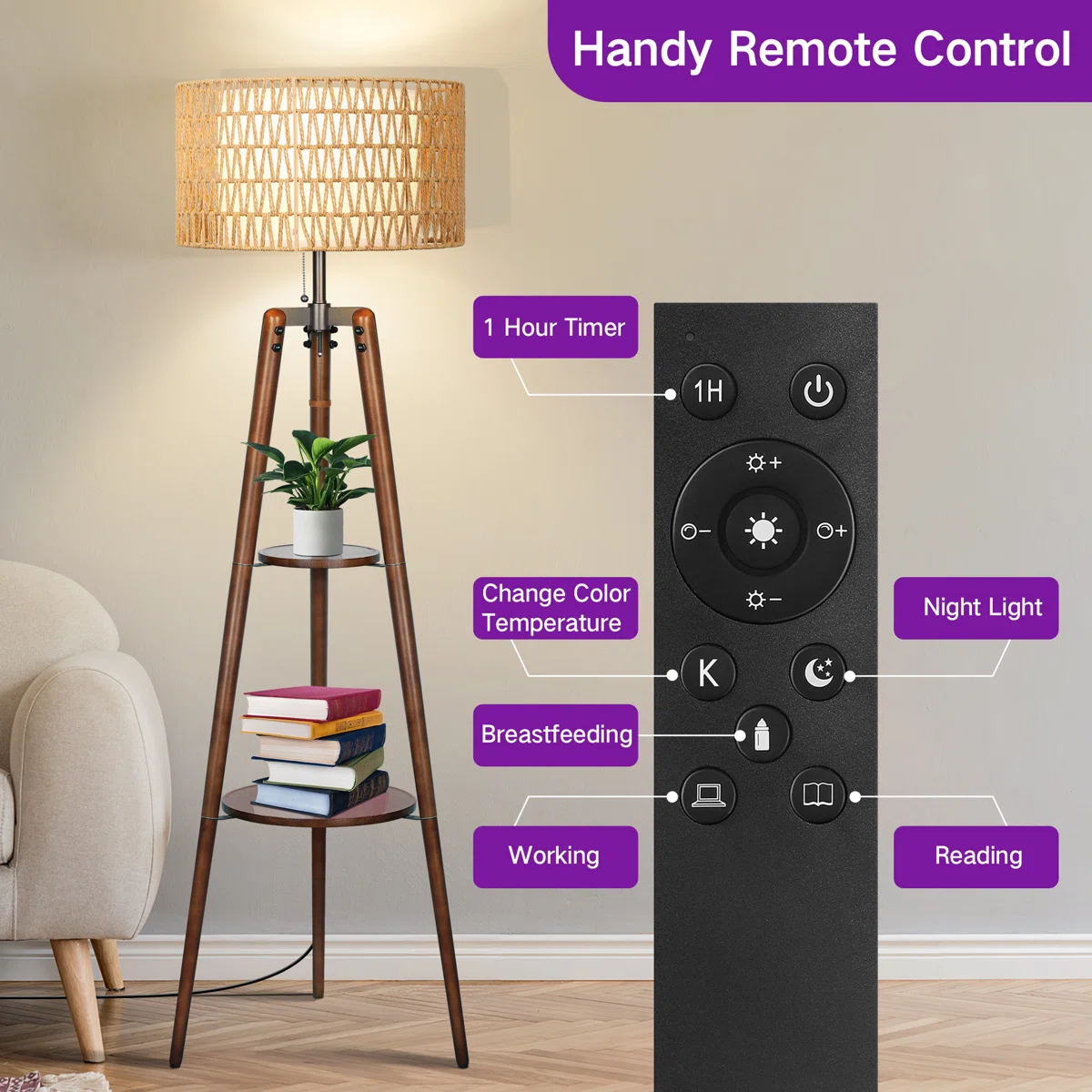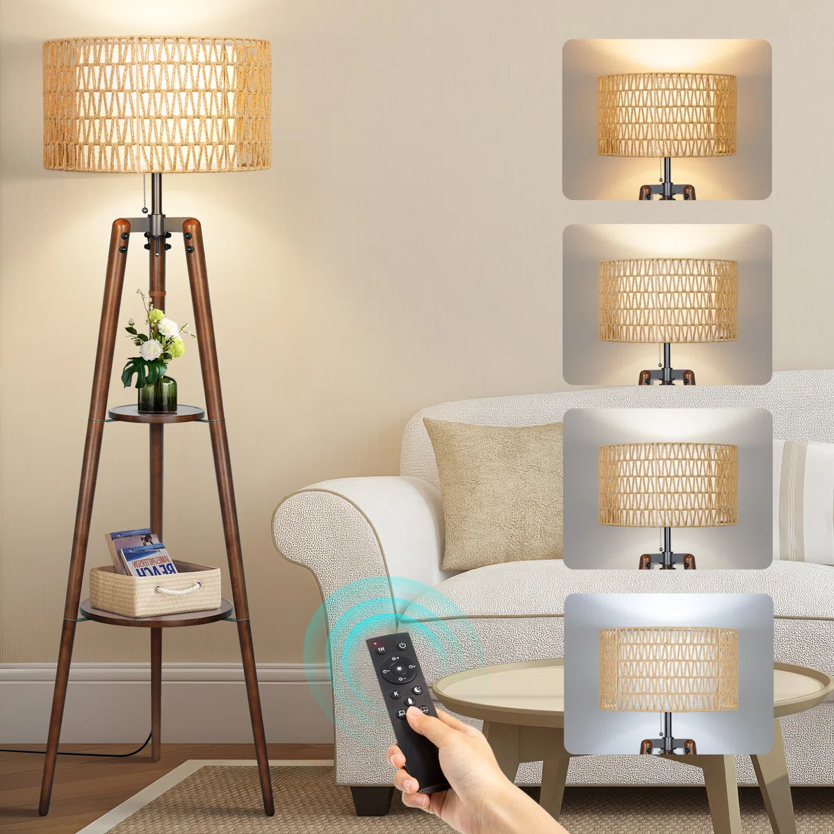 Bring warmth, style, and smart lighting to any room with the Acklins 61" Tripod Floor Lamp. Designed with a rustic farmhouse aesthetic, it features a solid wood tripod base paired with a rattan and linen dual-shade diffuser for a charming natural look. This lamp includes a remote-controlled LED bulb with stepless dimming, adjustable color temperature, memory function, and a 1-hour timer. Additional storage shelves built into the structure make it both practical and decorative. A perfect lighting upgrade for living rooms, bedrooms, offices, and reading corners.