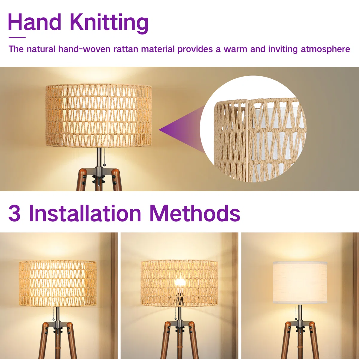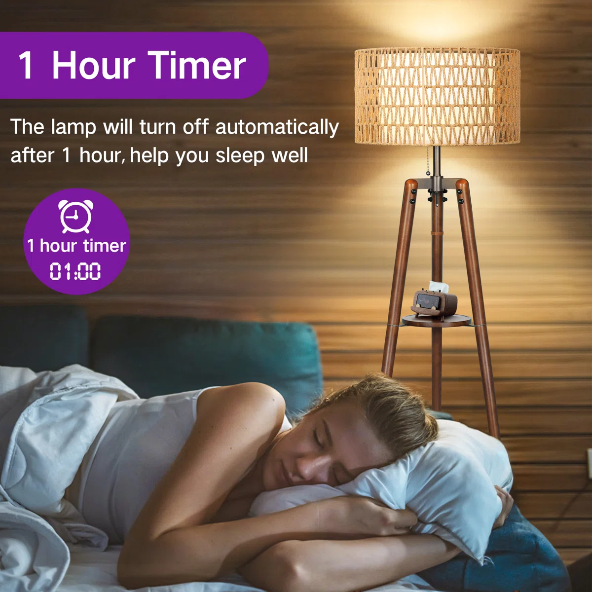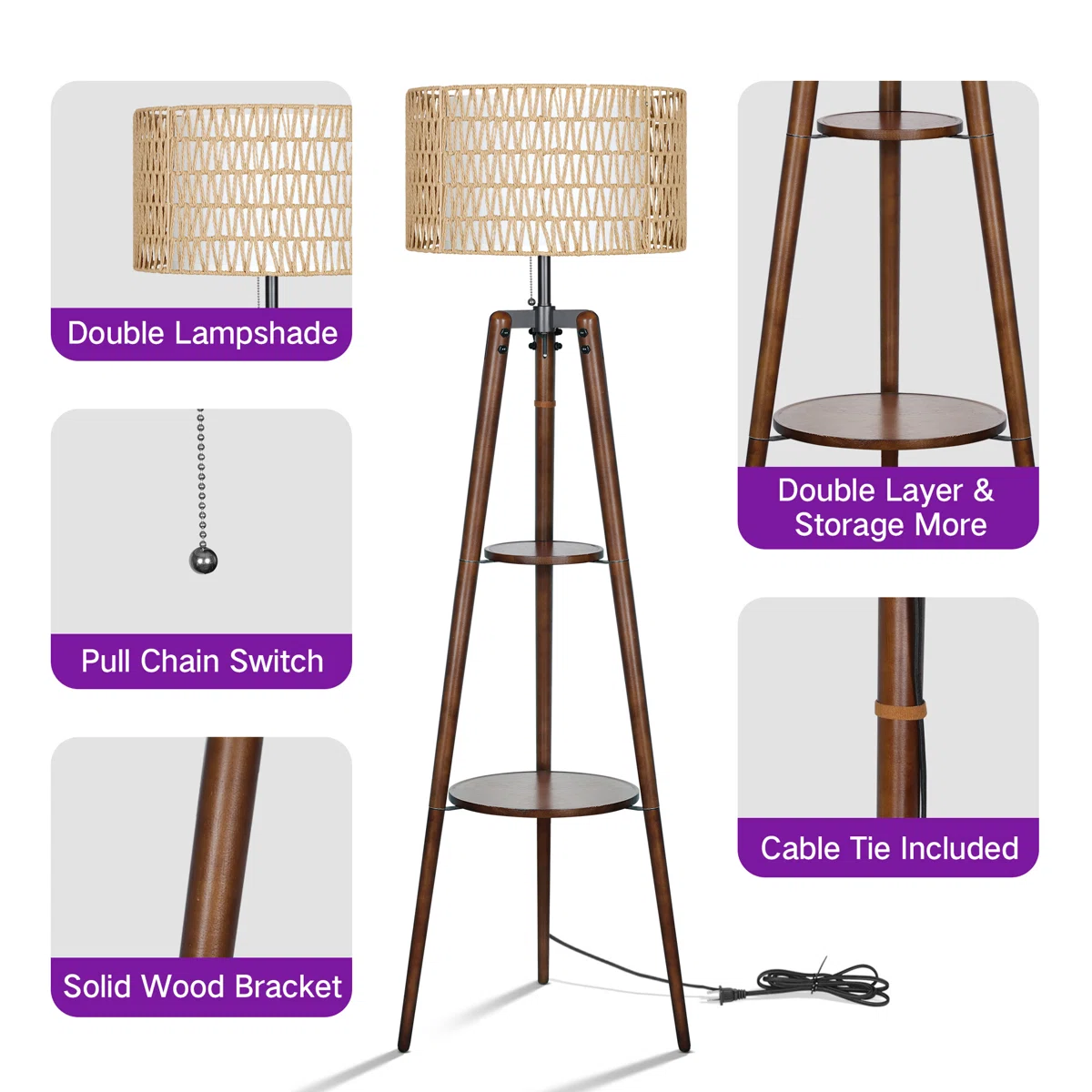 Bring warmth, style, and smart lighting to any room with the Acklins 61" Tripod Floor Lamp. Designed with a rustic farmhouse aesthetic, it features a solid wood tripod base paired with a rattan and linen dual-shade diffuser for a charming natural look. This lamp includes a remote-controlled LED bulb with stepless dimming, adjustable color temperature, memory function, and a 1-hour timer. Additional storage shelves built into the structure make it both practical and decorative. A perfect lighting upgrade for living rooms, bedrooms, offices, and reading corners.