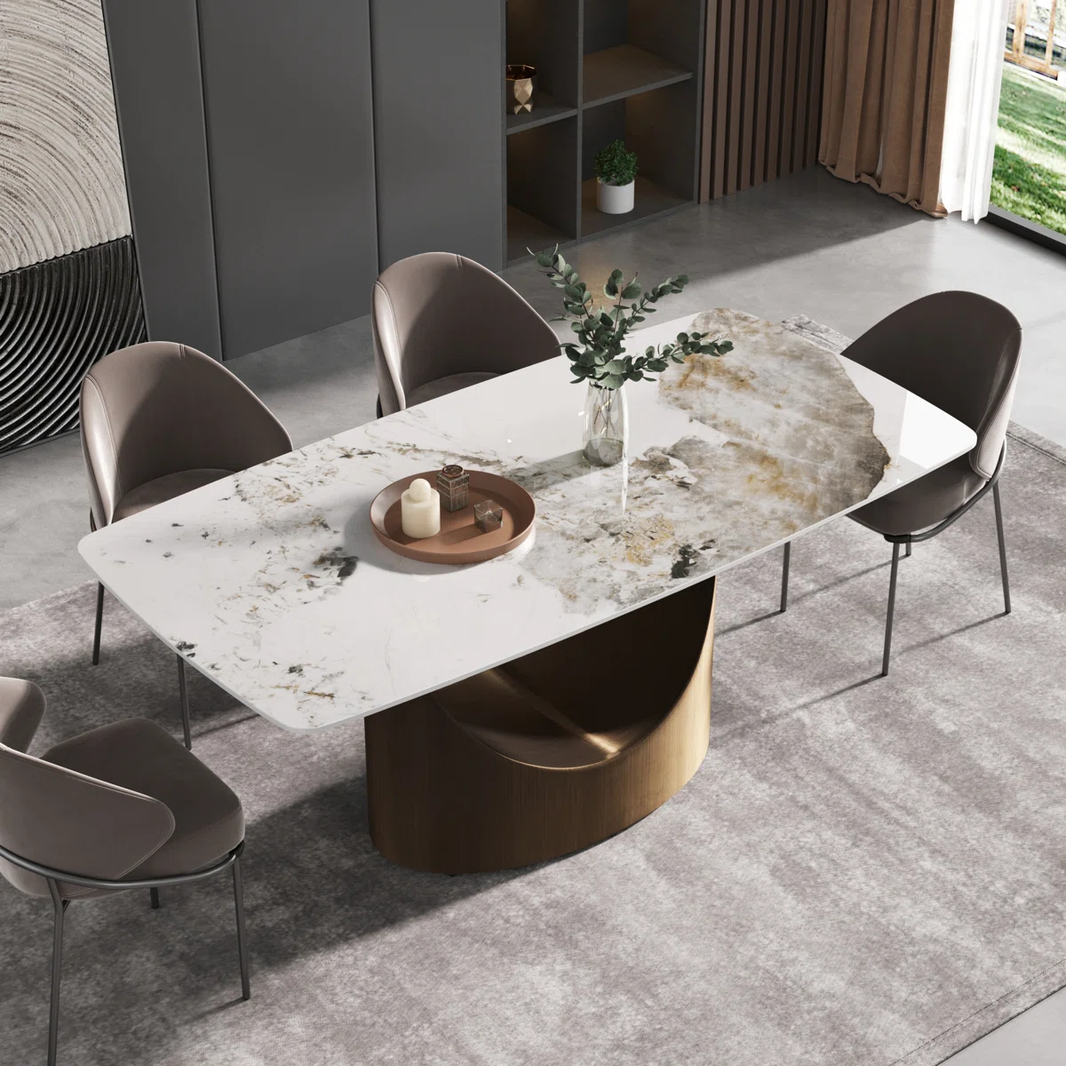 A sleek and contemporary pedestal dining table designed to elevate any modern dining space. Crafted with a luxurious sintered stone top and a sturdy steel pedestal base, this table delivers durability, scratch resistance, and timeless aesthetic appeal. Its clean rectangular shape and smooth surface make it both a stylish centerpiece and a practical choice for everyday dining. Available in larger 63" and 70.87" configurations, it comfortably accommodates up to six people. Easy to maintain with simple wipe-clean care, this table is ideal for homes seeking a minimalist yet high-end dining experience.