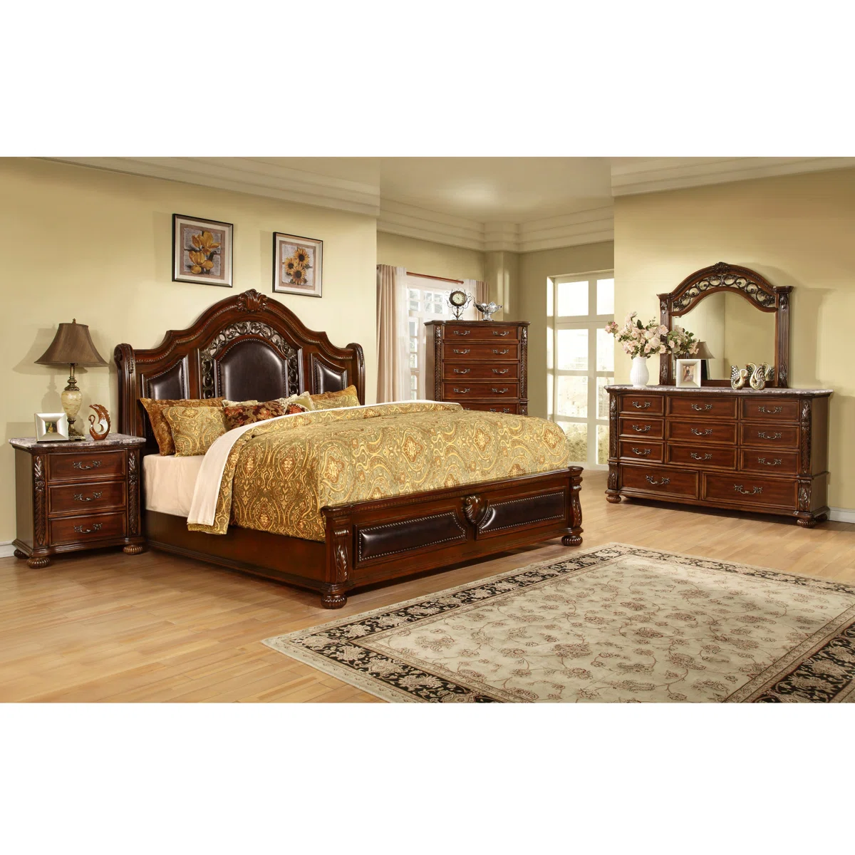 Includes One (1) Nightstand. Made of Solid rubber wood. Comes with 3 drawers. Drawer dimensions 17"L x 13"D x 4.5"H. Has a marble top on the nightstand. Traditional Style. The top drawer has a velvet felt lining. The wood is in cherry color. Handles are made of metal. Fully Assembled Dimension 28.5"L x 18.5"D x 30" H. Comes Fully Assembled.