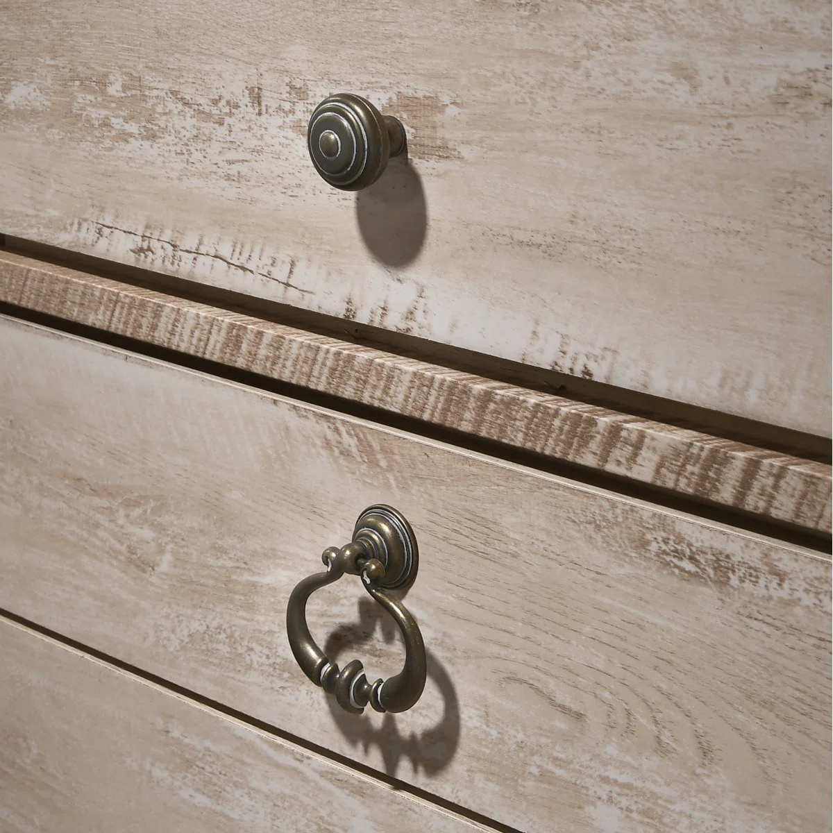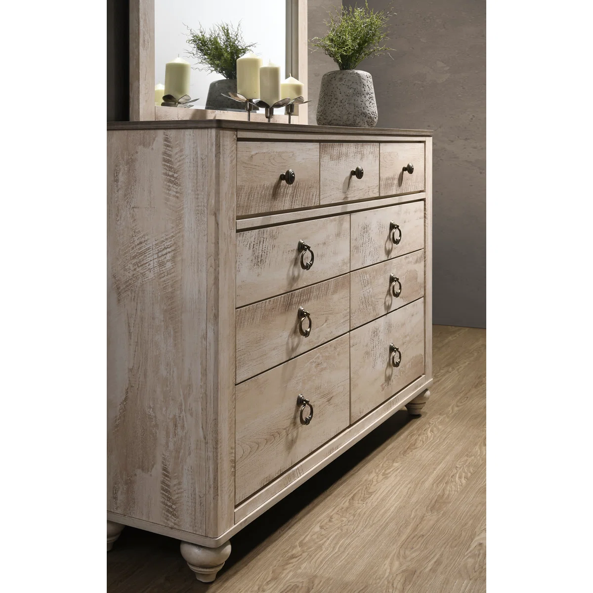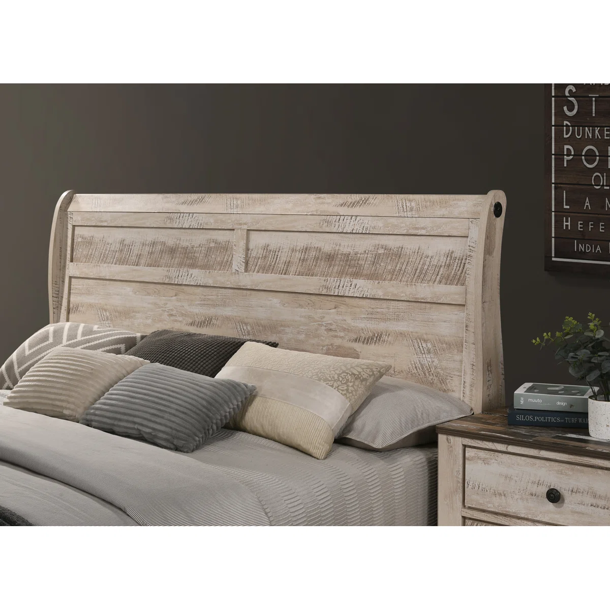 The Rosalind Wheeler Anoka 6-Piece Bedroom Set transforms your bedroom with shabby elegance and contemporary style. Finished in a vintage white-washed distressed look with wood-patterned tops and delicate antique metal pulls, this set features a king-size sleigh bed, dresser, mirror, nightstands, and chest. Its thoughtfully designed pieces combine style, function, and durability, offering ample storage and a timeless aesthetic. The set is crafted from sturdy manufactured wood and includes tip-over restraint devices on the dresser and chest. Perfect for creating a cozy yet sophisticated bedroom environment. Please note some sets may be missing pieces or otherwise incomplete.