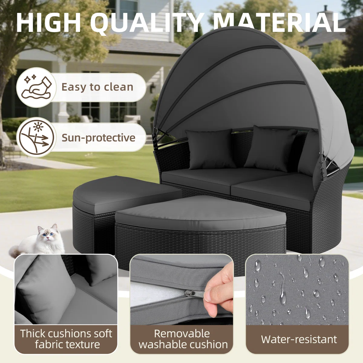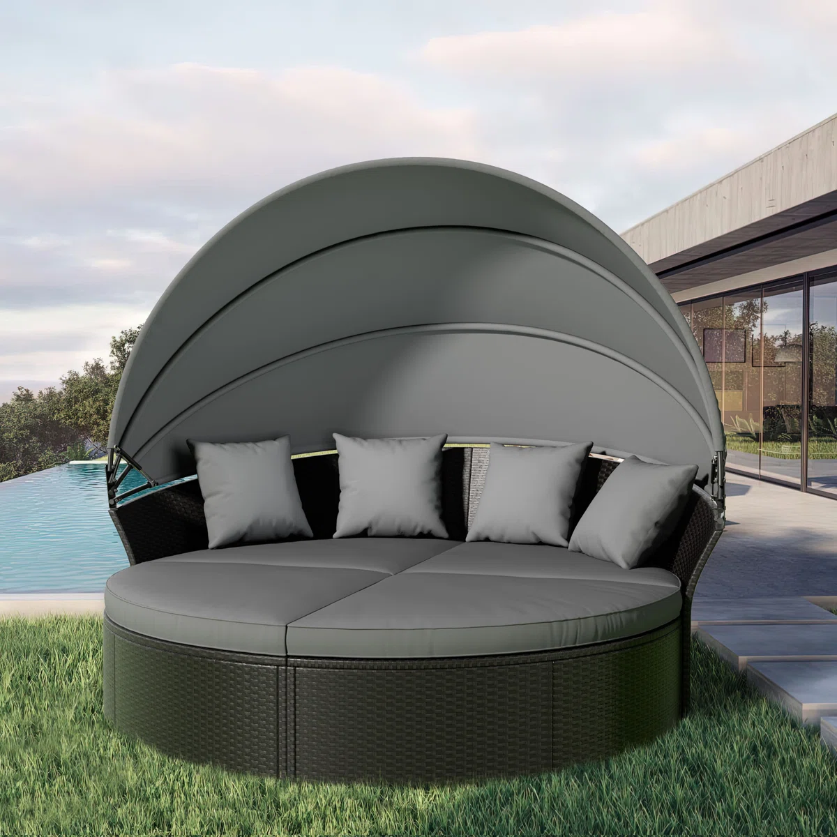 The Wrought Studio Antwan Outdoor Patio Daybed combines style, comfort, and durability for the perfect outdoor lounging experience. Crafted with a stable polyethylene wicker frame over a steel base, this round modular daybed accommodates up to four people. Cushions are water- and UV-resistant, filled with foam, and come with removable, machine-washable covers. The included canopy provides shade, while the elegant gray and black color palette complements any patio or backyard setup. Designed for relaxation, entertaining, or sunbathing, this daybed delivers long-lasting comfort and functionality.