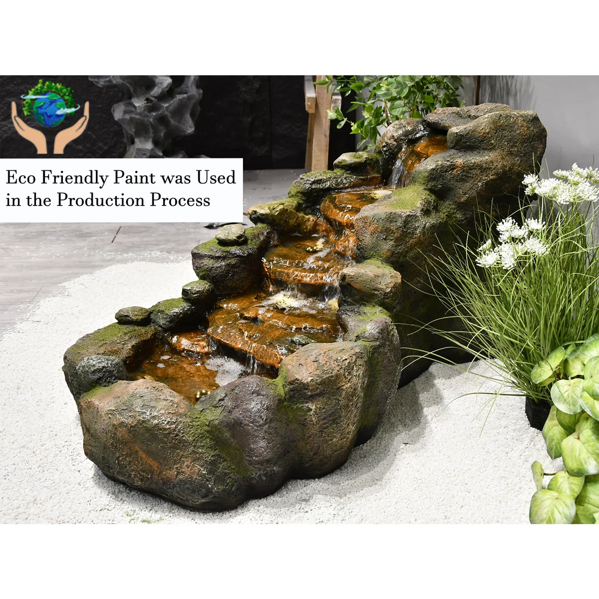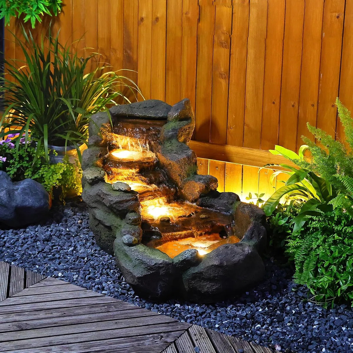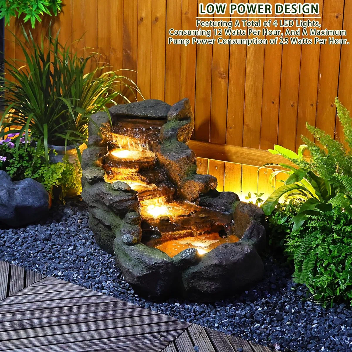 The fountain features cascading water tiers that imitate the soothing sound of a real waterfall, creating a peaceful ambiance that helps relieve stress and fatigue. Integrated four warm glow LED lights illuminate the fountain, adding a cozy and elegant touch to your outdoor décor even after the sun sets.