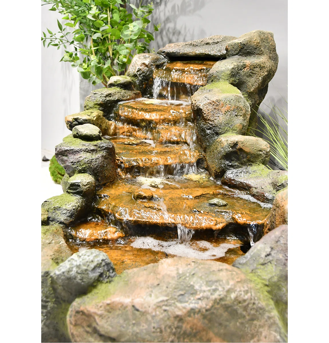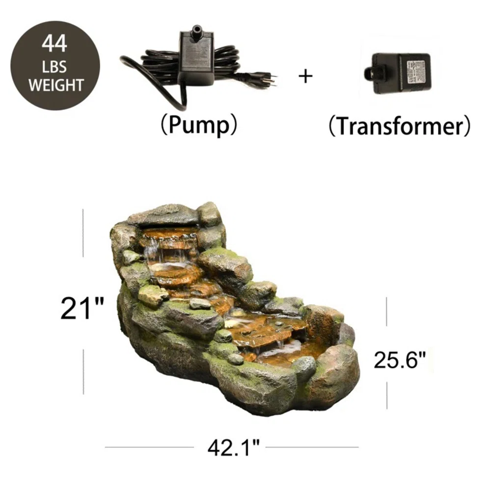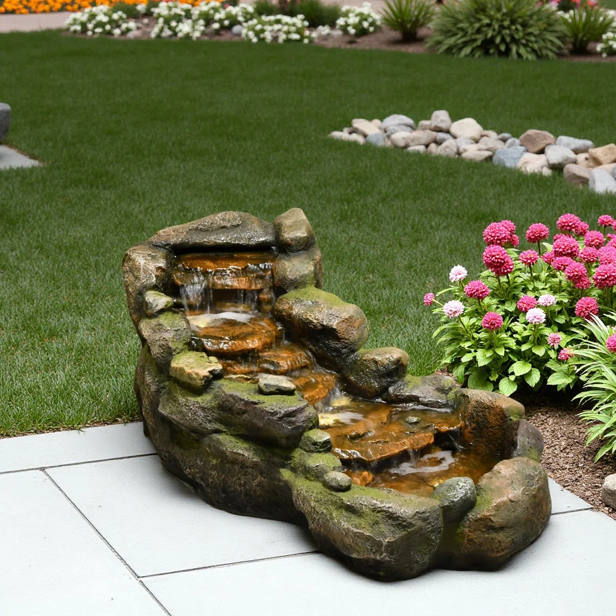 The fountain features cascading water tiers that imitate the soothing sound of a real waterfall, creating a peaceful ambiance that helps relieve stress and fatigue. Integrated four warm glow LED lights illuminate the fountain, adding a cozy and elegant touch to your outdoor décor even after the sun sets.