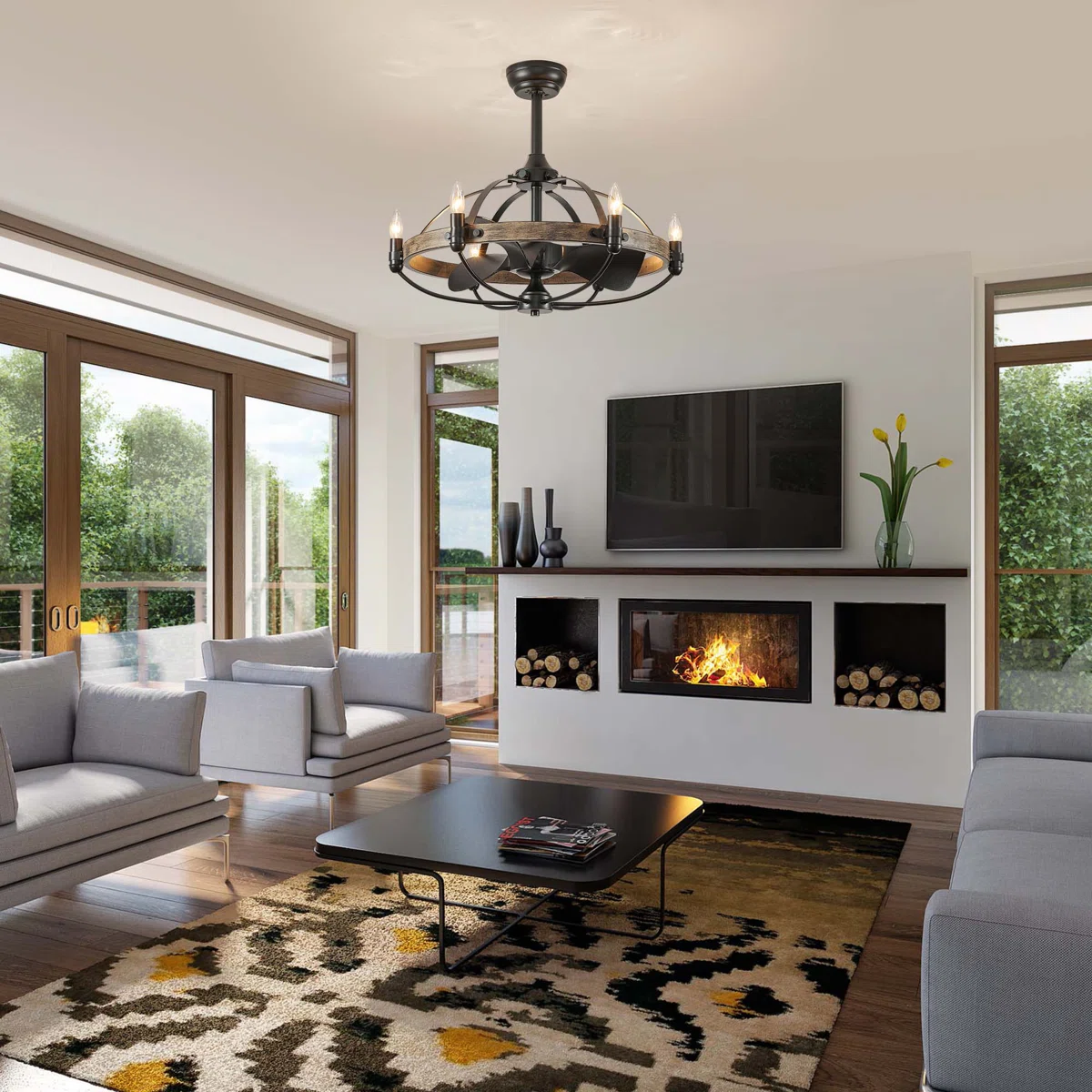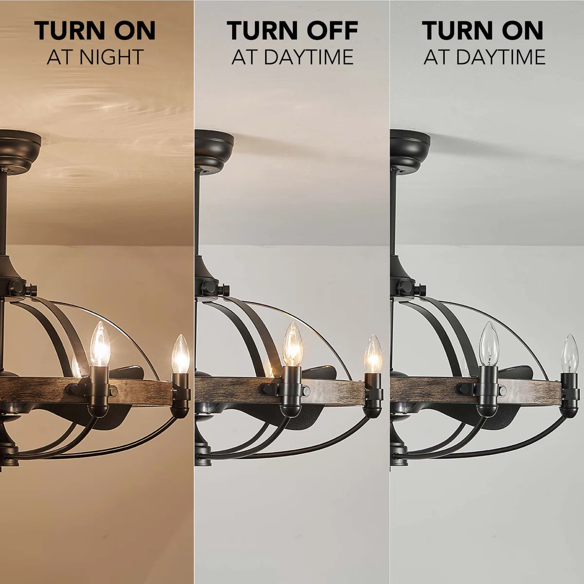 With its weathered, rustic tones and organic textures, this ceiling fan will easily blend into any coastal-themed home, evoking a sense of tranquility and comfort. Thoughtfully designed farmhouse elements create a cozy ambiance, allowing you to relax while enjoying this fan light. This ceiling fan has six adjustable fan speeds and a timer function allowing for 1/2/4-hour settings. The fixture is constructed from durable, high-quality pure iron and features a matte black spray paint finish that exudes sophistication. The center of the light is adorned with a tasteful wooden pattern design, while the fan blades are crafted from sleek black ABS material for an added touch of elegance. With its stylish design and practical features, this fan light is the perfect addition to any home, providing a refreshing breeze and ambient lighting in one convenient package.