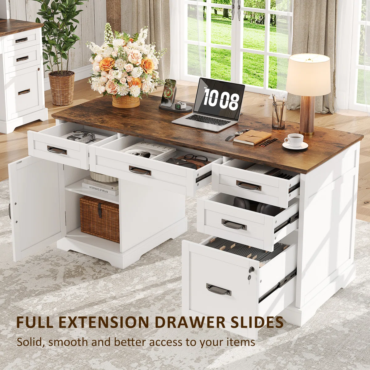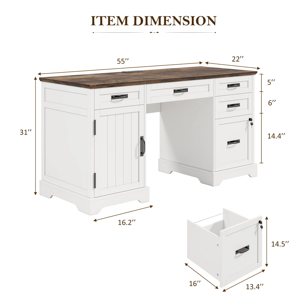 Enhance your workspace with the August Grove® Clabe 55" Farmhouse Executive Desk, featuring a charming Rustic Brown and White finish that perfectly blends traditional farmhouse style with modern functionality. This executive writing desk includes multiple drawers, a file cabinet, and built-in power outlets to keep your devices powered and organized. Ideal for home offices or study spaces that demand both practicality and timeless design.