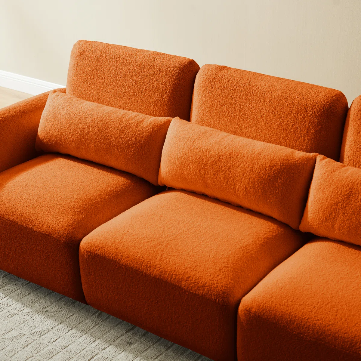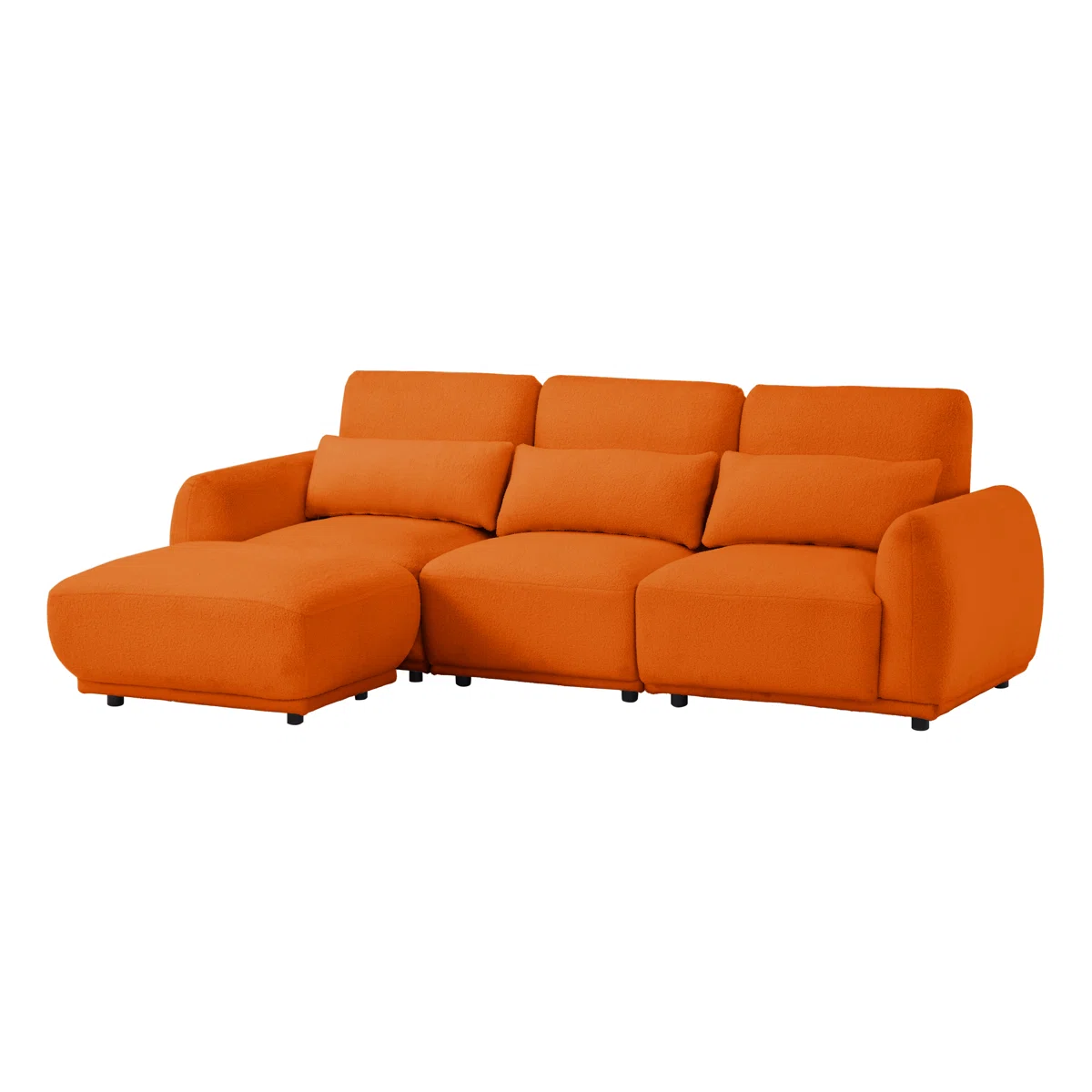 Elevate your living space with the Latitude Run Ballyrobert 4-Piece L-Shaped Sectional Sofa. Featuring a modern design with rolled arms and luxurious orange wool upholstery, this modular sofa offers versatile configurations to suit small or spacious rooms. Each seat is padded with high-density foam over a solid wood frame for lasting comfort, while loose cushions enhance relaxation. The included reversible ottoman and three accent pillows provide flexibility and style. Ideal for family rooms, basements, or living rooms, this convertible sectional is designed for both comfort and convenience.