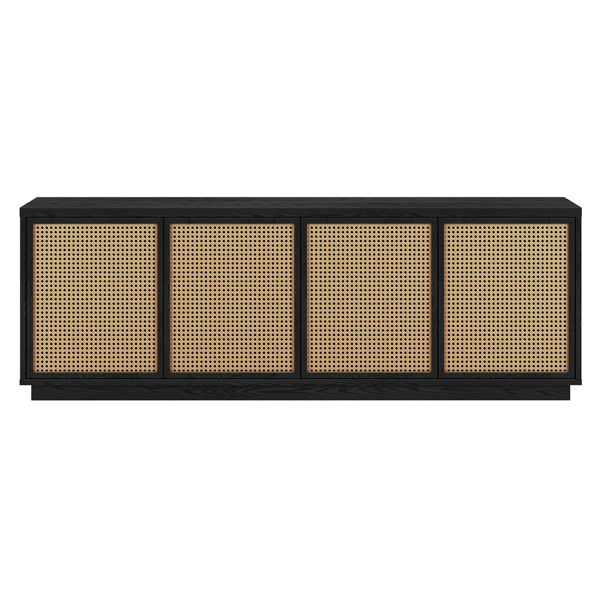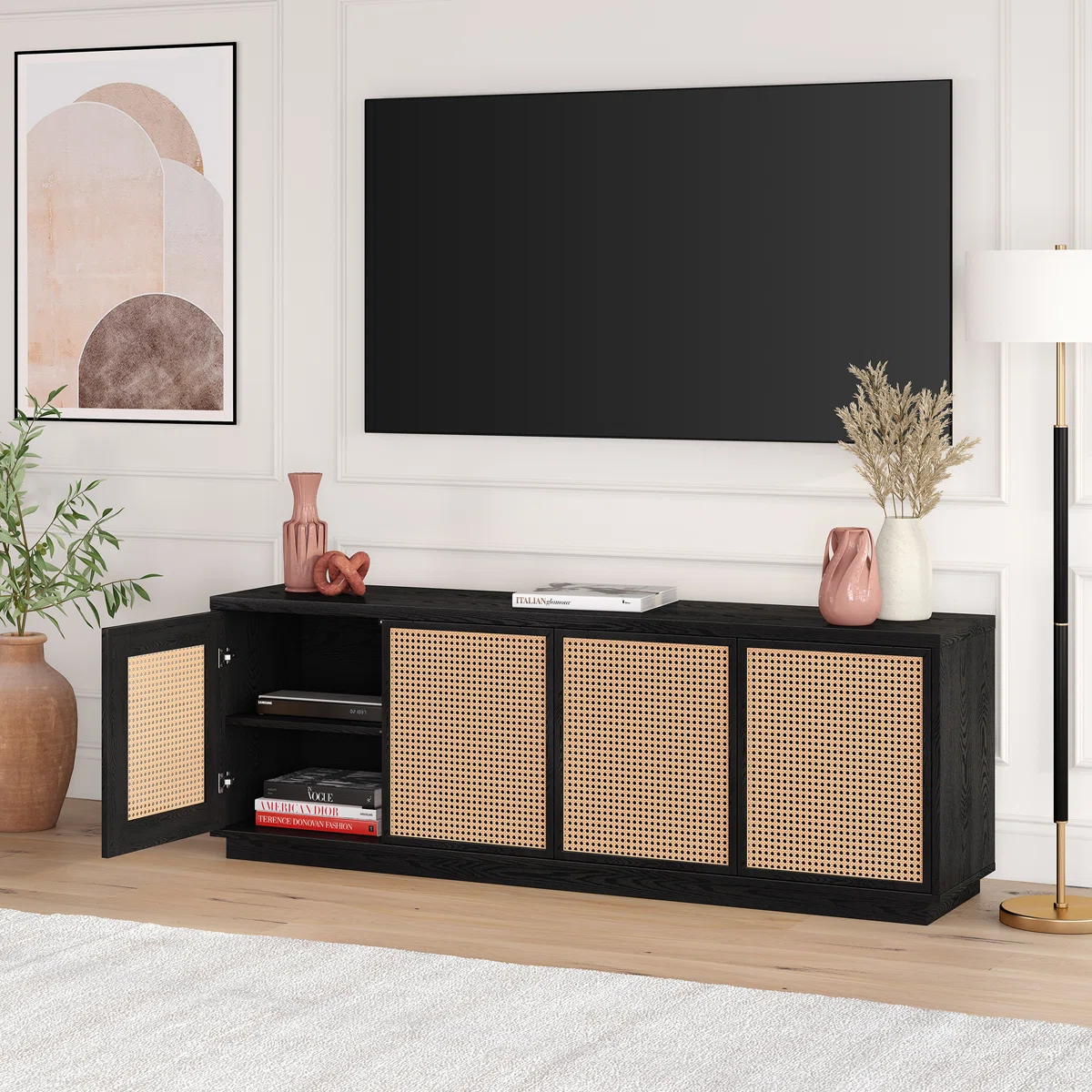 The Giordano 70" Storage Credenza by Beachcrest Home™ combines eclectic modern design with practical functionality, making it a perfect addition to your living room, den, or game room. Constructed from MDF and faux rattan, the stand features a black grain finish with two-tone, faux-caned cabinet doors that offer a stylish bohemian touch. Adjustable interior shelves and cable management cut-outs keep media devices organized, while the spacious top supports flat-screen TVs up to 78" wide. Its versatile design allows it to blend seamlessly with any décor while providing ample storage for consoles, accessories, and décor pieces.