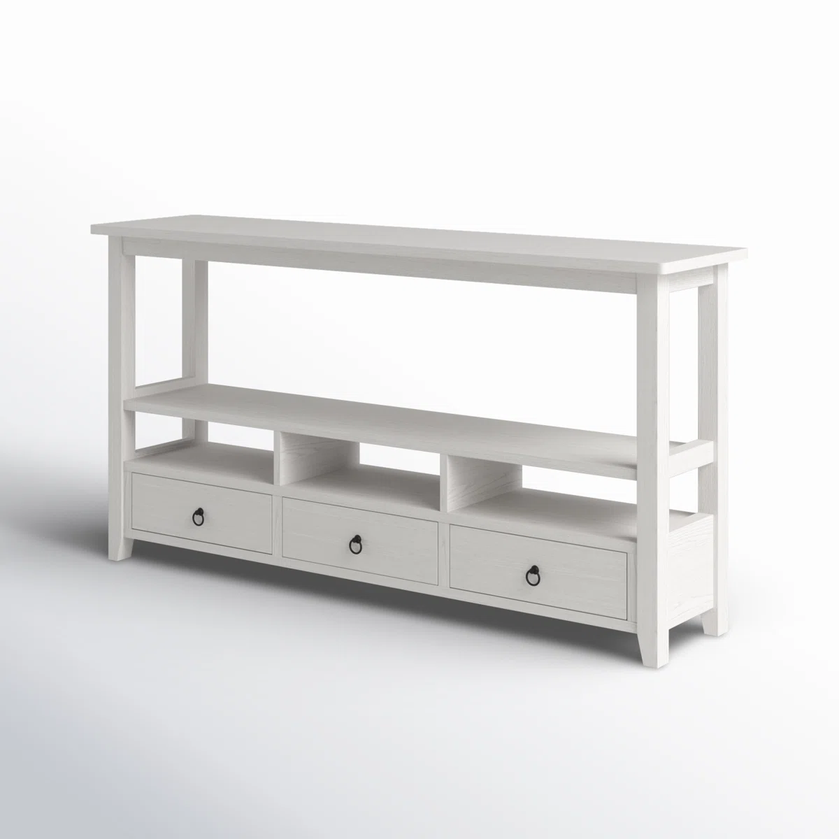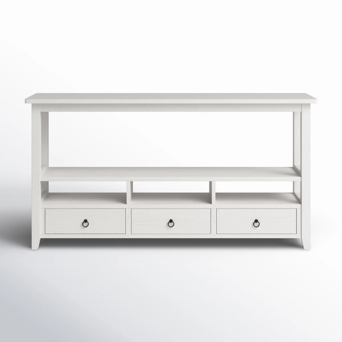 Add both style and function to your home with the Beachcrest Home Meira 57.79" Vintage Solid Console Table. Featuring three drawers and multiple shelves, this entryway table provides practical storage for daily essentials, books, decor, and photo frames. Its rectangular tabletop is perfect for accent lighting or decorative vases. Crafted from durable MDF with a total load capacity exceeding 200 lbs, this versatile console table is ideal for placement in hallways, living rooms, bedrooms, or entryways, blending effortlessly with classic and contemporary interiors.