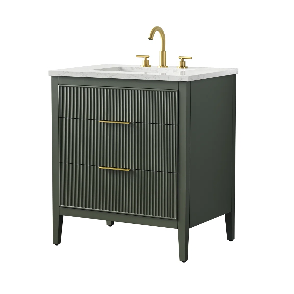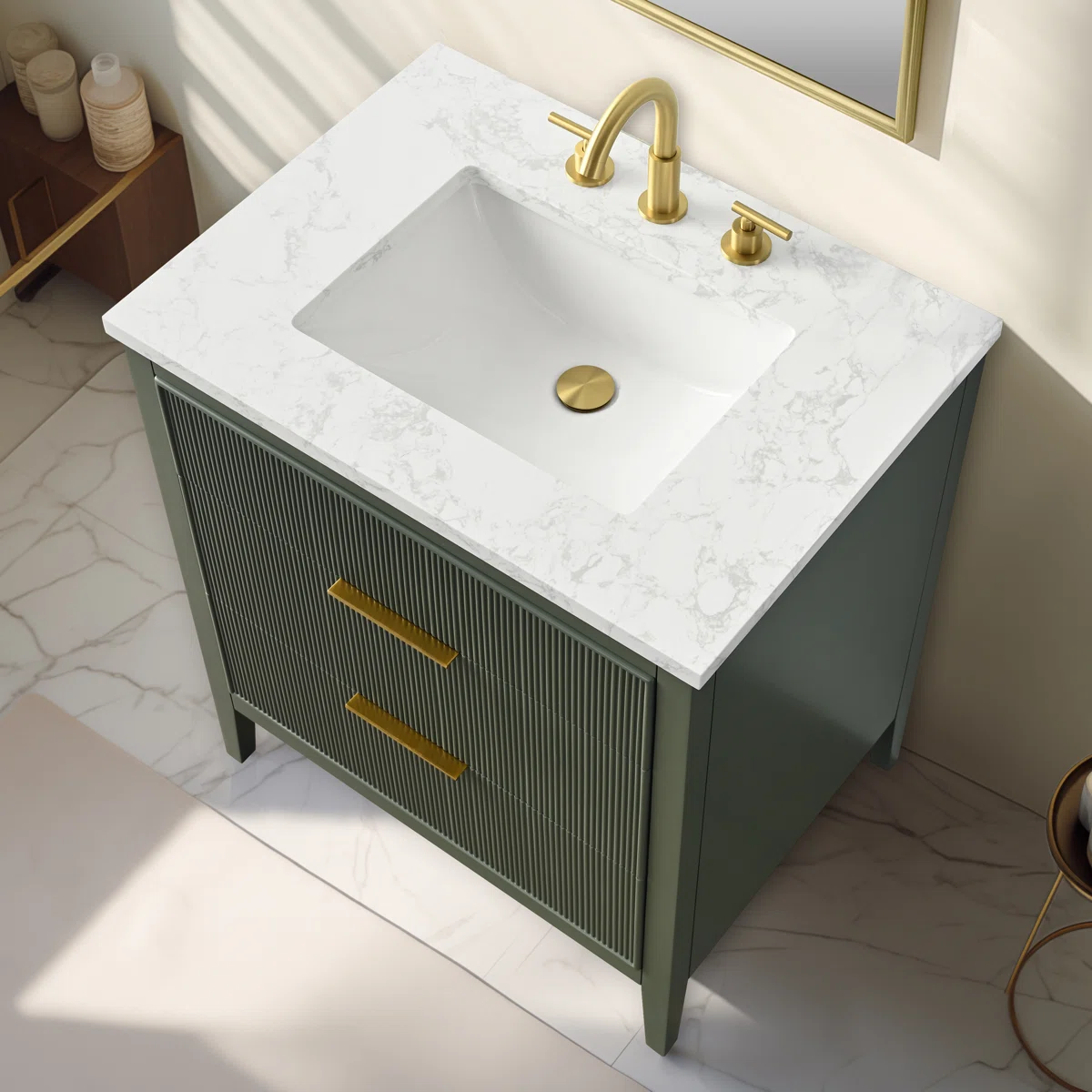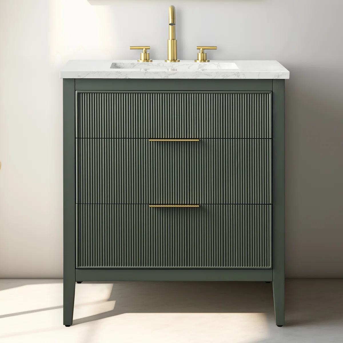 Transform your bathroom into a stylish retreat with the Bilroy Egremt 30" Single Bathroom Vanity, designed for modern functionality and timeless appeal. Featuring a stunning Arabescato engineered stone countertop with a sleek straight-edge finish, this vanity exudes elegance and durability. The fluted cabinet design paired with brushed bronze hardware adds a contemporary touch, while the solid and engineered wood frame ensures long-lasting quality.