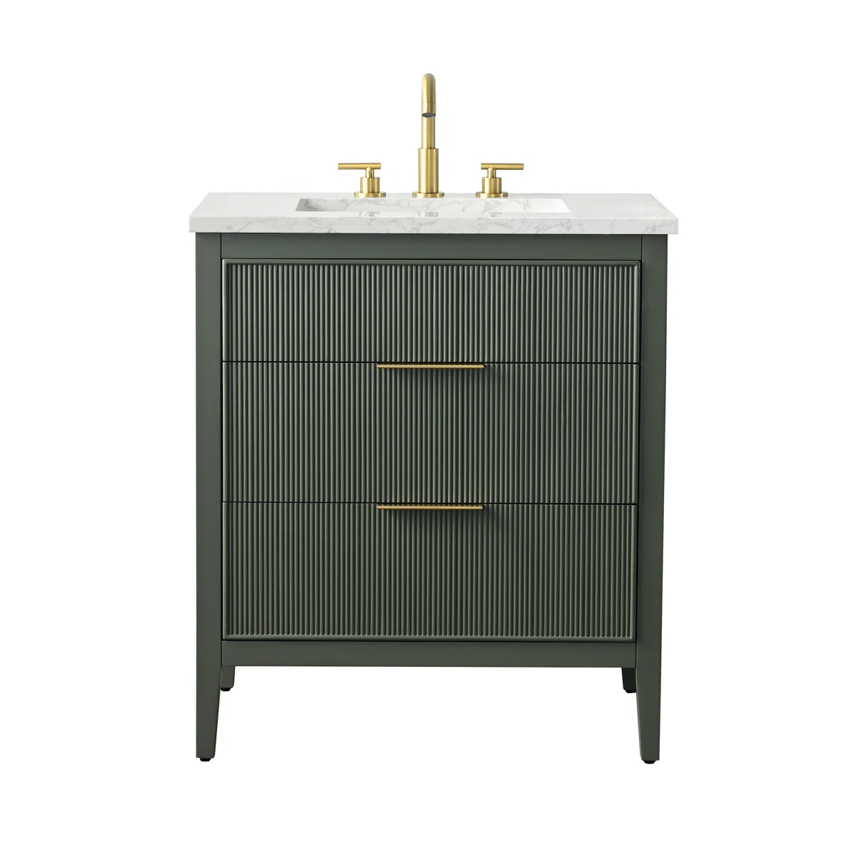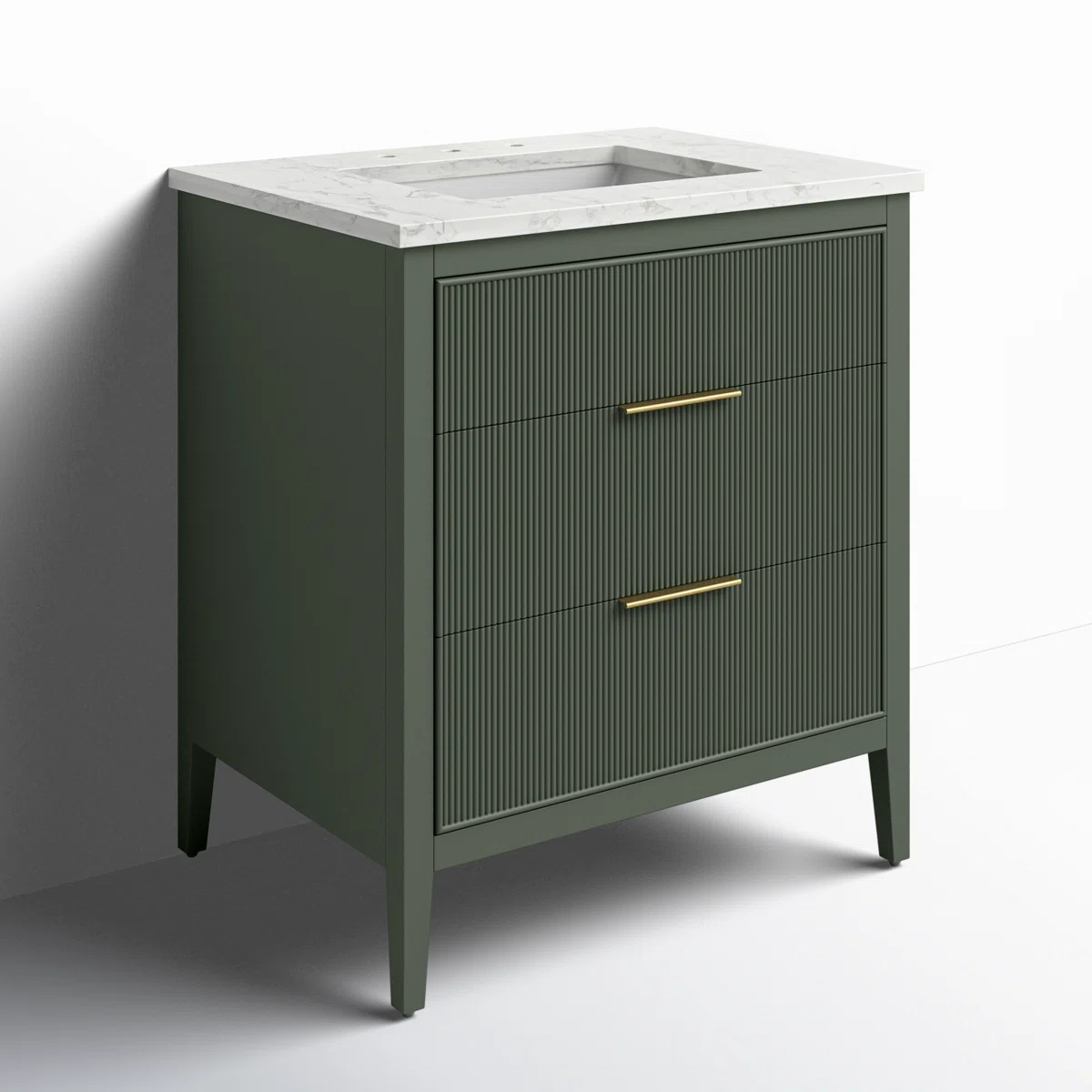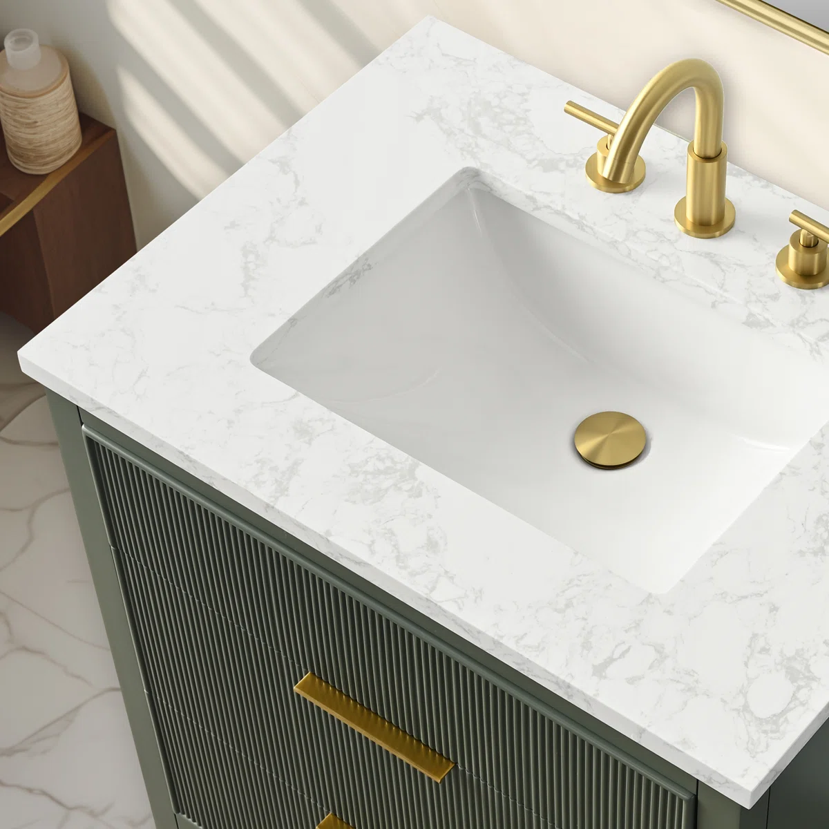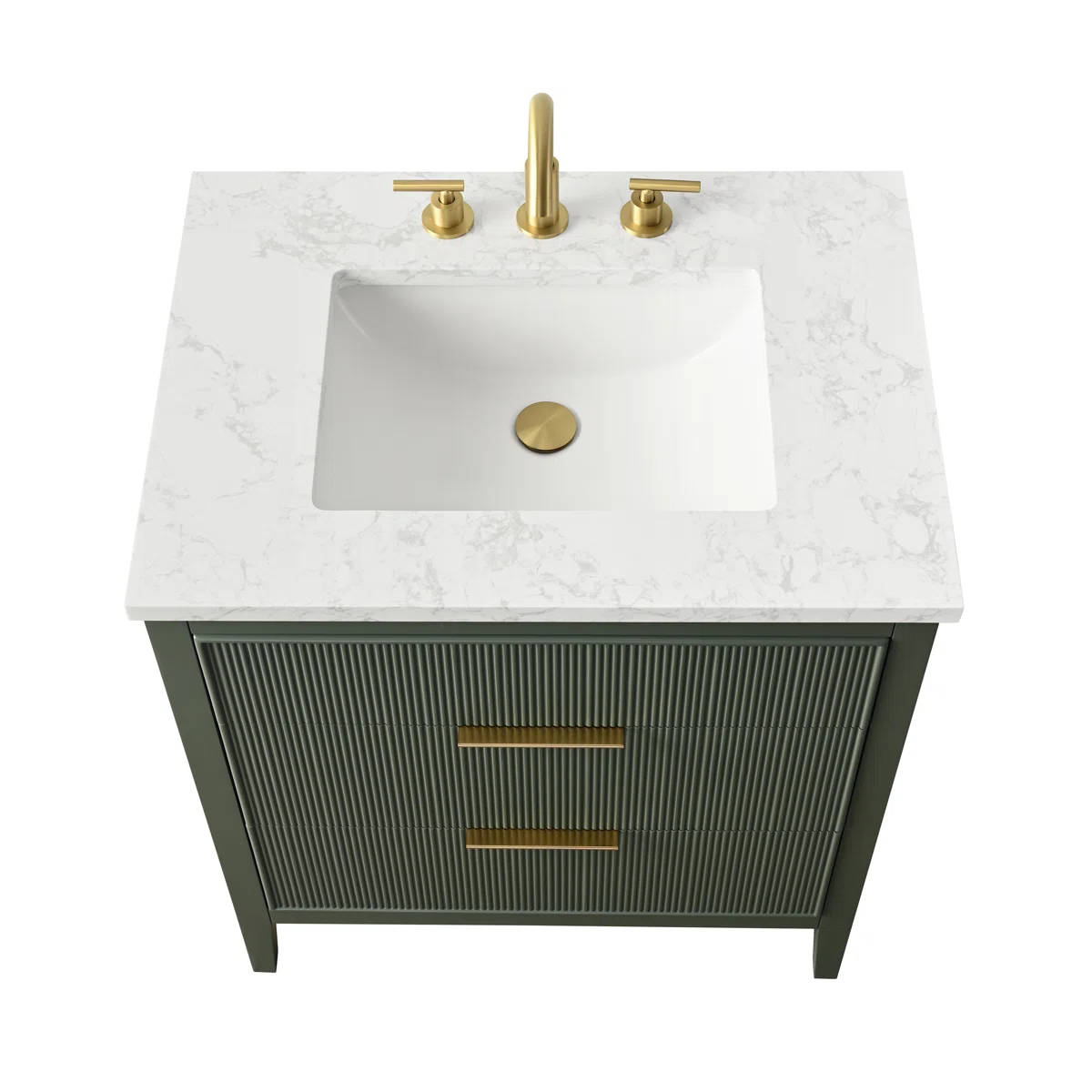 Transform your bathroom into a stylish retreat with the Bilroy Egremt 30" Single Bathroom Vanity, designed for modern functionality and timeless appeal. Featuring a stunning Arabescato engineered stone countertop with a sleek straight-edge finish, this vanity exudes elegance and durability. The fluted cabinet design paired with brushed bronze hardware adds a contemporary touch, while the solid and engineered wood frame ensures long-lasting quality.