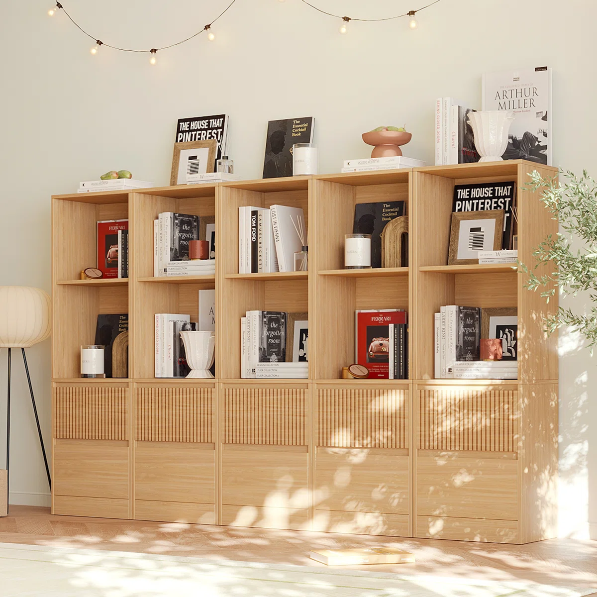 • Minimalist modern bookcase with natural wood-grain finish