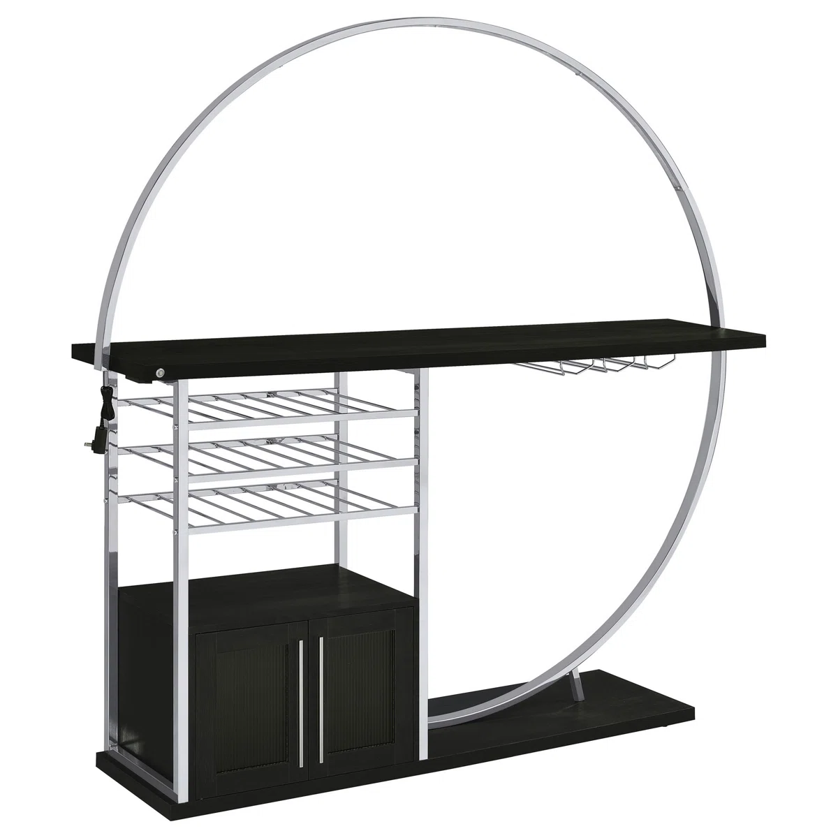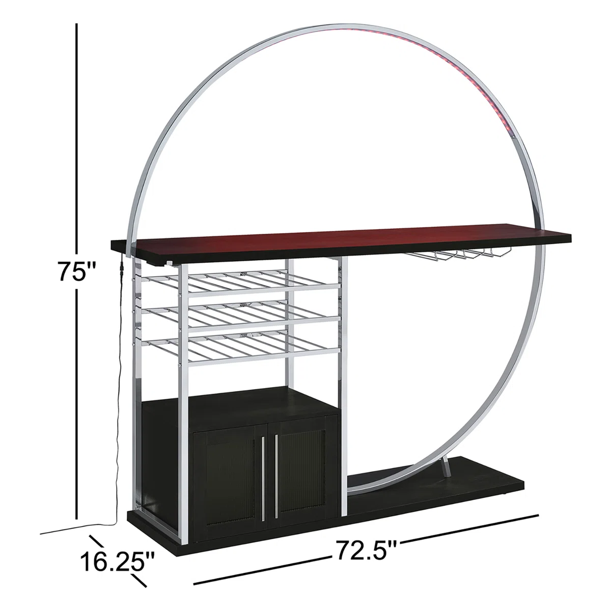 The built-in storage is thoughtfully designed with three tiers that can hold up to 21 wine bottles, a two-door cabinet for hidden essentials, and a convenient stemware rack to keep your glasses within easy reach. Adding to its charm, customizable circular LED lighting with eight vibrant color options lets you set the perfect mood for any gathering.