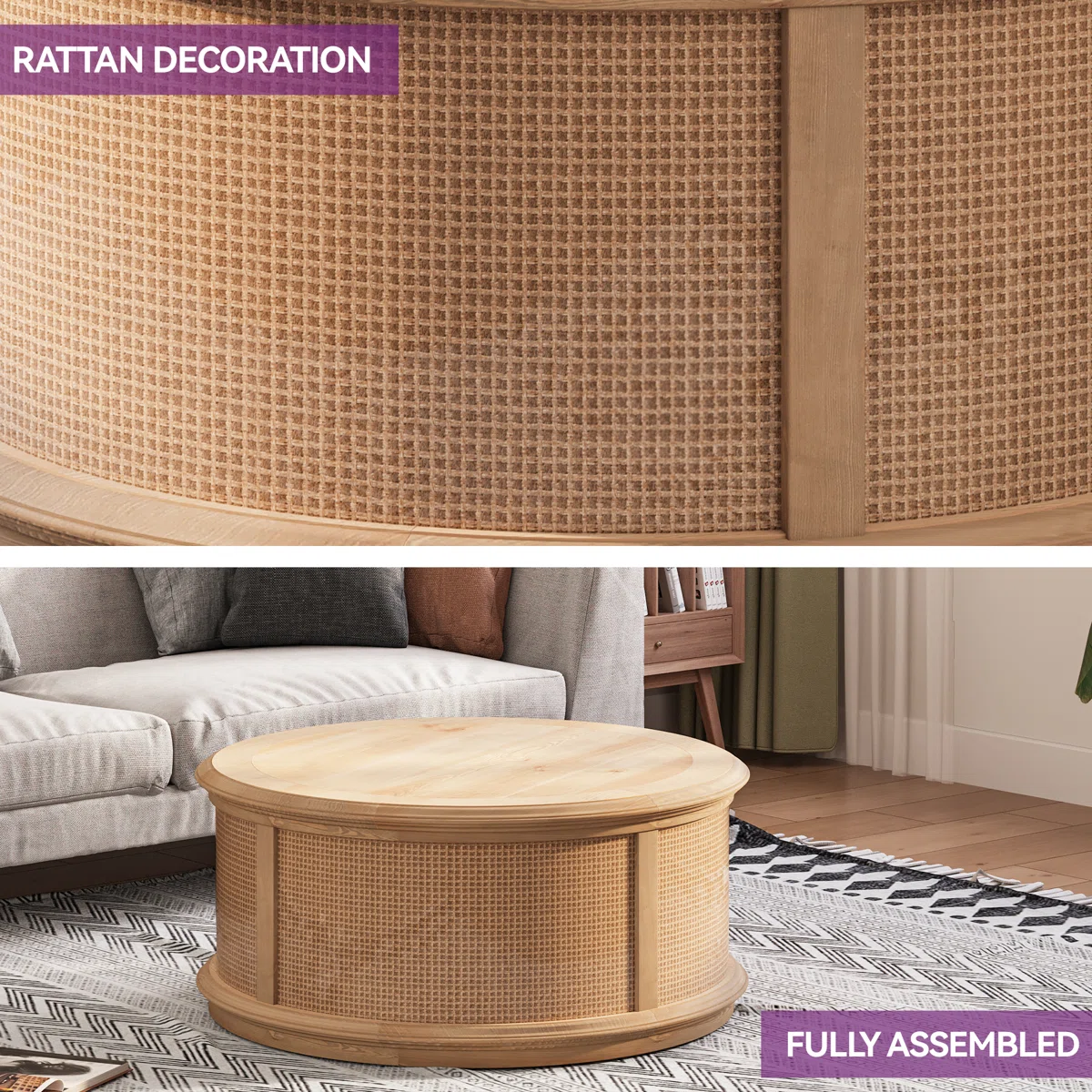 Add functionality and natural charm to your living space with the Britnie Round Rattan Drum Lift-Top Coffee Table. Designed for both style and practicality, this lift-top coffee table lets you comfortably work, dine, or relax from your sofa, while the hidden compartment beneath the top keeps your living area clutter-free. Made from high-quality solid wood and beautifully accented with woven rattan panels, it offers a coastal-inspired look that complements modern, rustic, or boho interiors. Perfect as a center table for living rooms, it combines warm aesthetics with everyday usability—ideal for homes that value both beauty and purpose.