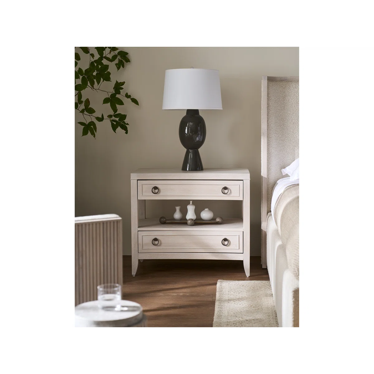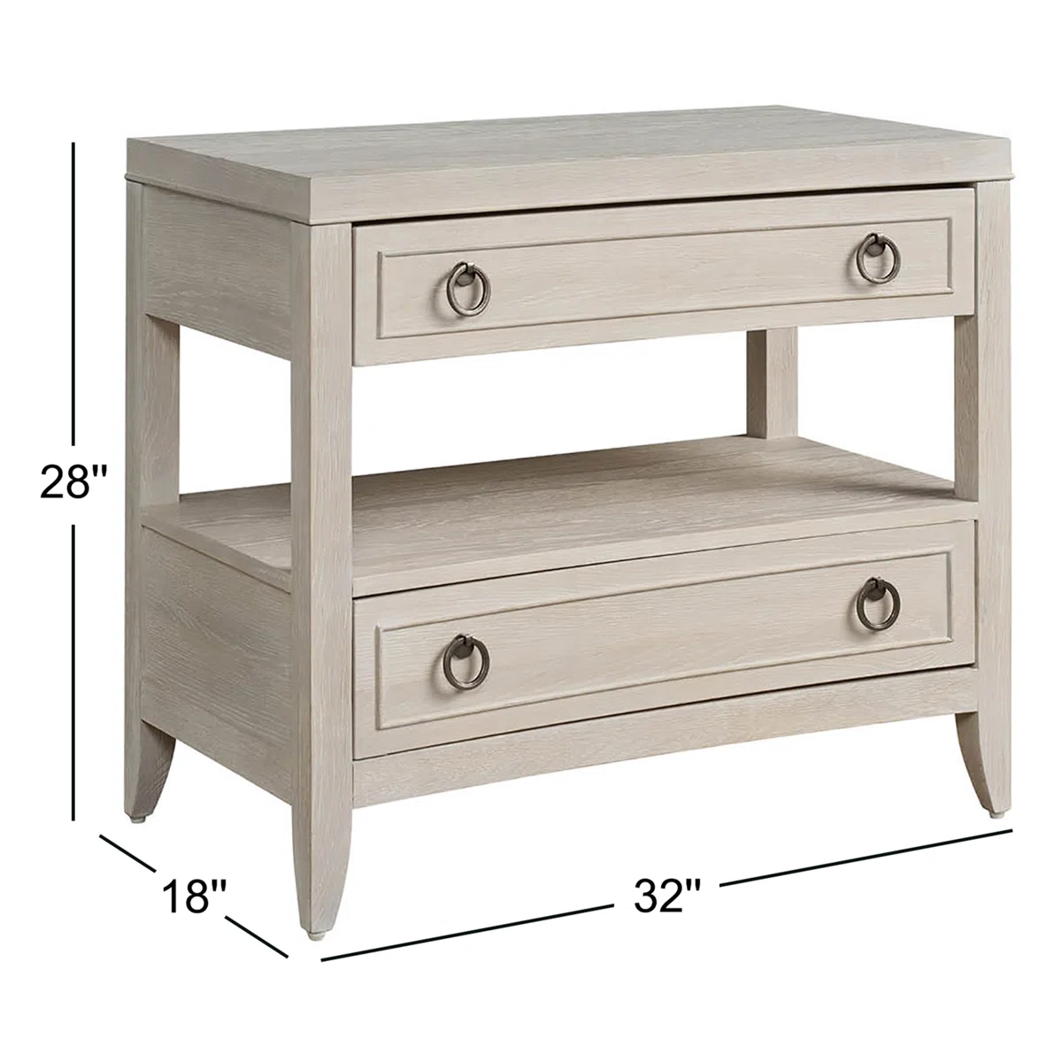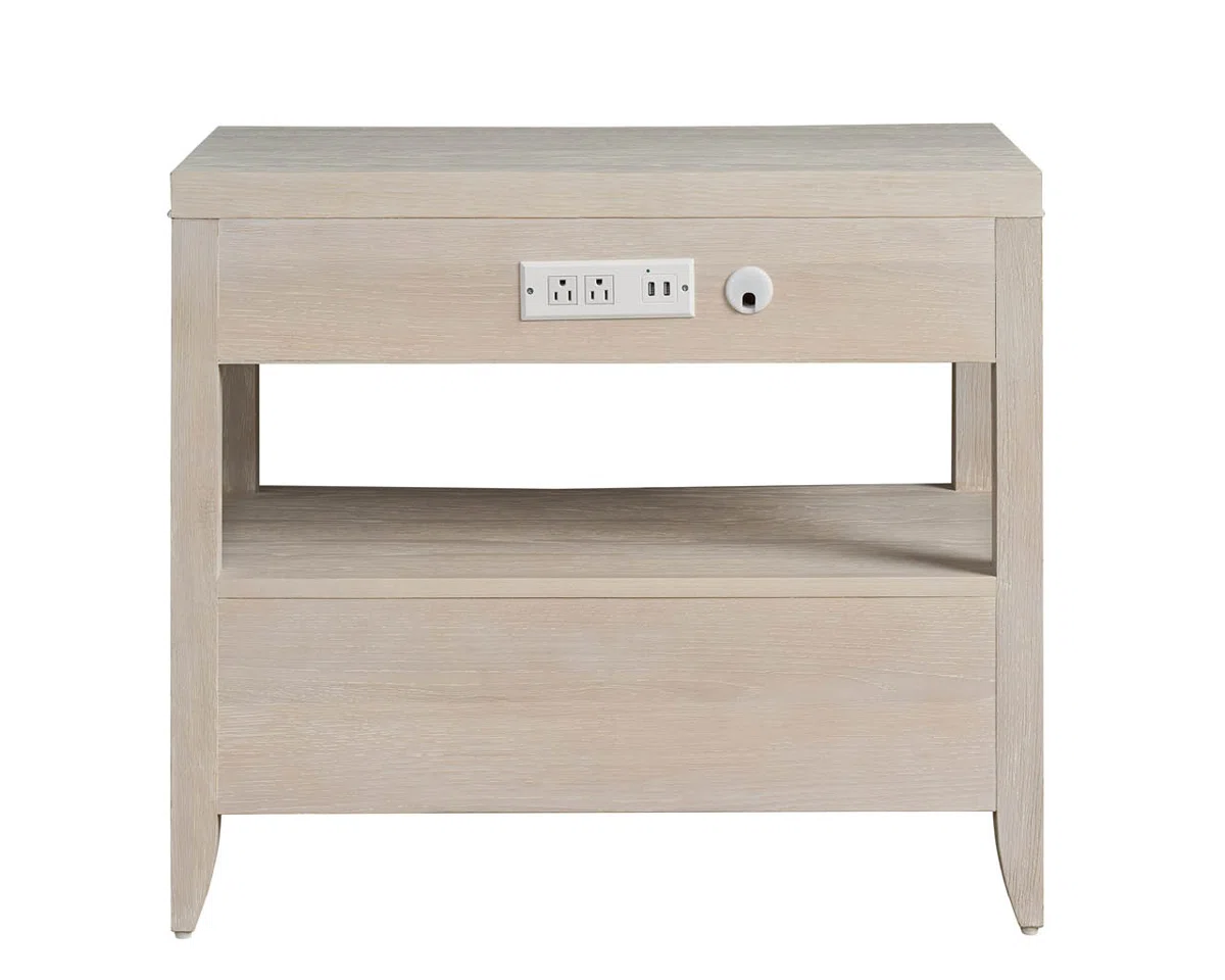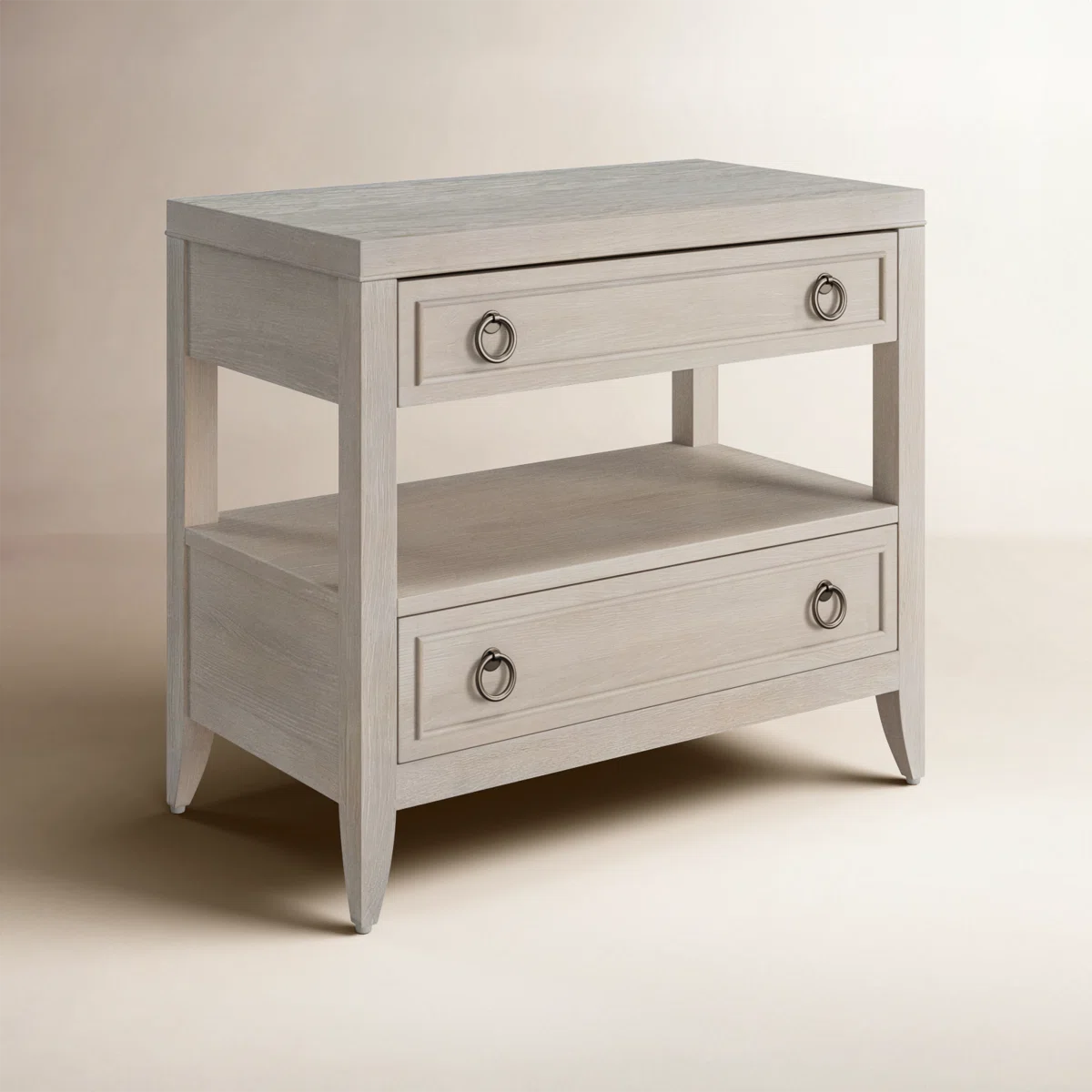 Upgrade your bedroom with the Caterina 2-Drawer Nightstand, a perfect blend of elegance and practicality. Crafted in a sleek white oak finish, this nightstand features two spacious drawers and an open shelf for easy organization of books, devices, or nighttime essentials. Stay powered up with its built-in electrical outlet that includes two USB ports and two standard outlets, making it easy to charge your phone, tablet, or lamp right by your bedside. Designed with metal ring pulls and adjustable levelers for stability, the Caterina nightstand adds both convenience and sophistication to any modern or transitional bedroom.