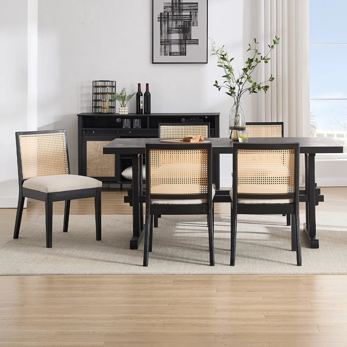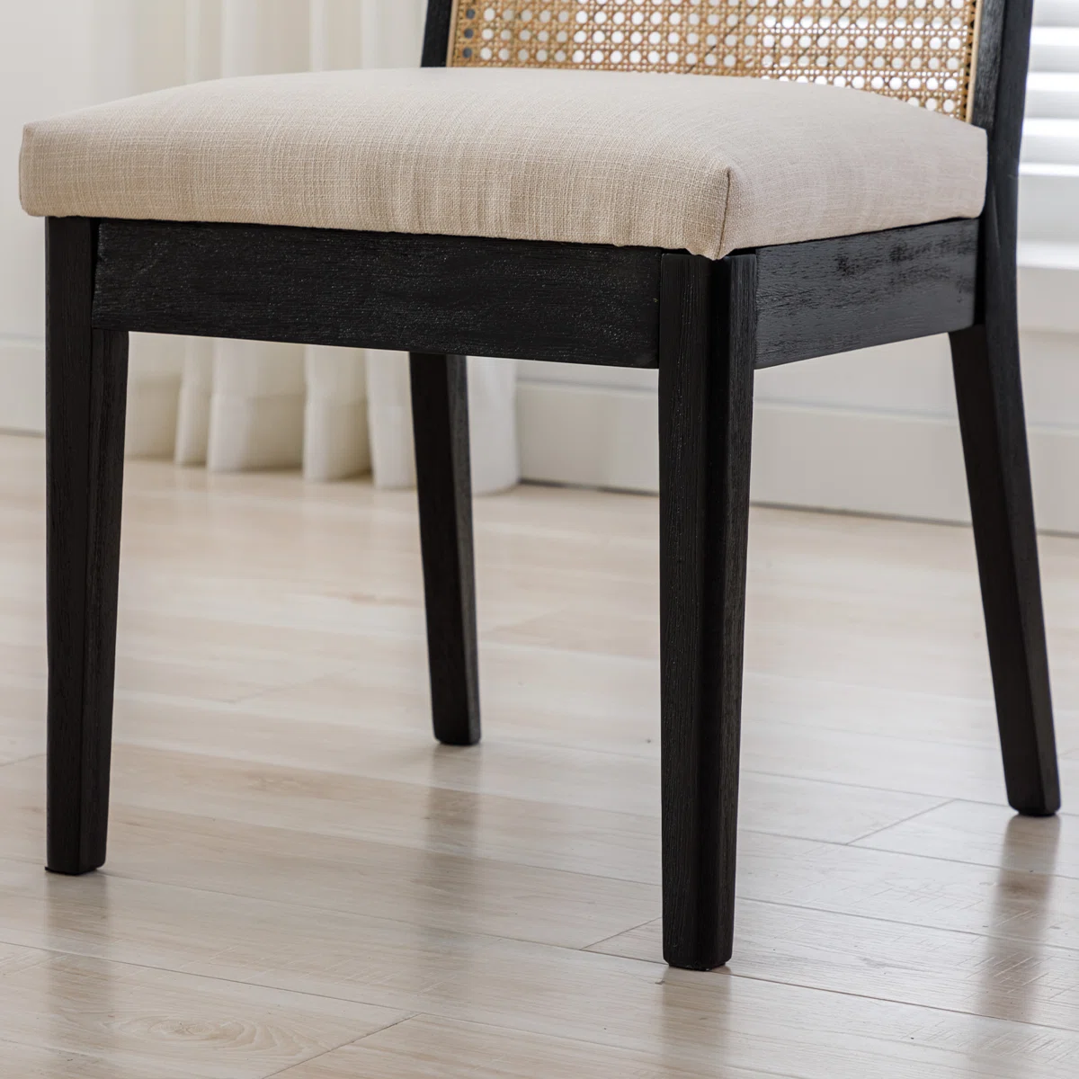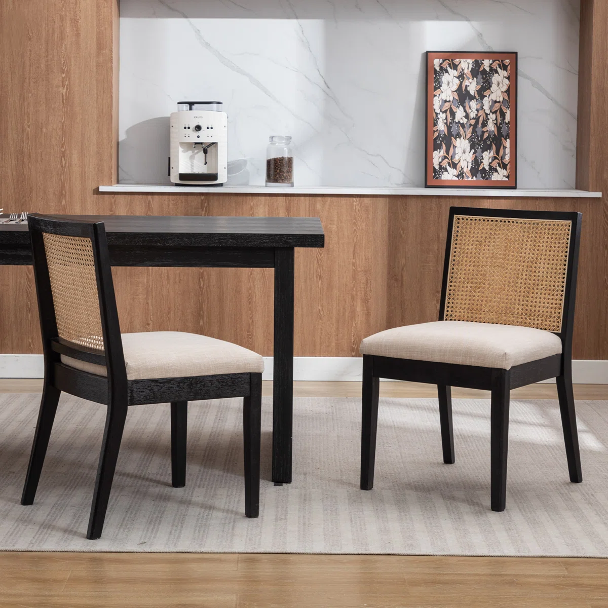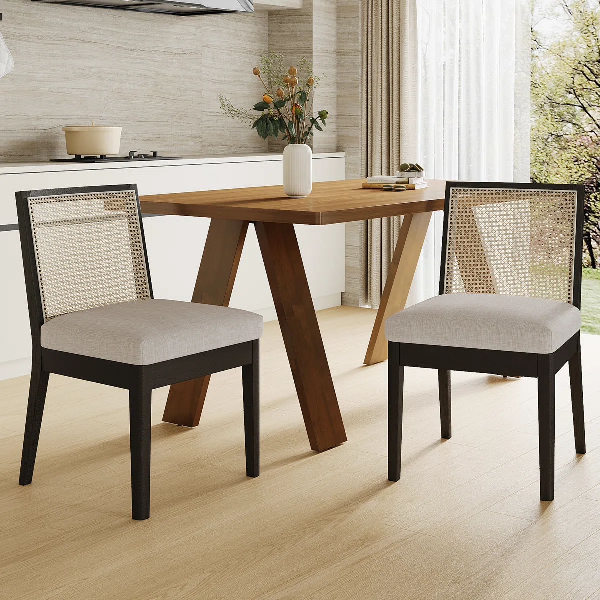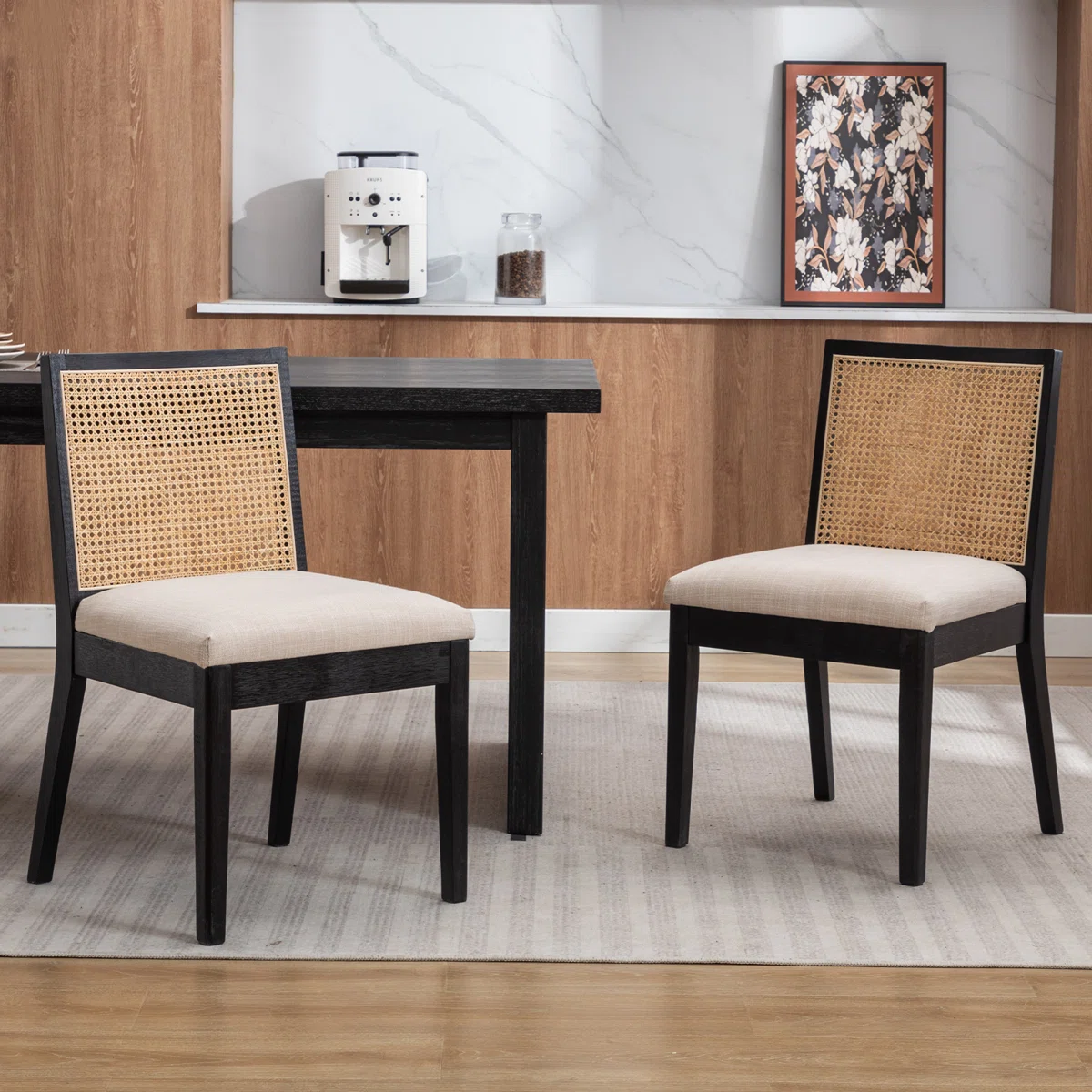 Enhance your dining space with the Arnkell Solid Wood Dining Chairs, where timeless craftsmanship meets modern farmhouse elegance. This set of two chairs is designed with a handcrafted rattan backrest that adds an airy, vintage-inspired charm to any room. Each chair is built from high-quality rubber wood, offering exceptional durability and strength to support up to 300 pounds.