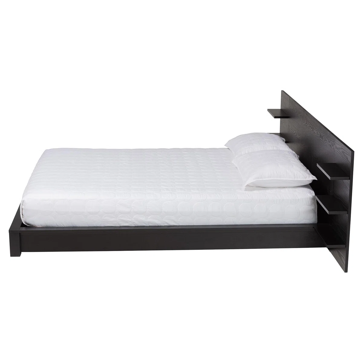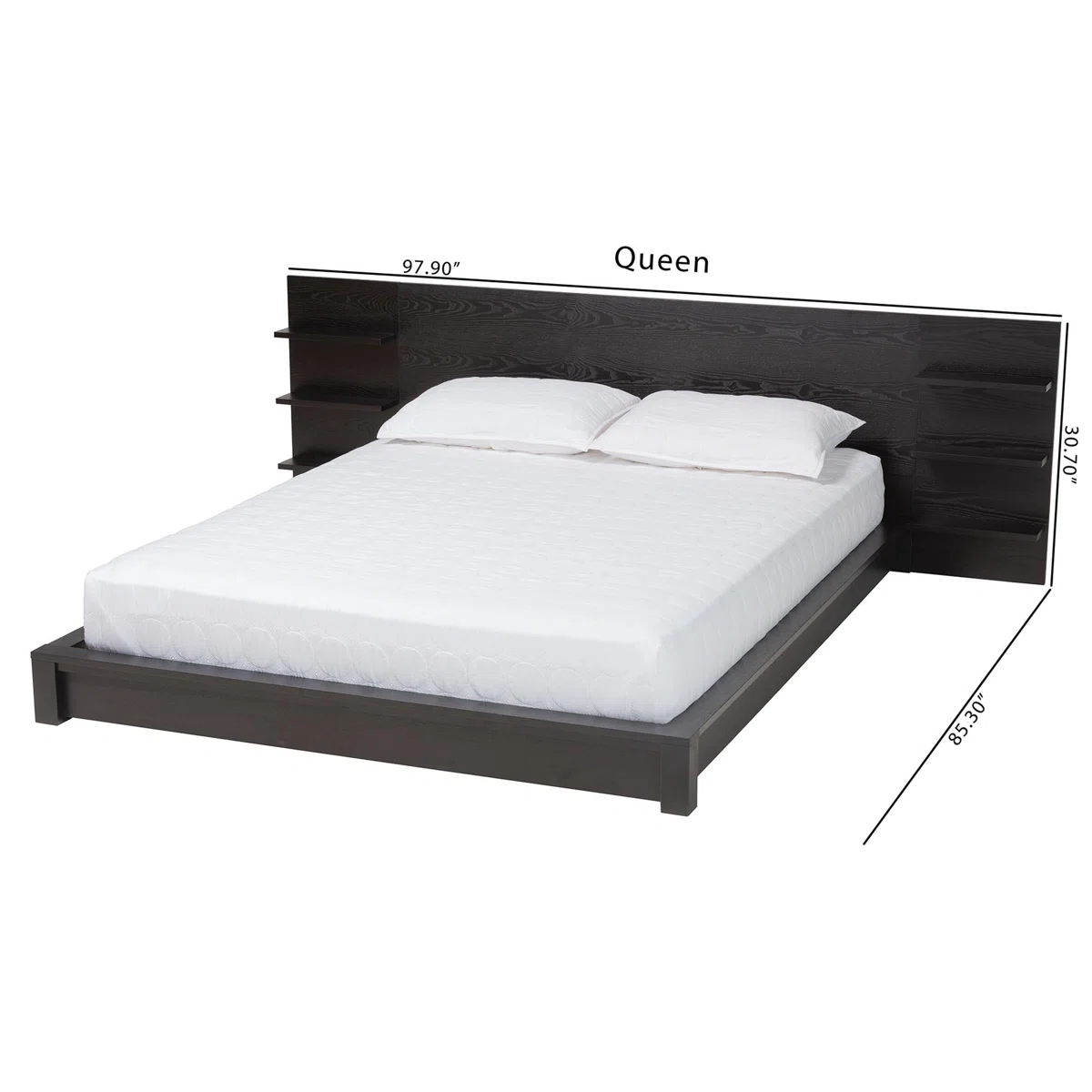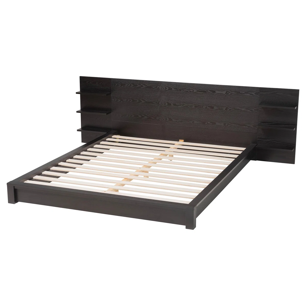 This platform bed features a wide rectangular headboard with three built-in shelves on each side, providing convenient space for books, decor, and essentials—eliminating the need for separate nightstands. The sturdy wood slat system supports your mattress directly, removing the need for a box spring while ensuring optimal comfort and stability.