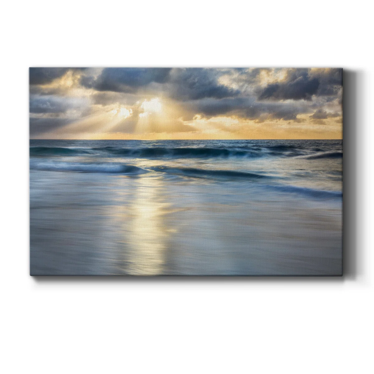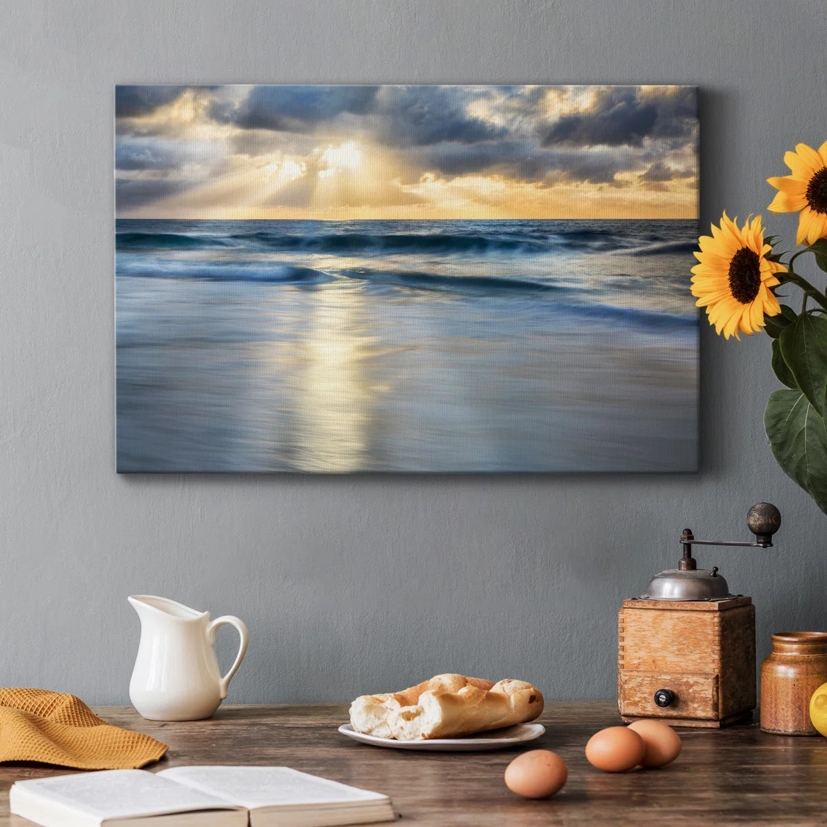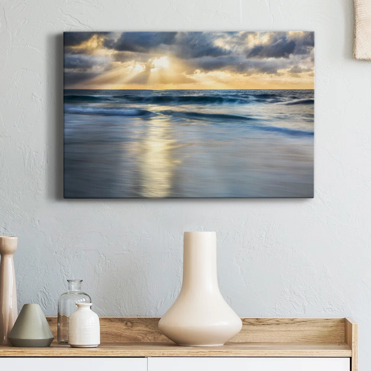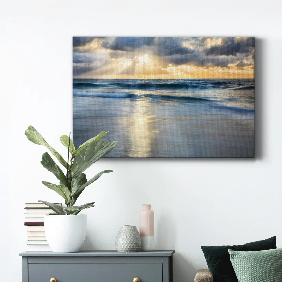 Bring the soothing beauty of the coast into your space with this “Cloudscape Shore” wrapped canvas print. A dramatic seascape at sunset is captured in vivid detail—waves gently breaking on sand beneath a sky of dramatic clouds. Printed on gallery-wrapped canvas with rich giclée inks, this piece offers a refined finish that’s ready to hang and adds depth and movement to any wall. Ideal for a living room, bedroom, office, or hallway, it blends modern elegance with natural charm.