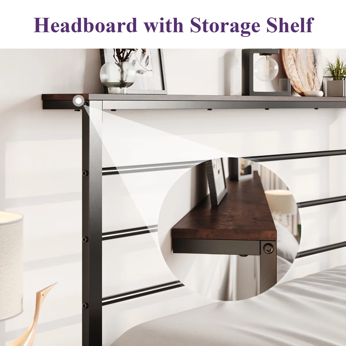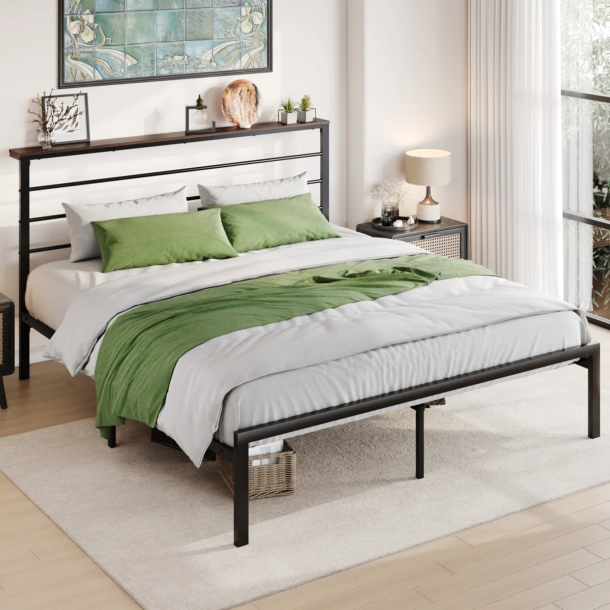 The Daquona Metal Storage Bed Frame by Ebern Designs combines sleek modern style with practical functionality for any bedroom. Crafted from durable metal with a neutral finish, this platform bed features a built-in headboard shelf to keep essentials close at hand, from books to nighttime devices.