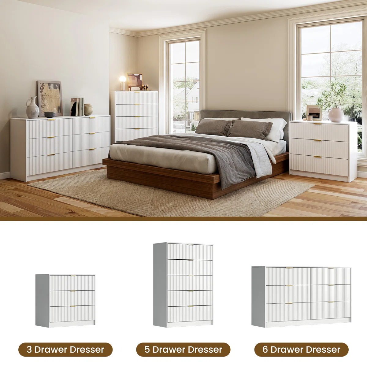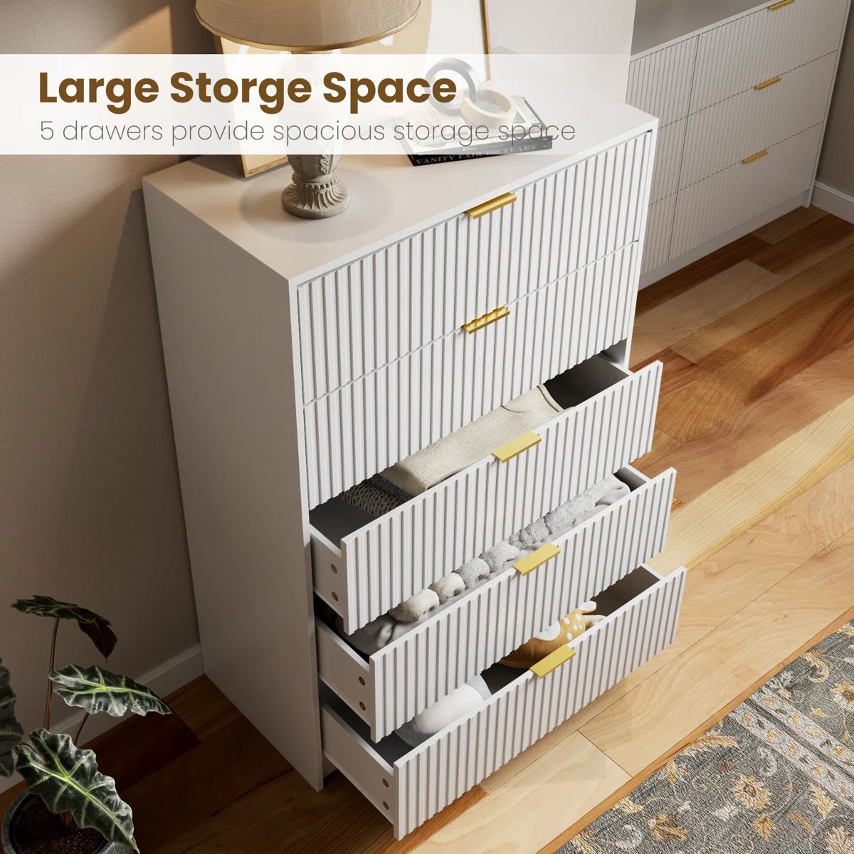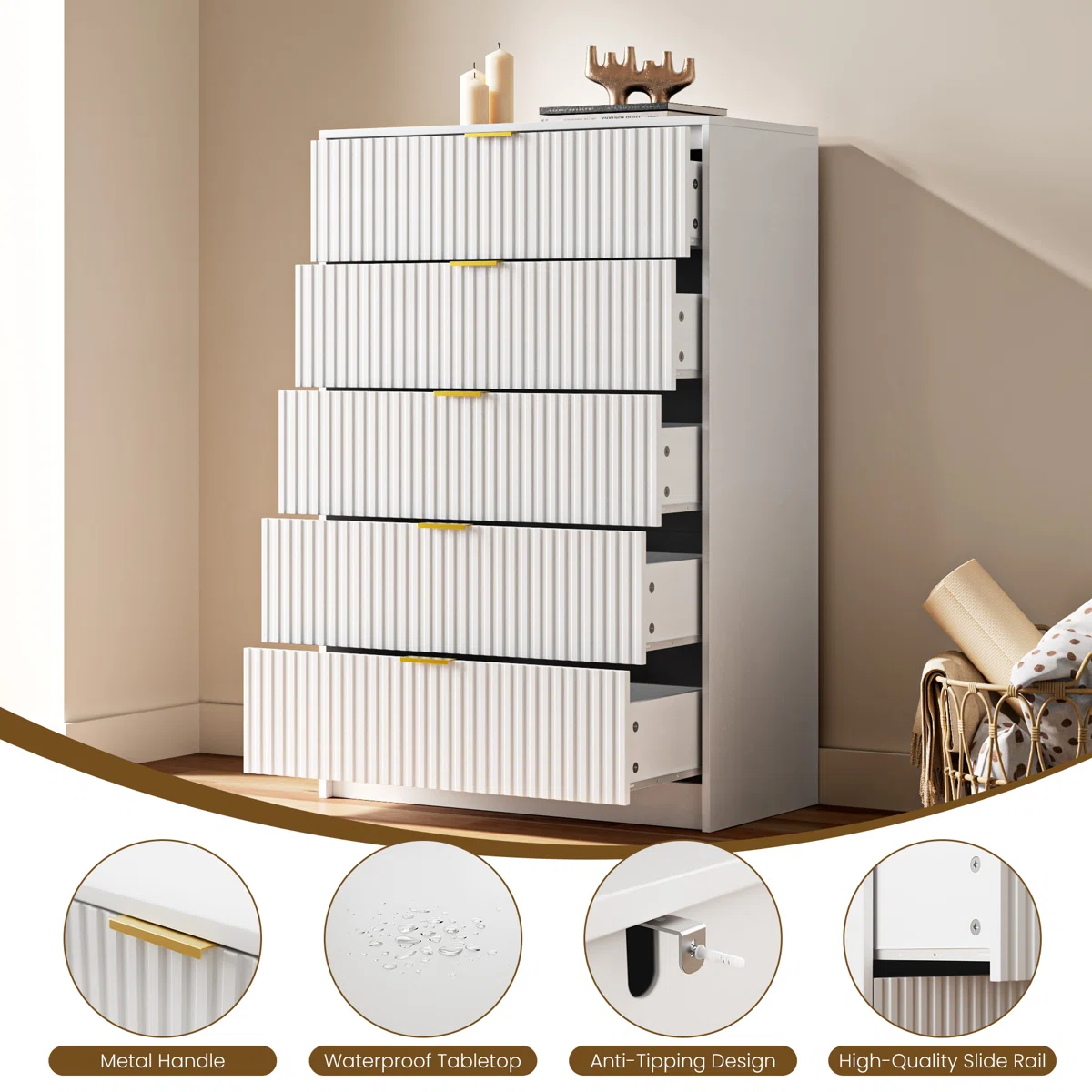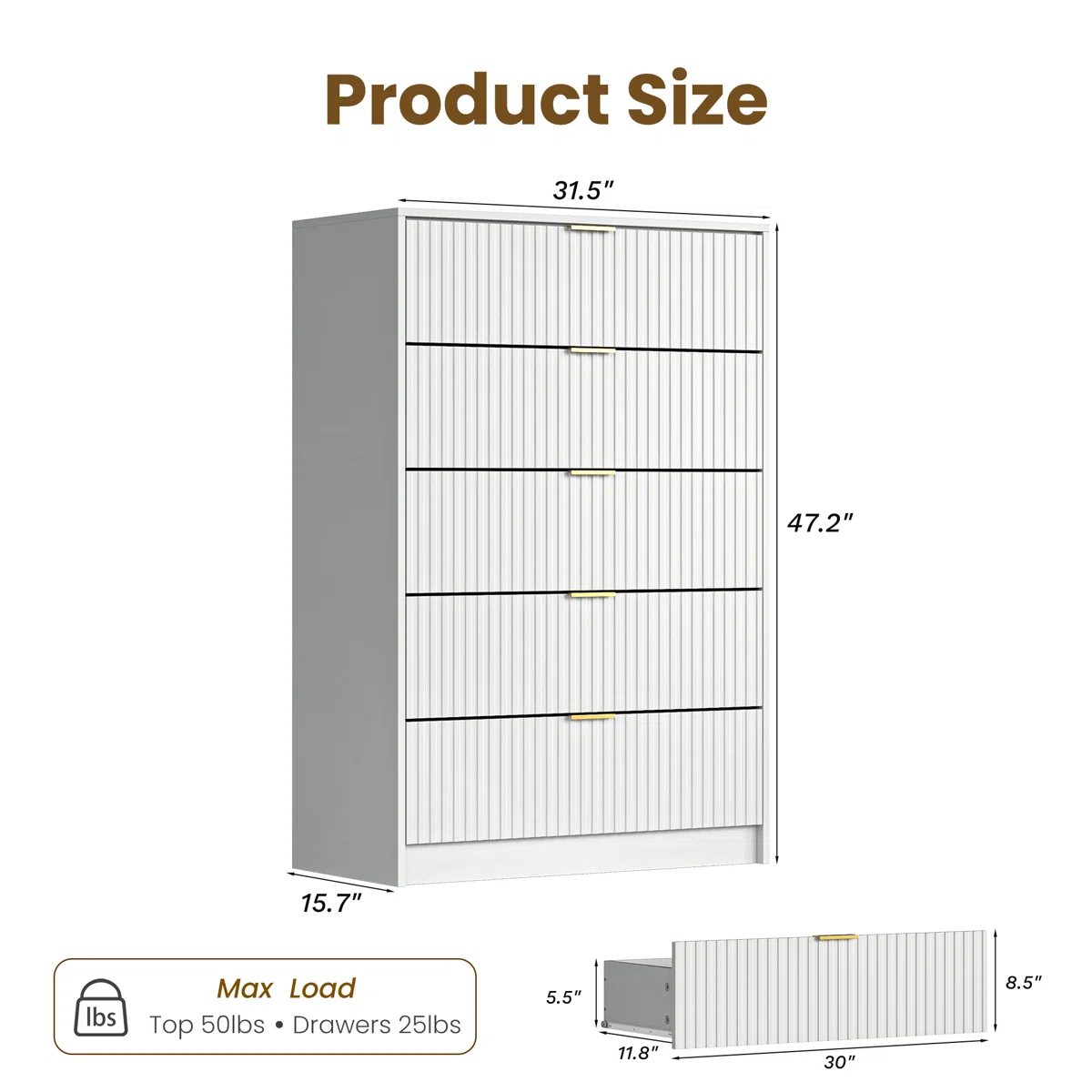 Organize your bedroom with the Ebern Designs 5-Drawer White Dresser, standing at 47.2" H and offering ample storage space for clothing, linens, and personal items. Its clean white finish and modern design make it a versatile addition to any bedroom décor, combining functionality with a contemporary aesthetic.
