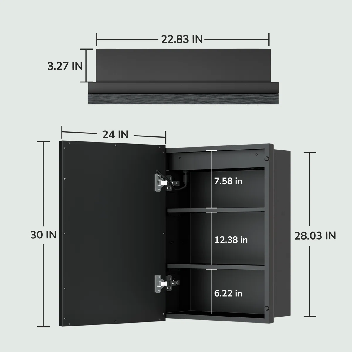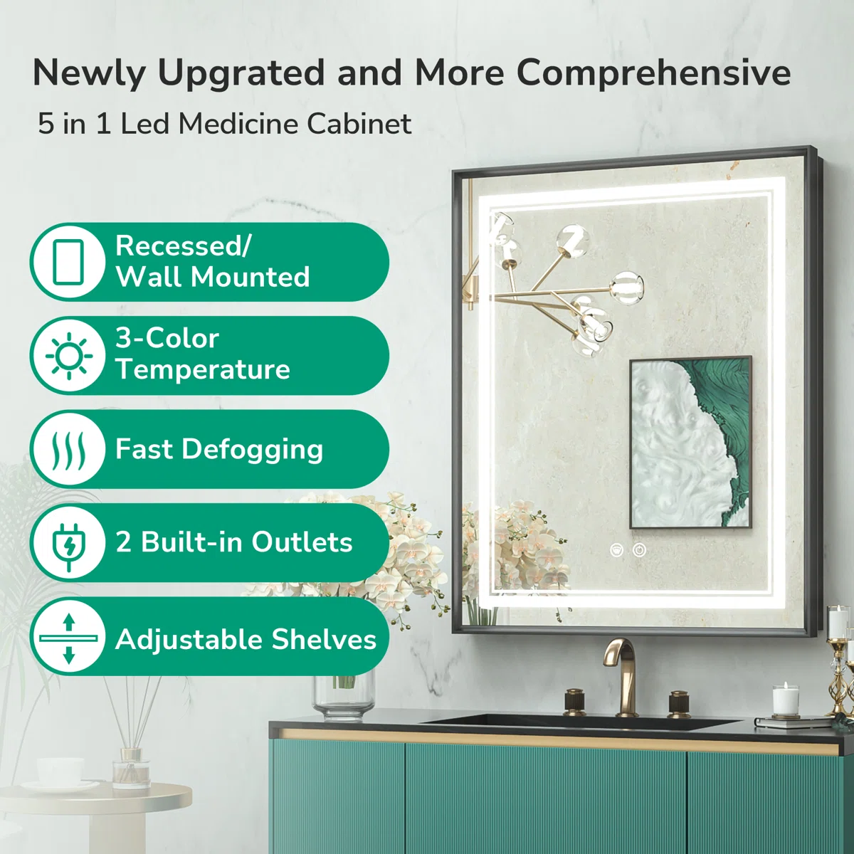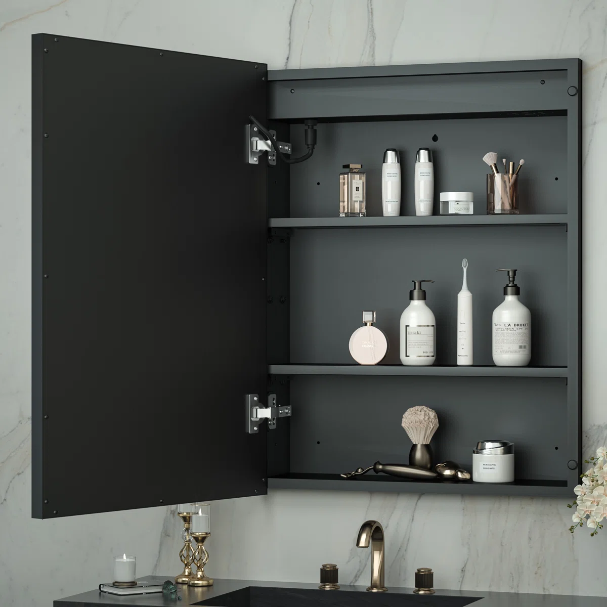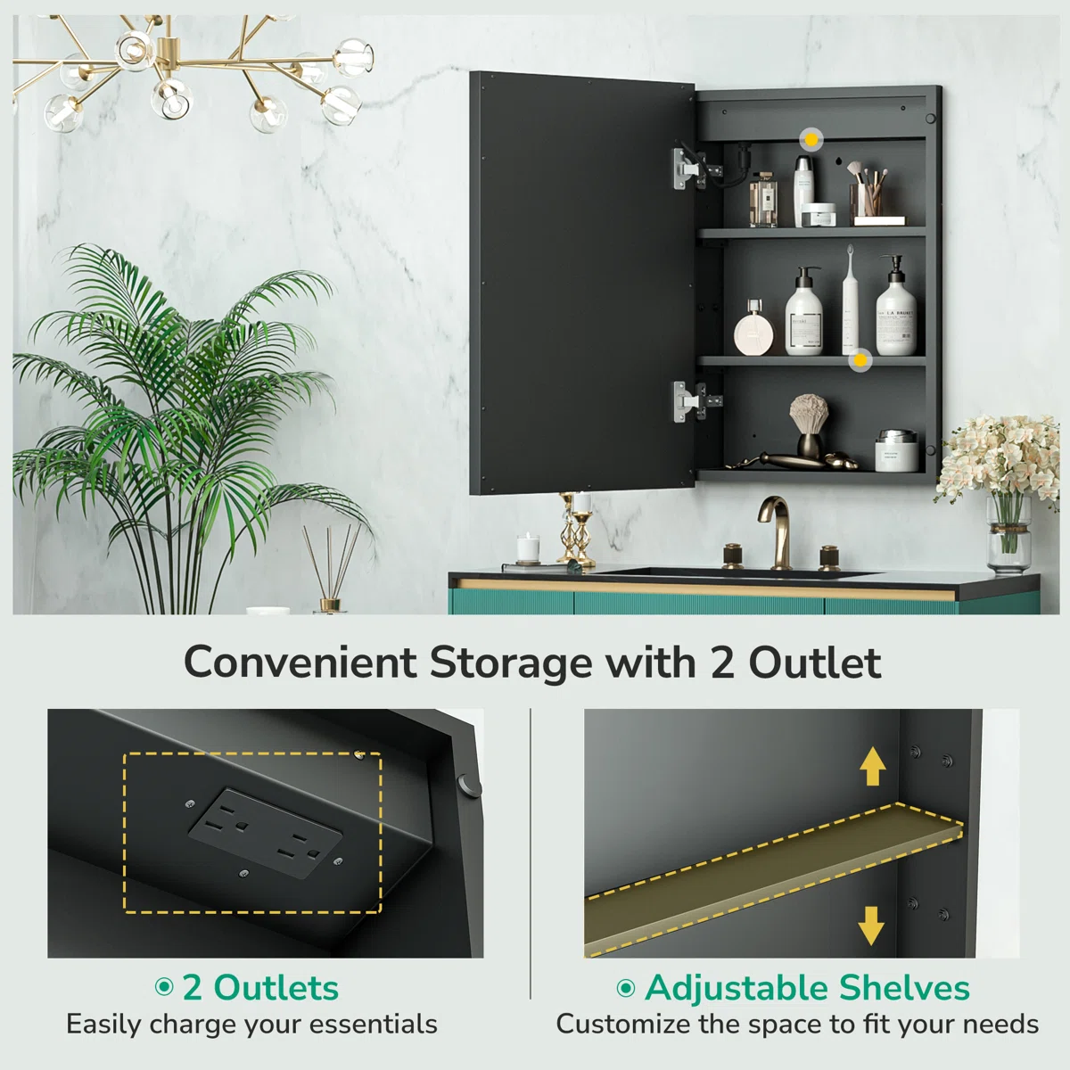 Upgrade your bathroom with the Ebern Designs Kassady LED Lighted Medicine Cabinet, combining functionality and style in a sleek black frame. Measuring 30" H x 24" W x 4" D, this modern cabinet can be recessed or surface-mounted, offering flexible installation options. It features 3-color LED lighting, dual power outlets, and a built-in defogger for convenience. Perfect for contemporary bathrooms seeking enhanced lighting, organization, and sophistication.