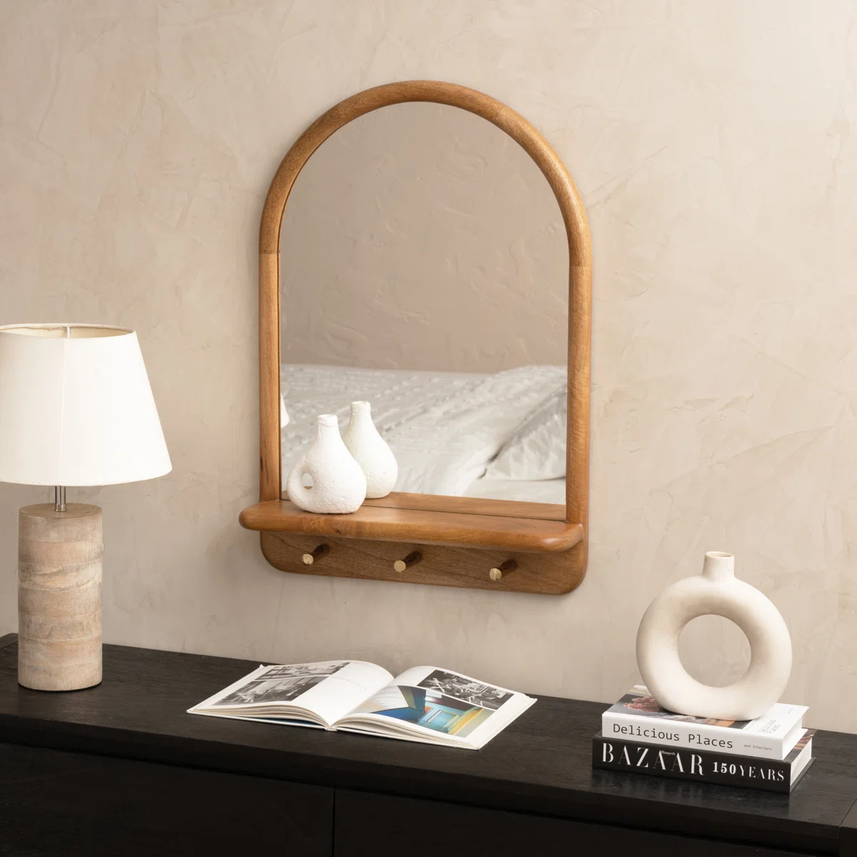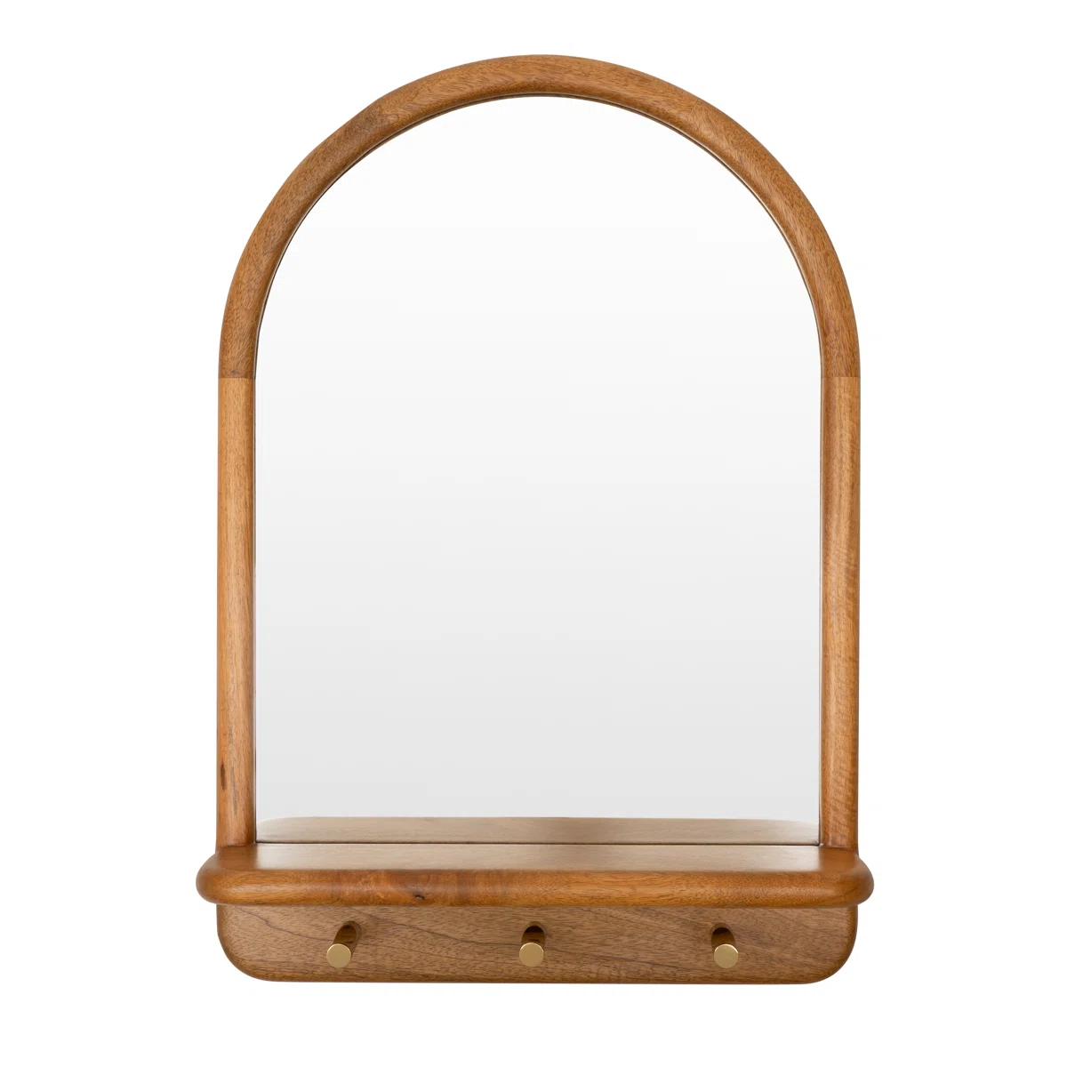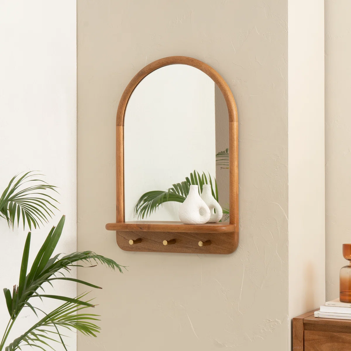 A mirror that serves looks & functionality–together? We’ve got it covered. Meet our mid-modern mirror that is perfect to be used in any room. Kiln-dried wood all over, it’s thick rounded frame & clear glass is paired with a sturdy shelf & gold plated pegs for extra utility. Hang your keys, coats & bags or perch your wallets, phones & potted plants, this mirror can do it all.