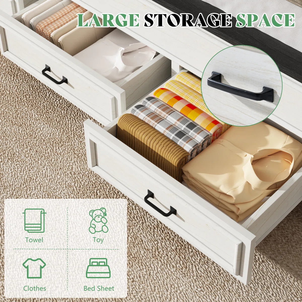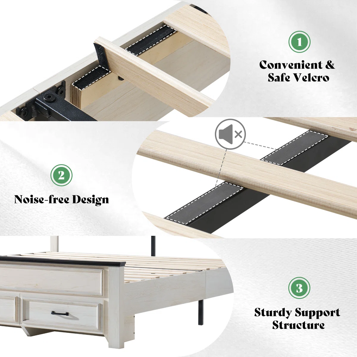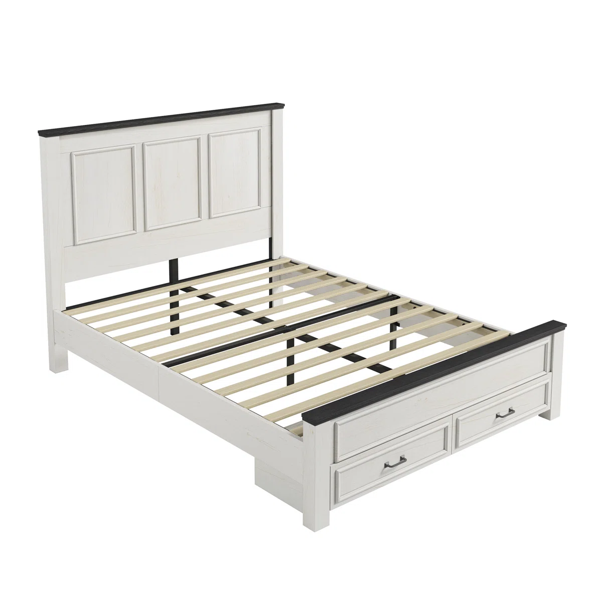 Designed for both style and storage, the bed includes spacious under-bed drawers that keep your space tidy and organized — ideal for linens, clothing, or seasonal essentials. The white rustic finish complements any decor, from classic to contemporary, creating a cozy and inviting atmosphere.