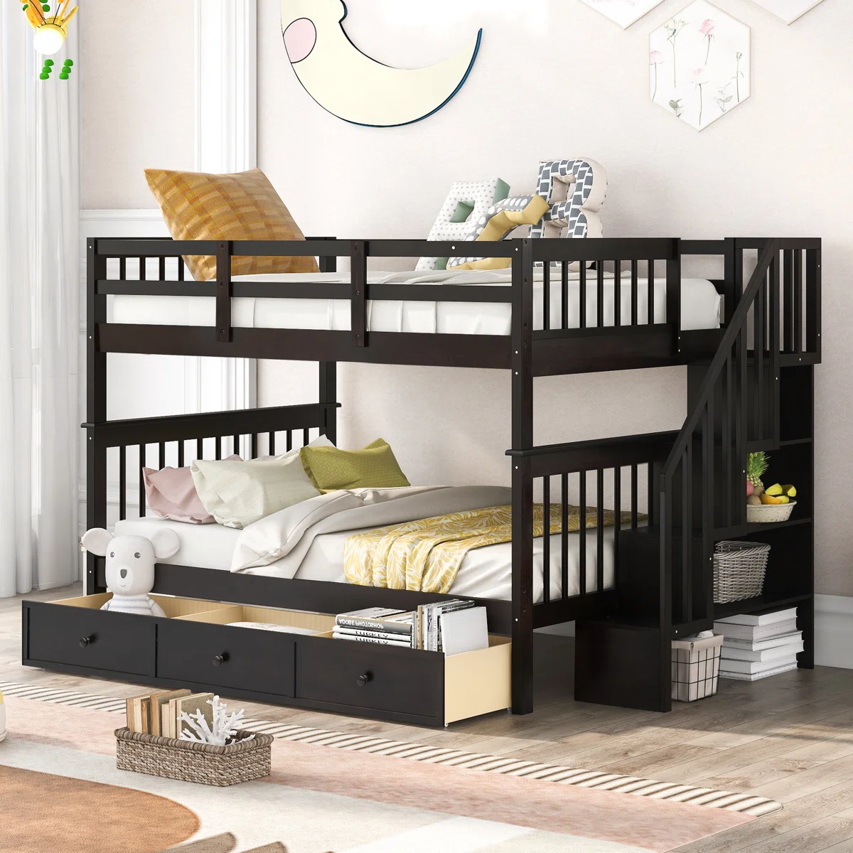 • Includes drawers, shelves, detachable guardrails, bookcase, built-in stairs, and slat kit