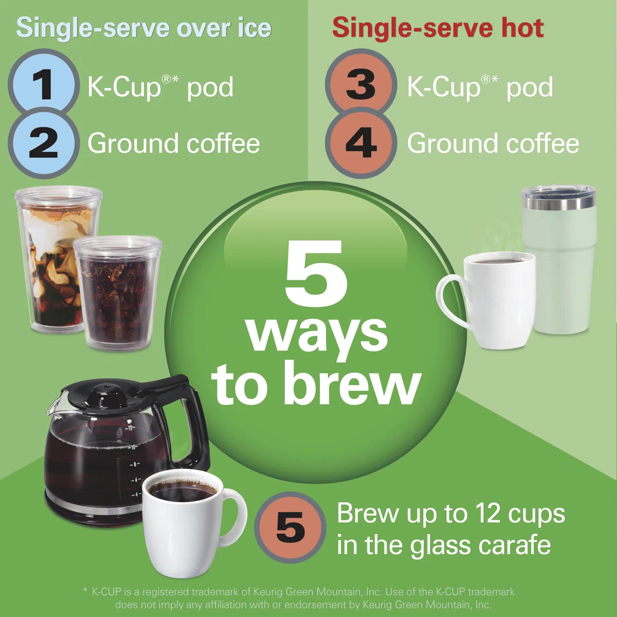 • 5 ways to brew: single cup hot or iced, K-Cup® pods, ground coffee, or 12-cup carafe