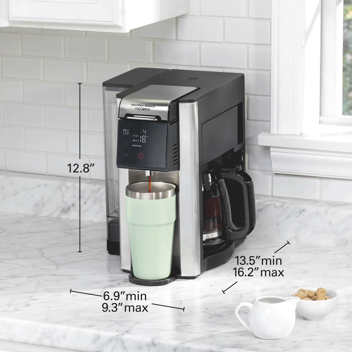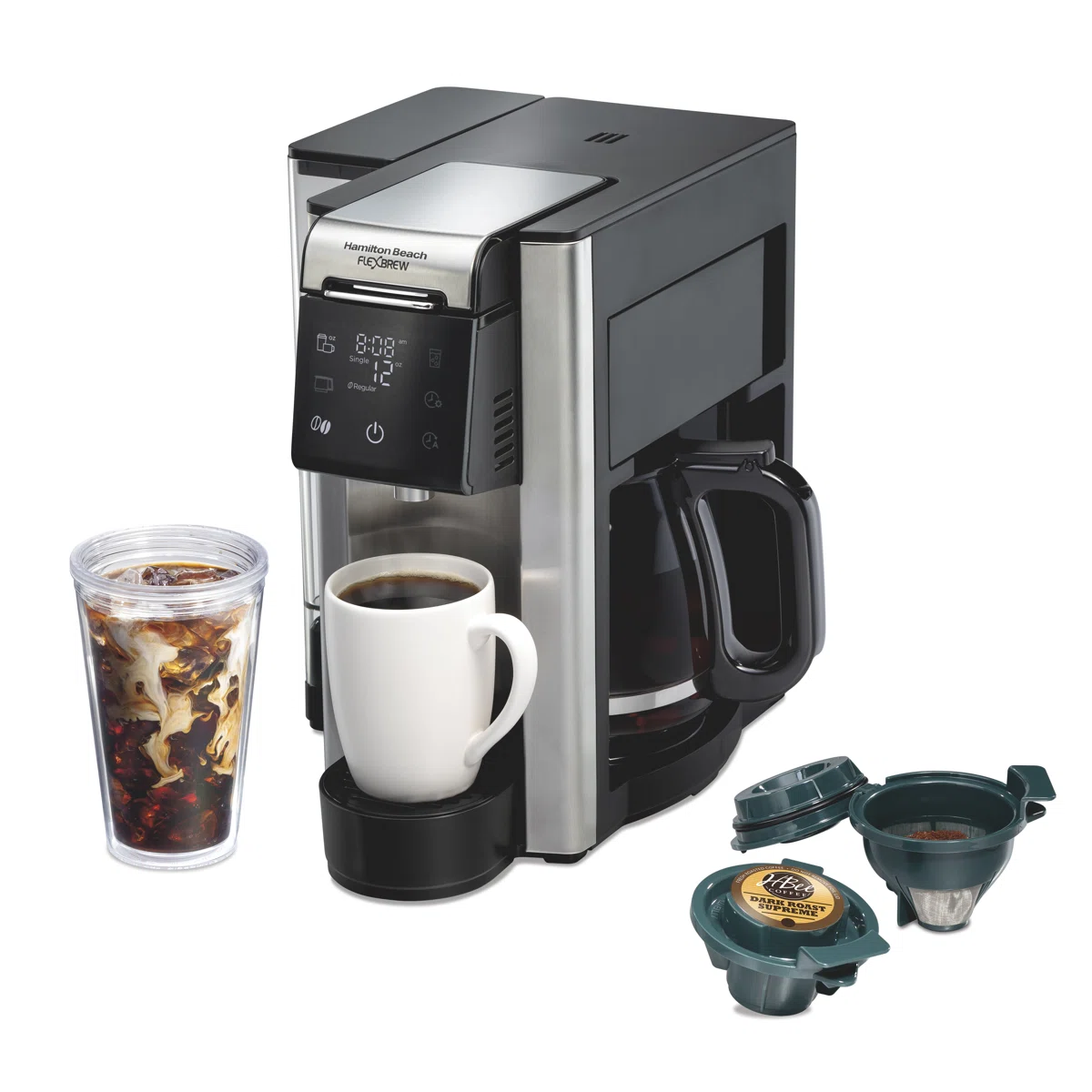 The Hamilton Beach FlexBrew Advanced 5-in-1 Coffee Maker offers versatile brewing options for every coffee lover. Brew a single hot or iced cup with K-Cup® pods or ground coffee, or make up to 12 cups in the carafe. With a dual-position 60 oz. water reservoir, touchscreen controls, and Auto Brew functionality, this coffee maker fits any kitchen while providing a fast, customizable brewing experience. Compact, space-saving, and easy to use, it’s perfect for busy mornings and small kitchens.