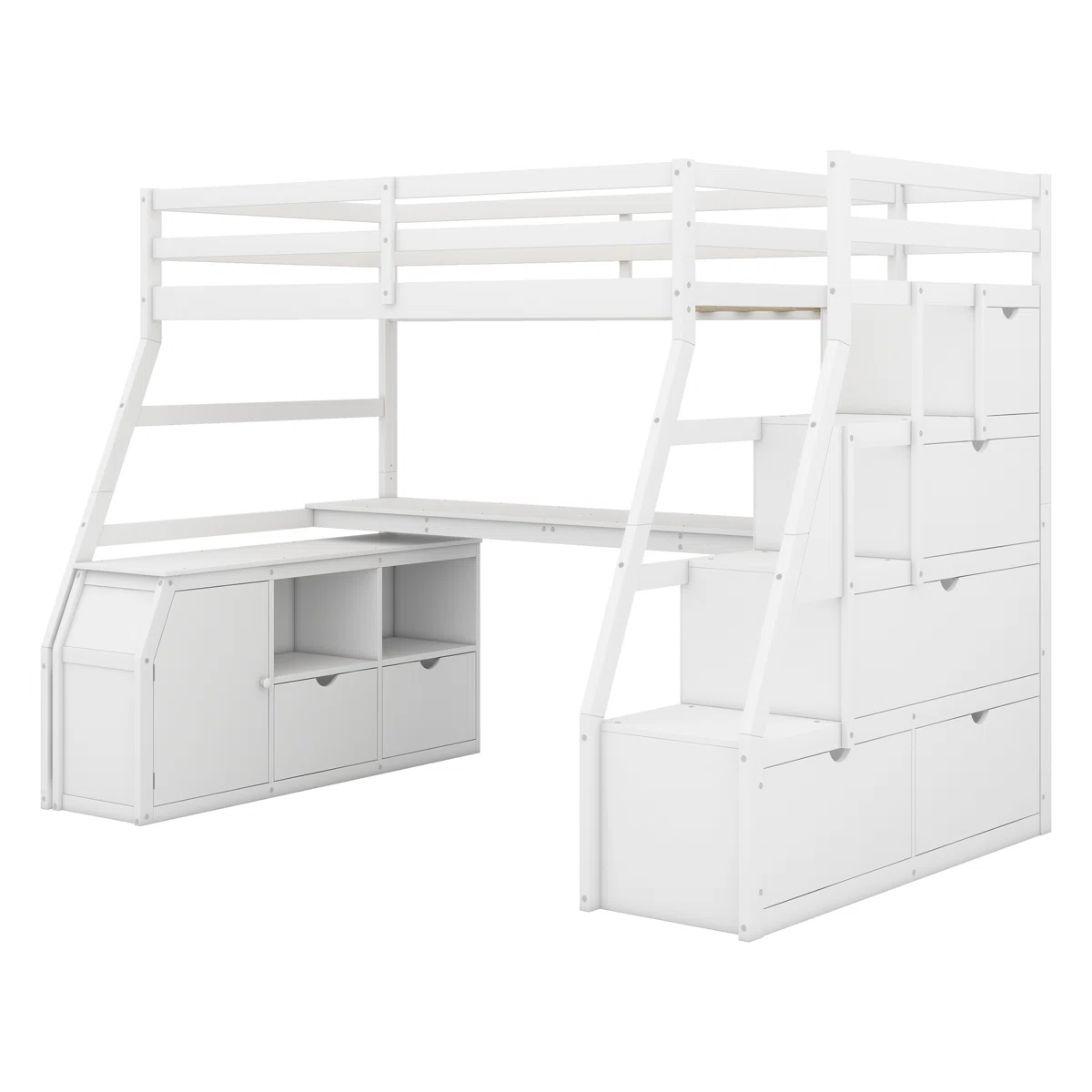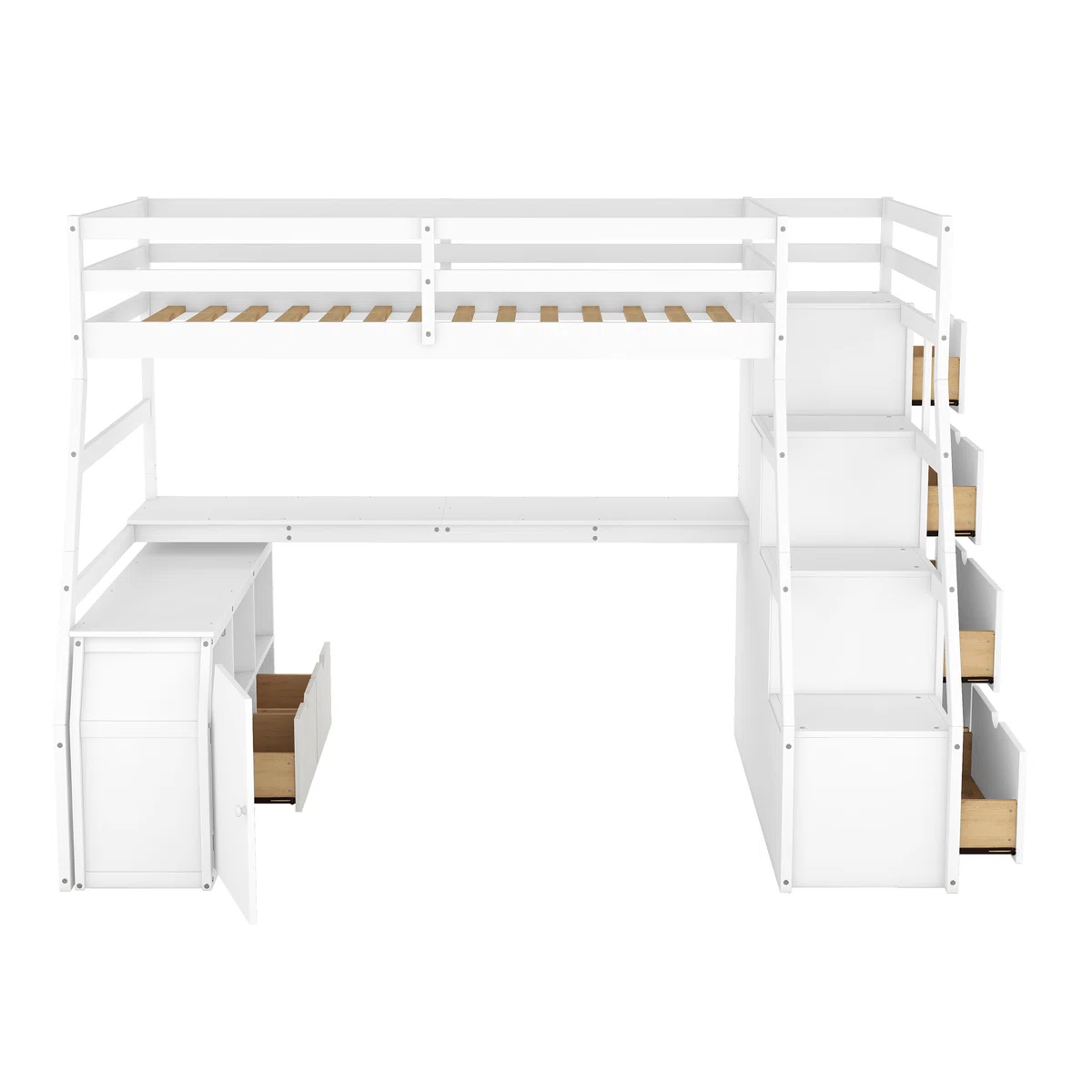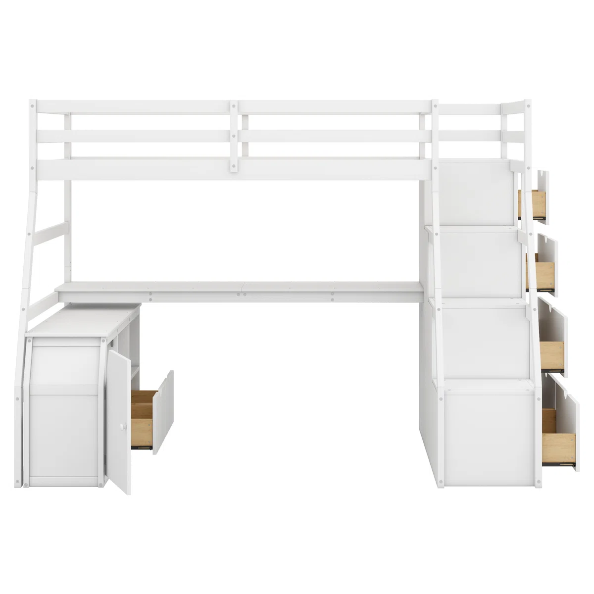 Loft bed with integrated desk, drawers, cabinet, and shelving for maximum storage and utility