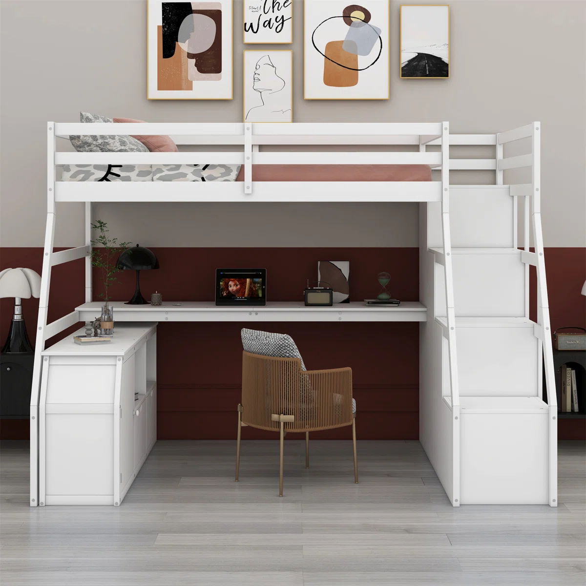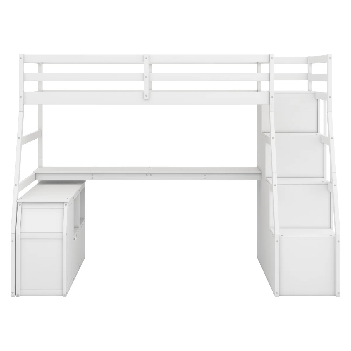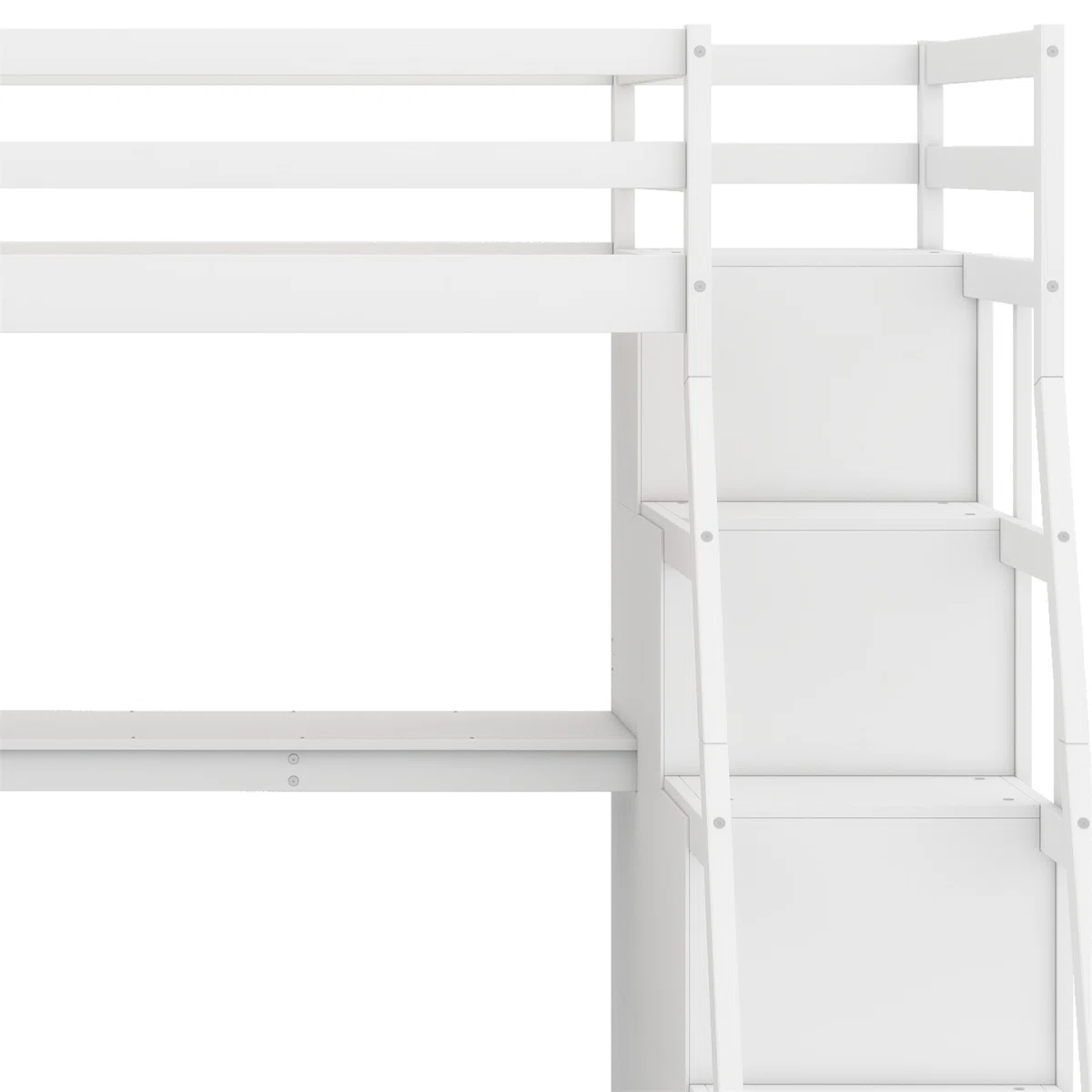 Loft bed with integrated desk, drawers, cabinet, and shelving for maximum storage and utility