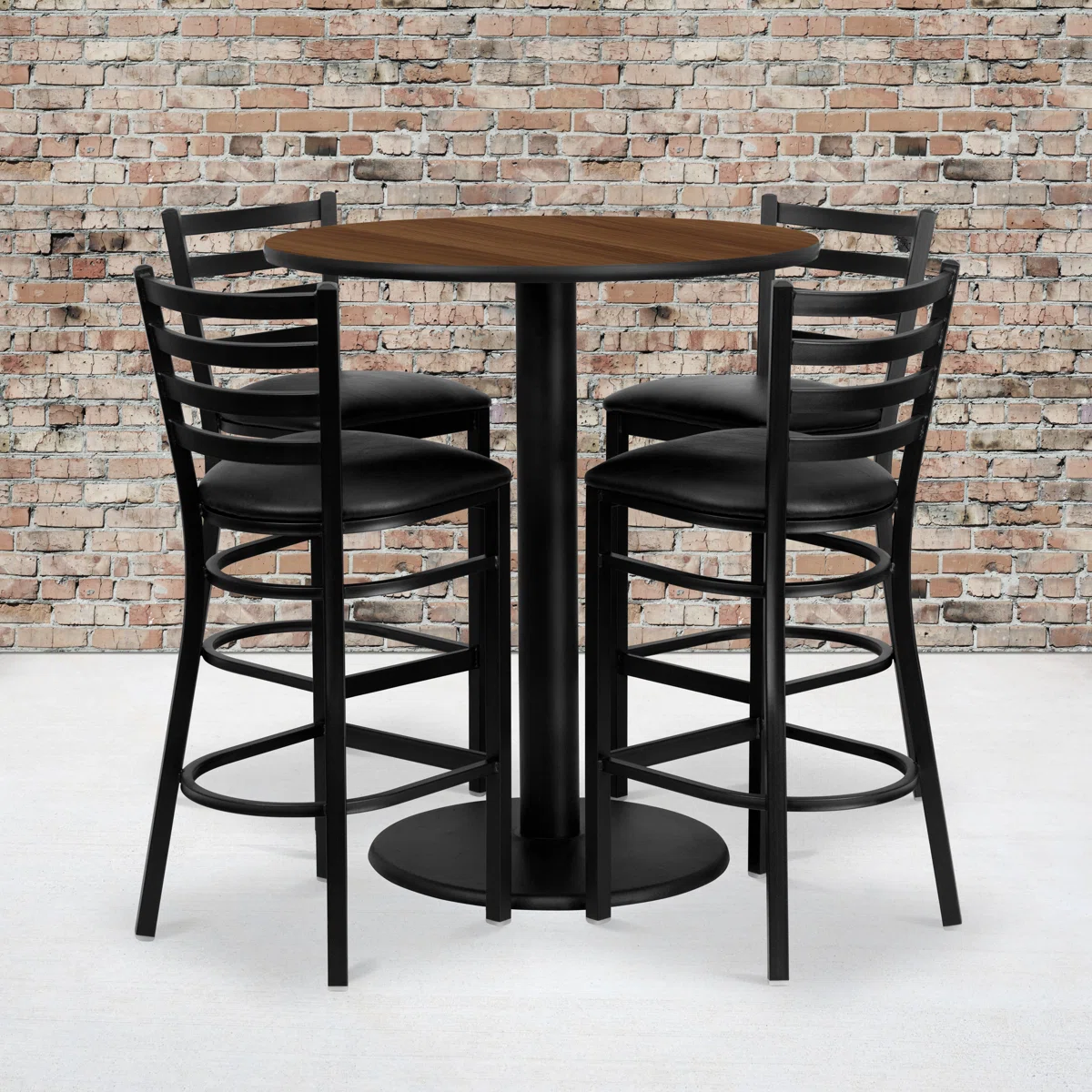 The Red Barrel Studio® Hemant 36" Round Walnut Laminate Bar Table Set combines style, durability, and convenience for home or commercial spaces. Featuring a round walnut laminate tabletop with protective T-mold edge band, paired with a cast iron pedestal base, this set includes 4 metal ladder back barstools with vinyl seats for comfortable seating. The table’s laminate surface is heat, scratch, and moisture resistant, making it ideal for restaurants, sports bars, banquet halls, or breakrooms. Easy to assemble, this bar-height set elevates any dining or entertainment area while ensuring long-lasting performance. Please note that sets may be missing pieces or otherwise incomplete.