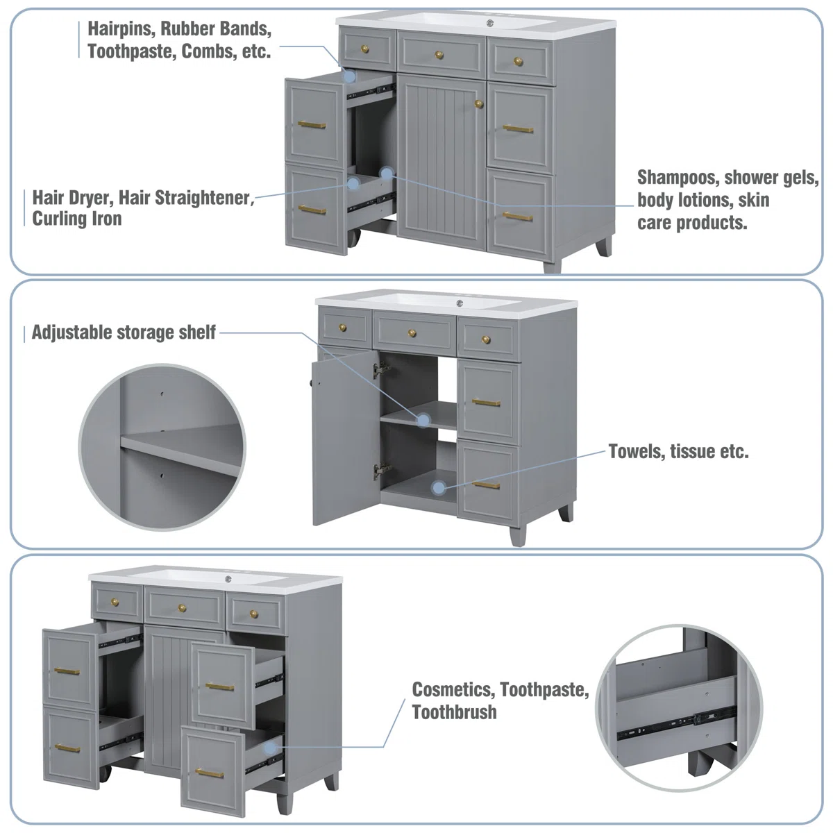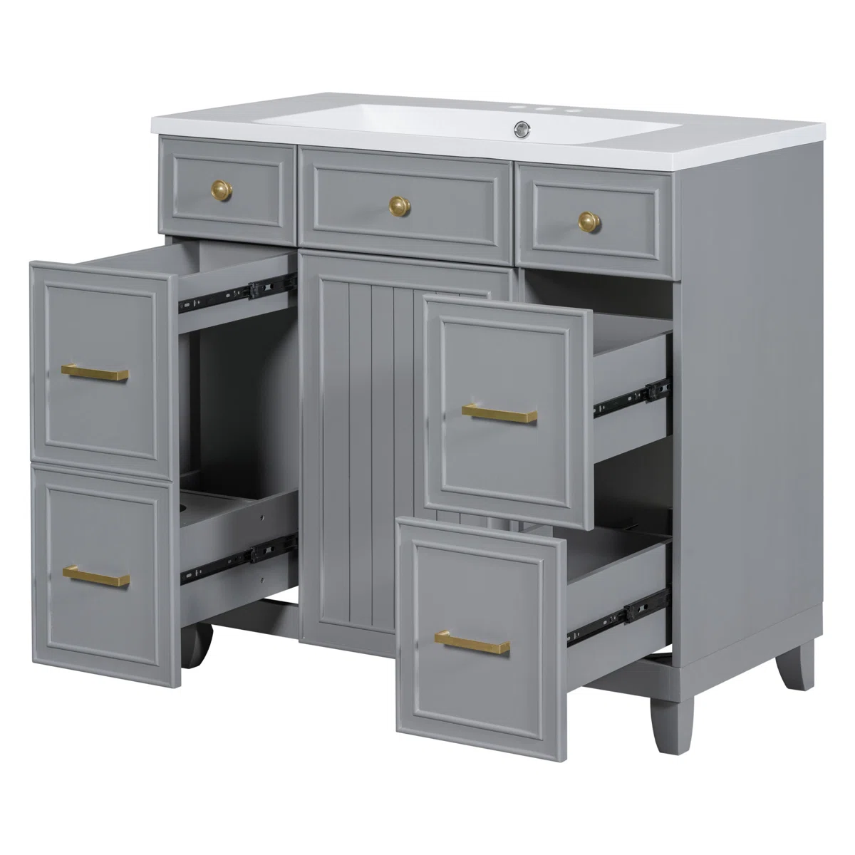 Designed with practicality in mind, the vanity offers a double-decker drawer on the left, two right-side drawers, and a center cabinet equipped with soft-close hinges and an adjustable shelf. Its 36" width provides generous counter space and storage capacity, making it ideal for organizing daily essentials while enhancing your bathroom's aesthetic.
