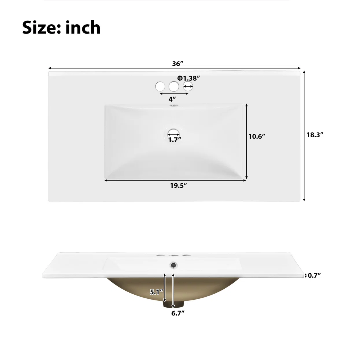 • Countertop dimensions: 36" W x 17.5" D; basin: 13.2" W x 23" L x 4.7" D