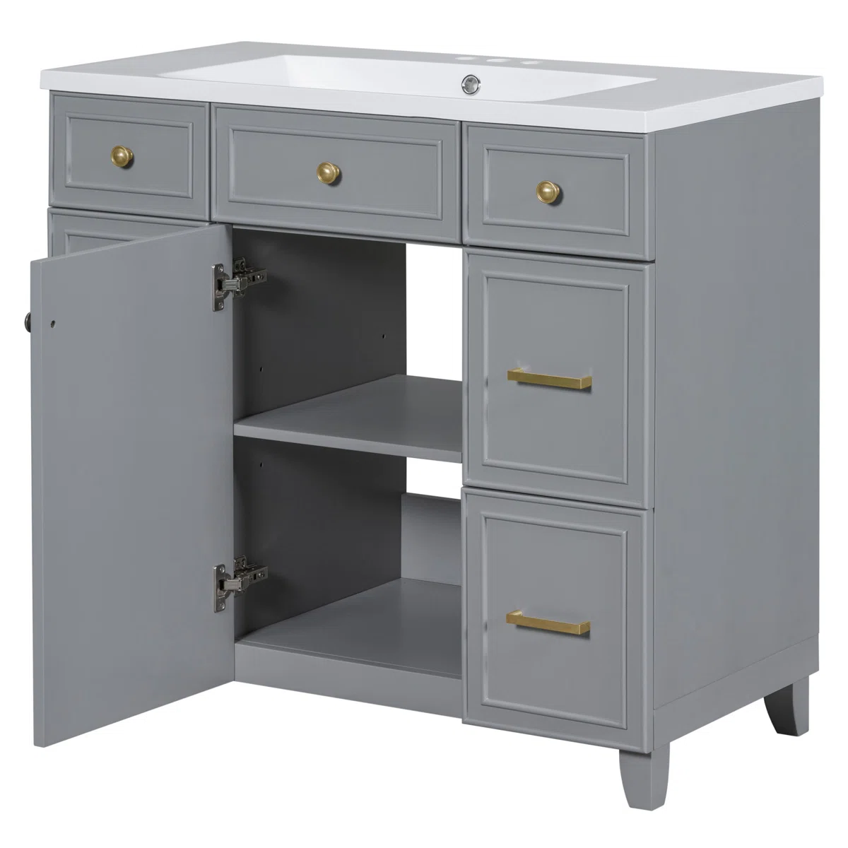 This 36" Single Bathroom Vanity by House of Hampton® blends modern elegance with functional storage, making it a standout upgrade for any bathroom. Built from solid and engineered wood, the vanity base features a sophisticated gray finish complemented by brushed gold hardware for a luxurious touch. The classic shaker-style design provides timeless appeal, while a ceramic white countertop and an undermount resin sink complete the clean, polished look.