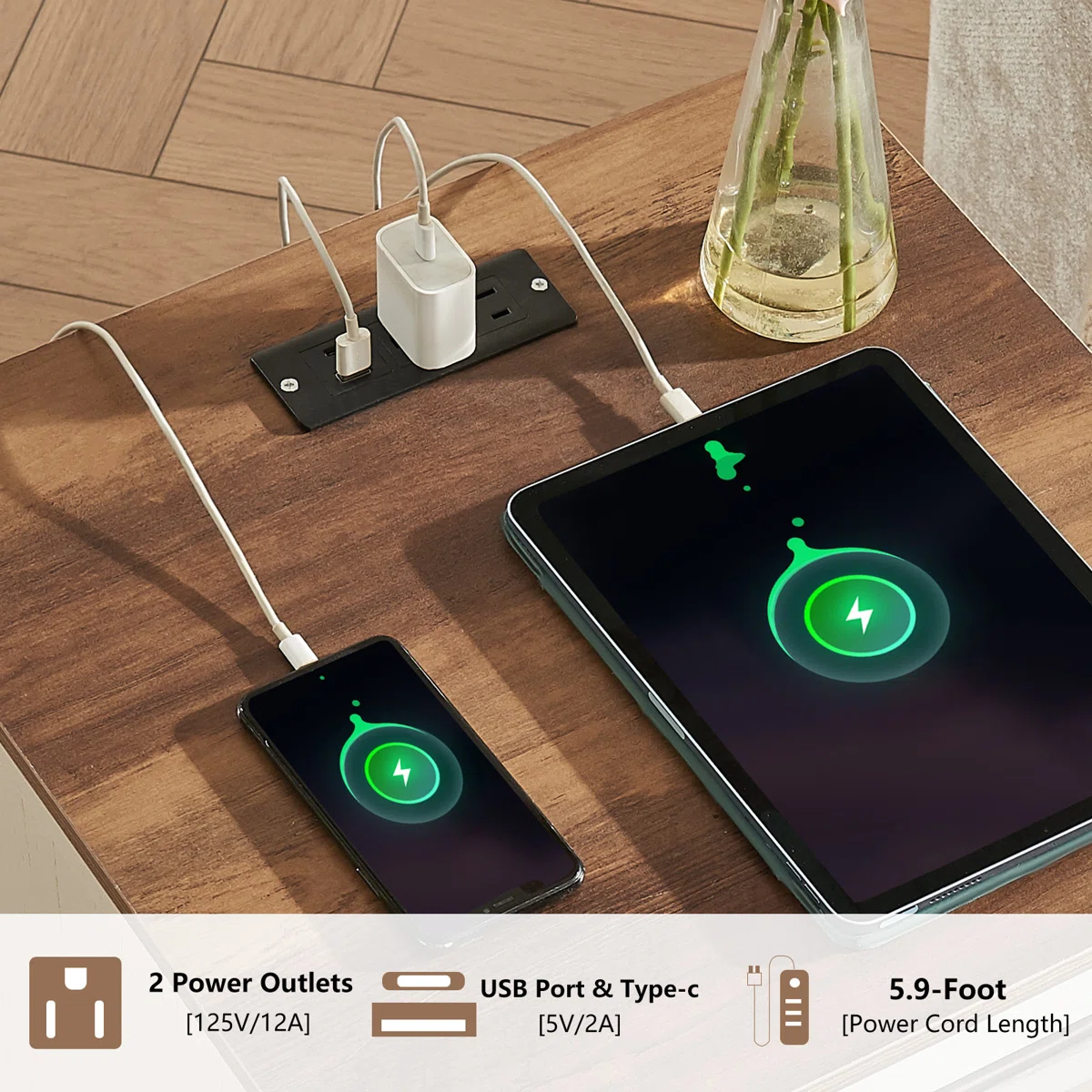 Equipped with a built-in charging station, it includes 2 standard AC outlets, 1 USB port, and 1 Type-C port, allowing you to charge phones, tablets, or laptops effortlessly while keeping your cords organized through a rear cable management hole.